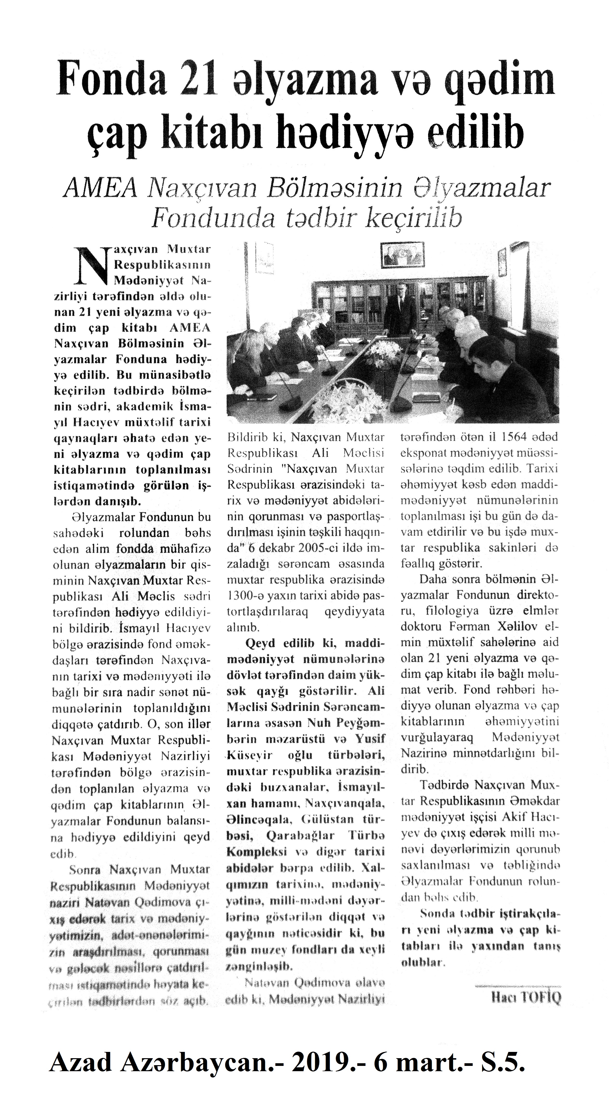 TARİX VƏ MƏDƏNİYYƏT ABİDƏLƏRİ 205. Bürcəliyev, A.M. Gəncəni gözəlləşdirən Şah Abbas və Uğurlu xan karvansaraları //Mədəniyyət.- 2019.- 15 mart.- S.6. 206. Cəbiyev, Q.C. Qəbələ – 2500 yaşlı paytaxt şəhərimiz //Azərbaycan.-2019.-7 mart.- S.11. 207. Əbdül, H. “Bu təmirdən sonra məscidimiz 100 il ayaqda dayana biləcək”: [“Tövbə” cəmiyyətinin sədri Hacı Əbdüllə müsahibə] /müsahibəni apardı Vüsal Tağıbəyli //Həftə içi.- 2019.- 13 mart.- S.3. 208. “Leylatəpə arxeoloji mədəniyyətinin keramikası”: [dosent Anar Ağalarzadənin eyniadlı monoqrafiyası haqqında] //Mədəniyyət.- 2019.-15 mart.- S.6. 209. Rəcəbli, Ə.Ə. Bilgə Xaqanın abidəsi: Qədim türk ənənələri //Kredo.-2019.- 20 mart.- S.4. 210. Seyidzadə, T. Fonda 21 əlyazma və qədim çap kitabı hədiyyə edilib: AMEA Naxçıvan bölməsinin Əlyazmalar fondunda tədbir keçirilib //Azad Azərbaycan.-2019.- 6 mart.- S.5. 211. Yusifoğlu, Q. Əliyanlı mahalının tarixi irsi və maddi abidələri: Yazılı və memarlıq nümunələrinin “erməniləşdirilməsi” əsrlər boyunca mənfur düşmənlərin hədəfində olmuşdur: [Qədim Zəngəzur qəzasının tərkib hissəsinə daxil olan Əliyanlı mahalı haqqında] //Kaspi.-2019.- 28 mart - S.15.
