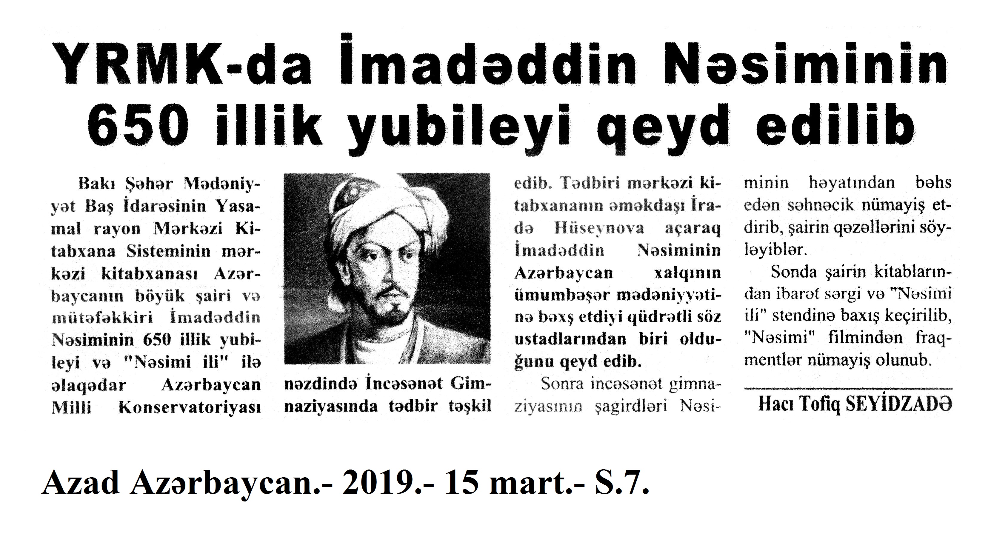 Bax: 30; 67; 72; 79; 87; 88; 365; 412 2019-cu il – “Nəsimi ili” 737. Alim. Nəsiminin türk ədəbiyyatına təsiri misilsizdir: İmadəddin Nəsiminin 650 illik yubileyinə həsr olunmuş konfrans keçiriıib: [“İmadəddin Nəsimi və özbək ədəbiyyatı” adlı konfrans haqqında] //Olaylar.- 2019.- 29 mart.- S.10. 738. Aran, S. Seyid İmadəddin Nəsimi – əbədiyyət üfüqündə doğan günəş: Cümlə-cahana sığmayan haqq şairi, haqqın şairi //Ədəbiyyat qəzeti.- 2019.- 16 mart.- S. 24. 739. Aruz, S. İmaməddin Nəsimi: Qərbin inkişafında humanist düşüncənin təsiri: Üçüncü yazı //Ədəbiyyat qəzeti.- 2019.- 8 mart.- S. 27. 740. Aruz, S. Nəsiminin İran divanı üzərinə bir baxış: [İİR-n milli arxivində şairin əldə edilən divanı haqqında] //Respublika.- 2019.- 30 mart.- S.6. 741. Bakıda “İmadəddin Nəsimi və özbək ədəbiyyatı” mövzusunda konfrans keçirilib: [“Kaspi” qəzeti, “Kaspi” Təhsil Şirkəti və Özbəkistandakı Heydər Əliyev adına Mədəniyyət Mərkəzinin birgə təşkilatçılığı ilə] //Azərbaycan.- 2019.- 29 mart.- S.4. 742. Bayramlı, M. “Bakıda “İmadəddin Nəsimi və özbək ədəbiyyatı” mövzusunda konfrans keçirilib: [Beynəlxalq Mətbuat Mərkəzində] //Yeni Azərbaycan.- 2019.- 29 mart.-S.5. 743. Bünyadzadə, K. Hərflərdən “Ənəl`Həqq”ə: düşüncələr labirintindən çıxış: [şairin yaradıcılığı haqqında] //525-ci qəzet.- 2019.- 16 mart.- S.18;24. 744. Əflatun, E. İmadəddin Nəsimi yaradıcılığında aşıq obrazı //Kredo.- 2019.- 20 mart.- S.6. 745. Əliyeva, N. Ədəbiyyat tarixinin bahar nəsimi: İmadəddin Nəsimi – 650 //Azərbaycan.-2019.- 29 mart.- S.5. 746. Fərəcov, S. “İmadəddin Nəsimi və özbək ədəbiyyatı”: Beynəlxalq elmi konfransda maraqlı məruzələr dinlənildi: [Beynəlxalq Mətbuat Mərkəzində] //Mədəniyyət.- 2019.- 29 mart.- S. 3. 747. Fərəcova, Z. Ankara və İstanbul şəhərlərində böyük Azərbaycan şairi İmadəddin Nəsiminin 650 illik yubiley tədbirləri keçirilir: [Mədəniyyət Nazirliyi, TÜRKSOY və Azərbaycan Milli Kitabxanasının birgə təşkilatçılığı ilə] //Azərbaycan.- 2019.- 7 mart.- S.11. 748. Hacıyeva, A. Nəsimi haqqında metodik vəsait: [M.F.Axundov adına Azərbaycan Milli Kitabxanasının yeni nəşri haqqında] //Hürriyyət.-2019.- 13 mart.- S.13. 749. Heydərli, İ. Nəsiminin yallısı: [hurufi şairin yaradıcılığının təhlili haqqında] //Ədəbiyyat qəzeti.- 2019.- 16 mart.- S.9. 750. Hindistan universitetində Nəsiminin yubileyi //Mədəniyyət.- 2019.- 6 mart.- S.8. 751. Hüseynov, R. Nəsiminin “muğamatam!” deyə bilmək haqqı //525-ci qəzet.- 2019.- 2 mart.- S.16-17. 752. İsmayılqızı, X. “Nəsimi ili”: Azərbaycanın zəngin tarixi – mədəni irsinin təbliğinə böyük töhfə //İki sahil.- 2019.- 16 mart.- S.13. 753. Kərimli, T.; Quliyev, V. Dahiyə dirilik bəxş edən Dahi: [Nəsimi irsinin öyrənilməsi haqqında] //525-ci qəzet.- 2019.- 7 mart.- S.4. 754. Mehdizadə, Ş. Dünyanı sözlə fəth edən şair : İmadəddin Nəsiminin 650 illik yubileyinə və “Nəsimi ili”nə həsr olunmuş konfrans keçirilib: [Beynəlxalq Mətbuat Mərkəzində] //Kaspi.-2019.- 29 mart.- S.6. 755. Muzeydə Nəsimiyə həsr olunmuş ədəbi-bədii kompozisiya: [Bülbülün memorial muzeyində tədbir] //Mədəniyyət.- 2019.- 20 mart.- S.3. 756. Müşfiq, Ş. İstanbulda “Nəsimi ili” çərçivəsində ilk tədbirlər keçirilib: [tədbir iştirakçıları Azərbaycan Milli Kitabxanasının fondunda mühafizə edilən İ.Nəsiminin əski çap əsərləri, əlyazmaları, qəzələri, divanları, eləcə də xarici dillərdə nəşr olunmuş əsərlərindən ibarət kitab sərgisi ilə tanış olublar] //525-ci qəzet.- 2019.- 12 mart.- S.7. 757. Müşfiq, Ş. Türkiyədə Nəsimi təntənələri: TÜRKSOY-un Ankaradakı qəragahında “Nəsimi ili”nin açılış mərasimi olub: [Azərbaycan Respublikası Mədəniyyət Nazirliyi, TÜRKSOY beynəlxalq təşkilatı və Azərbaycan Milli Kitabxanasının birgə təşkilatçılığı ilə] //525-ci qəzet.- 2019.- 7 mart .- S.7. 758. Nağısoylu, M. Nəsimi əsərlərinin son dövr nəşrlərinə bir baxış //Ədəbiyyat qəzeti.- 2019.- 2 mart.- S.22-23. 759. “Nəsimi ili” çərçivəsində rəsm müsabiqəsi davam edir //Mədəniyyət.-2019.- 1 mart .- S.7. 760. “Nəsimi ili” ilə bağlı şeir müsabiqəsi: [Yasamal Rayon MKS-nin Mirzə Şəfi Vazeh adına Rayon Mərkəzi Kitabxanasında] //Mədəniyyət.- 2019.- 8 mart .- S.4. 761. “Nəsimi – küfr və iman arasında”: [AMEA-nın Fəlsəfə İnstitutunda keçirilən seminarda Könül Bünyadzadənin eyniadlı məruzəsi haqqında] //Elm.- 2019.- 7 mart.- S. 6. 762. Nəsiminin 650 illiyi ölkəmizdə və xaricdə rəngarəng tədbirlərlə qeyd olunacaq //Palitra.- 2019.- 28 mart.- S.15. 763. Nəsiminin söz dünyasından bəhs edilib: [Bakı Şəhər Mədəniyyət Baş İdarəsinin M.Əliyev adına Mədəniyyət evi Hövsan Mədəniyyət sarayı ilə birlikdə keçirdikləri tədbir haqqında] //Mədəniyyət.-2019.- 6 mart.- S.6. 764. Nəsiminin yubileyinə həsr olunan elmi sessiya: [AMEA-nın Məhəmməd Füzuli adına Əlyazmalar İnstitutunda] //Mədəniyyət.- 2019.- 15 mart .- S.6. 765. Nigar. “AITF 2019” sərgisində “Tarixə və Nəsimi yaradıcılığına səyahət”: [Bakı Ekspo Mərkəzində] //Palitra.- 2019.- 29 mart.- S.10. 766. O-nurlu, P. Ölməz Nəsimini toyxanalara “sığdıran”lara cavab //Ədalət.- 2019.- 7 mart.- S.5. 767. Paşayev, Q. Məhəbbətdən doğan əsər: [Xalq şairi Qabilin “Nəsimi” poeması haqqında] //525-ci qəzet.- 2019.- 5 mart.- S. 6. 768. Serbiyada “Nəsimi medalı” təsis edildi //Ədalət.- 2019.- 1 mart.- S. 4. 769. Seyidzadə, T. YRMK-da İmadəddin Nəsiminin 650 illik yubileyi qeyd edilib: [Yasamal Rayon Mərkəzi Kitabxanasında] //Aza