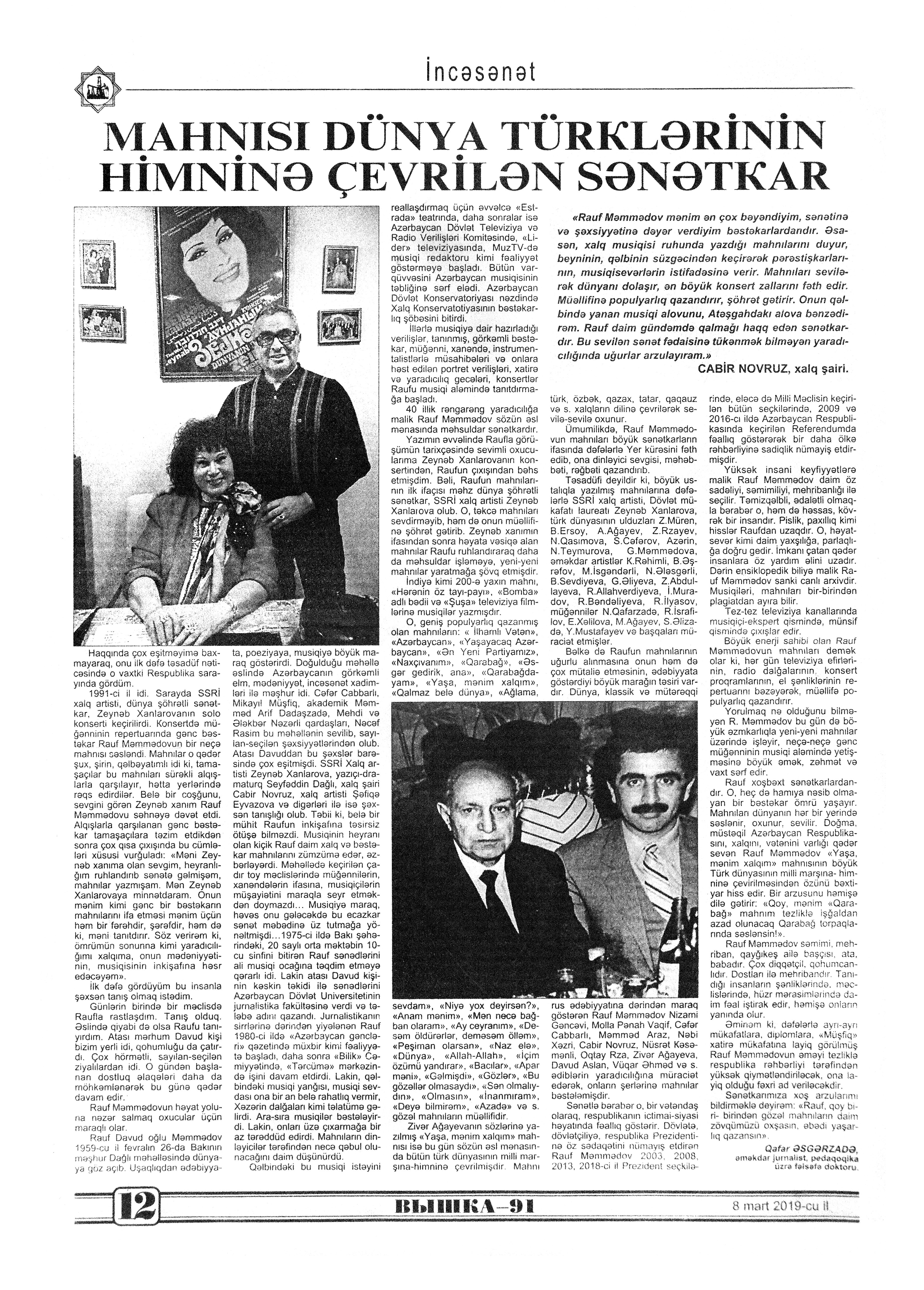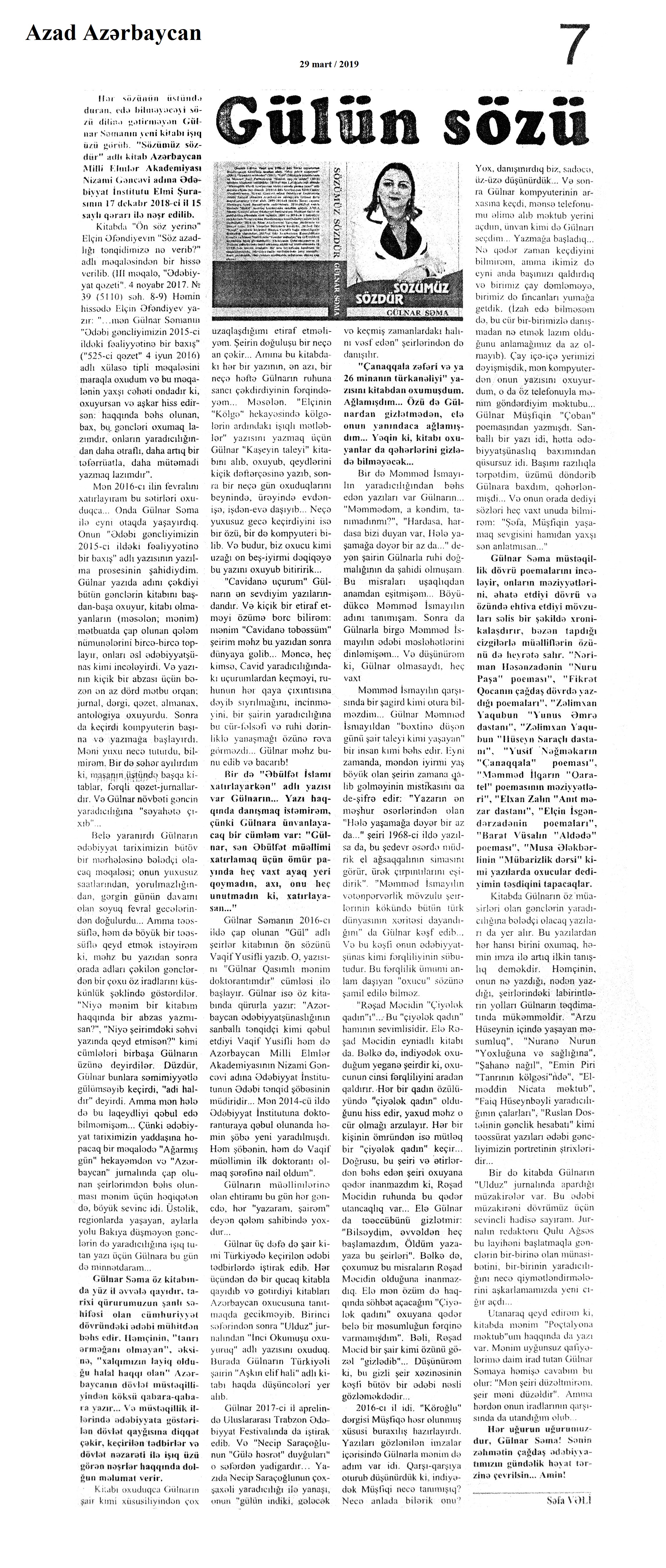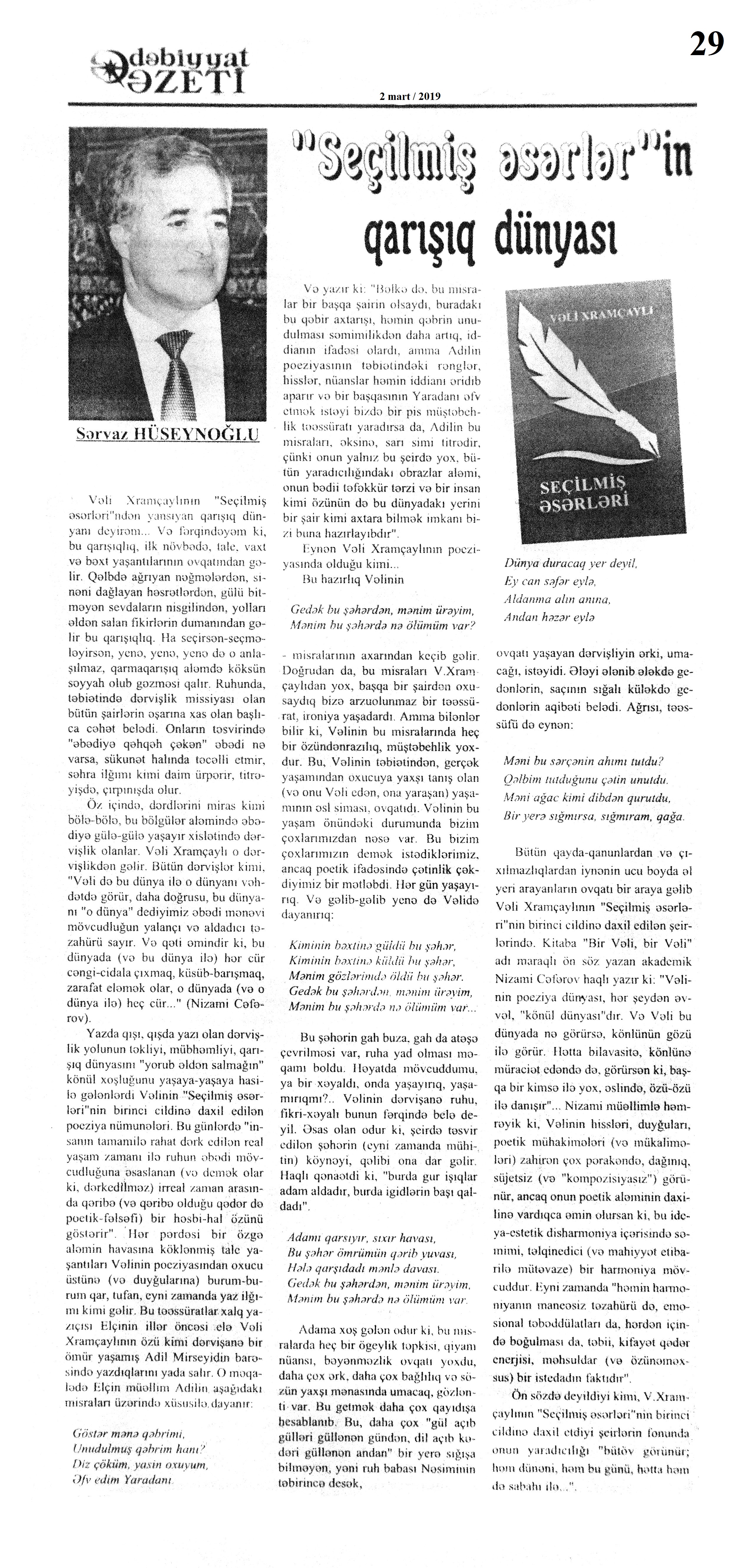 ESSELƏR 520. Abdulla, K. Əvvəl-axır yazılanlar //Ədəbiyyat qəzeti.- 2019.- 8 mart.- S. 7. 521. Əliyeva, M. Amansız müharibə və oğlunu tanımayan ana //Mədəniyyət.- 2019.- 13 mart.- S.7. 522. Fərzəli, N. Unudulmuş quru gül //Ədəbiyyat qəzeti.- 2019.- 8 mart.- S.28. 523. Hüseynxan, Ə. Son yaş günü //Kredo.- 2019.- 14 mart.- S.11. 524. Kamil, İ. Fon və fiqura... //525-ci qəzet.- 2019.- 16 mart.- S. 24. 525. Mehdi, Q. Son verdim: Sən olmasaydıın...; Arxayın ola bilərsən...; Bəs nədən... //Ədalət.- 2019.- 8 mart.- S.11. 526. Pərvin. Fuad Axundov və Yeddi gözəllə şam yeməyi //525-ci qəzet.- 2019.- 8 mart.- S.15. 527. Pərvin. İsfəndiyar Vahabzadəyə //525-ci qəzet.- 2019.- 16 mart.- S.15. 528. Turan, T. İspanaq //Ədəbiyyat qəzeti.- 2019.- 2 mart.- S. 27. 529. Vahid, M. İntermedial fenomen: vizual poeziya: Səlim Babullaoğlunun şeirləri əsasında //525-ci qəzet.- 2019.- 2 mart.- S. 19; 24.