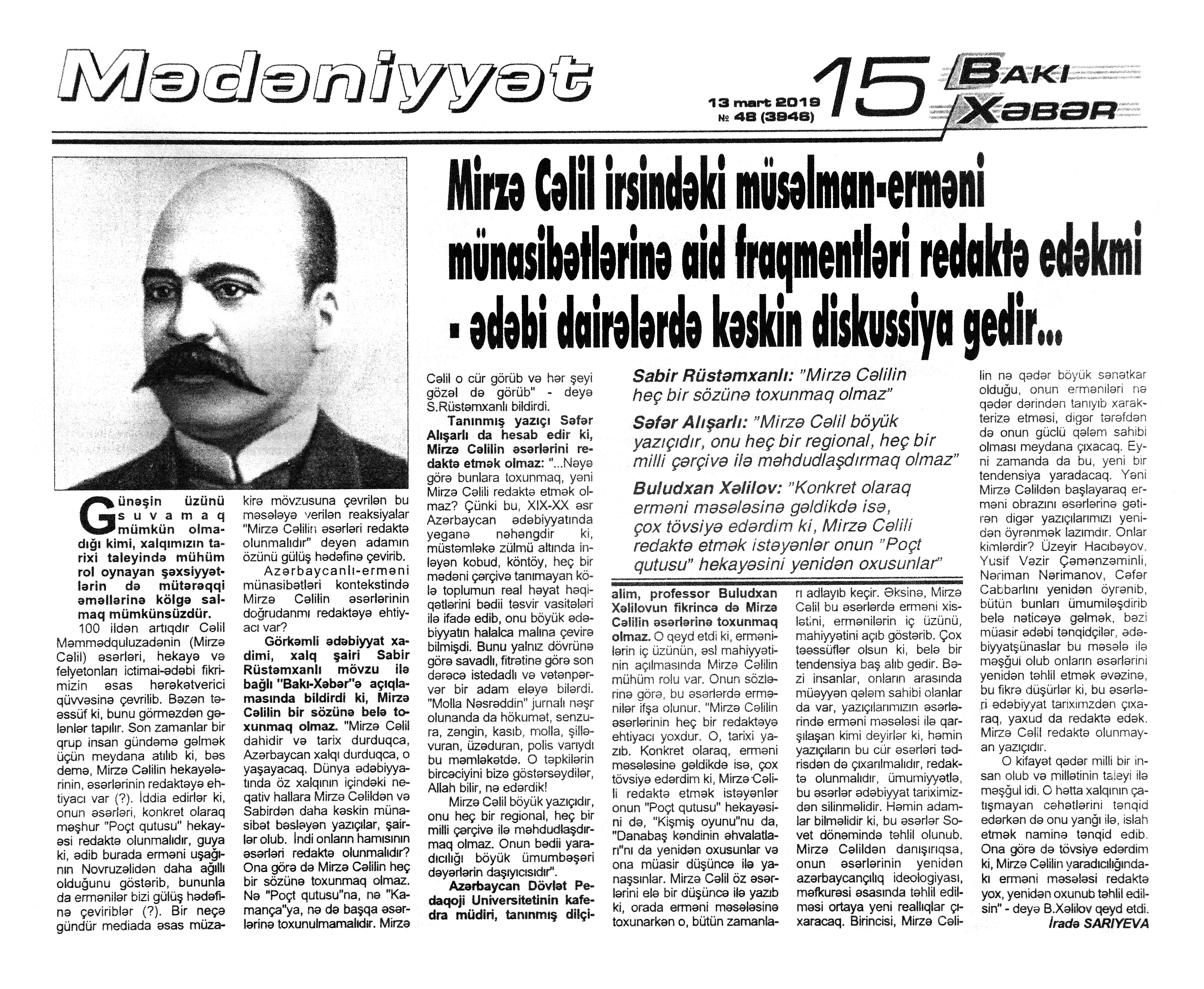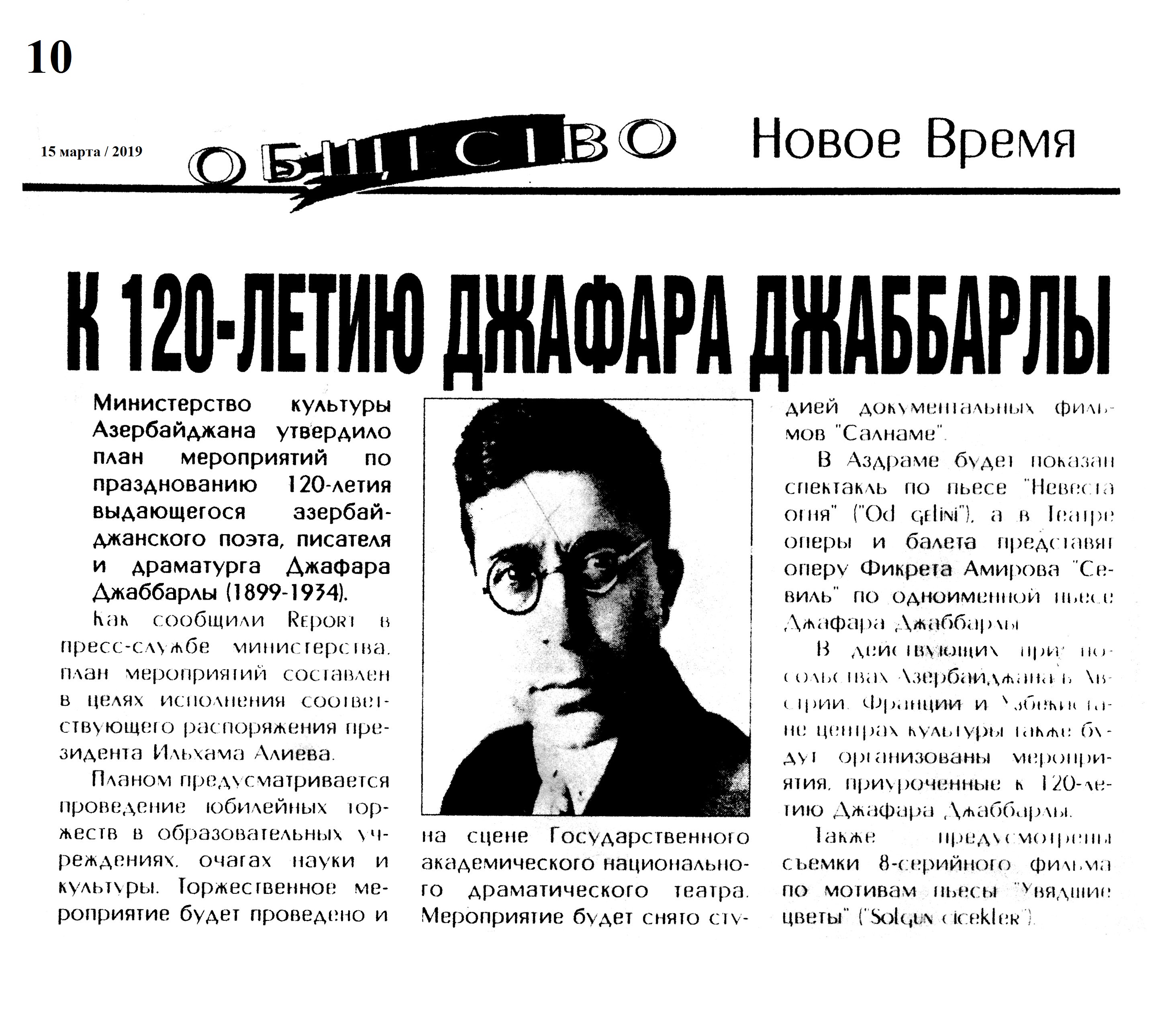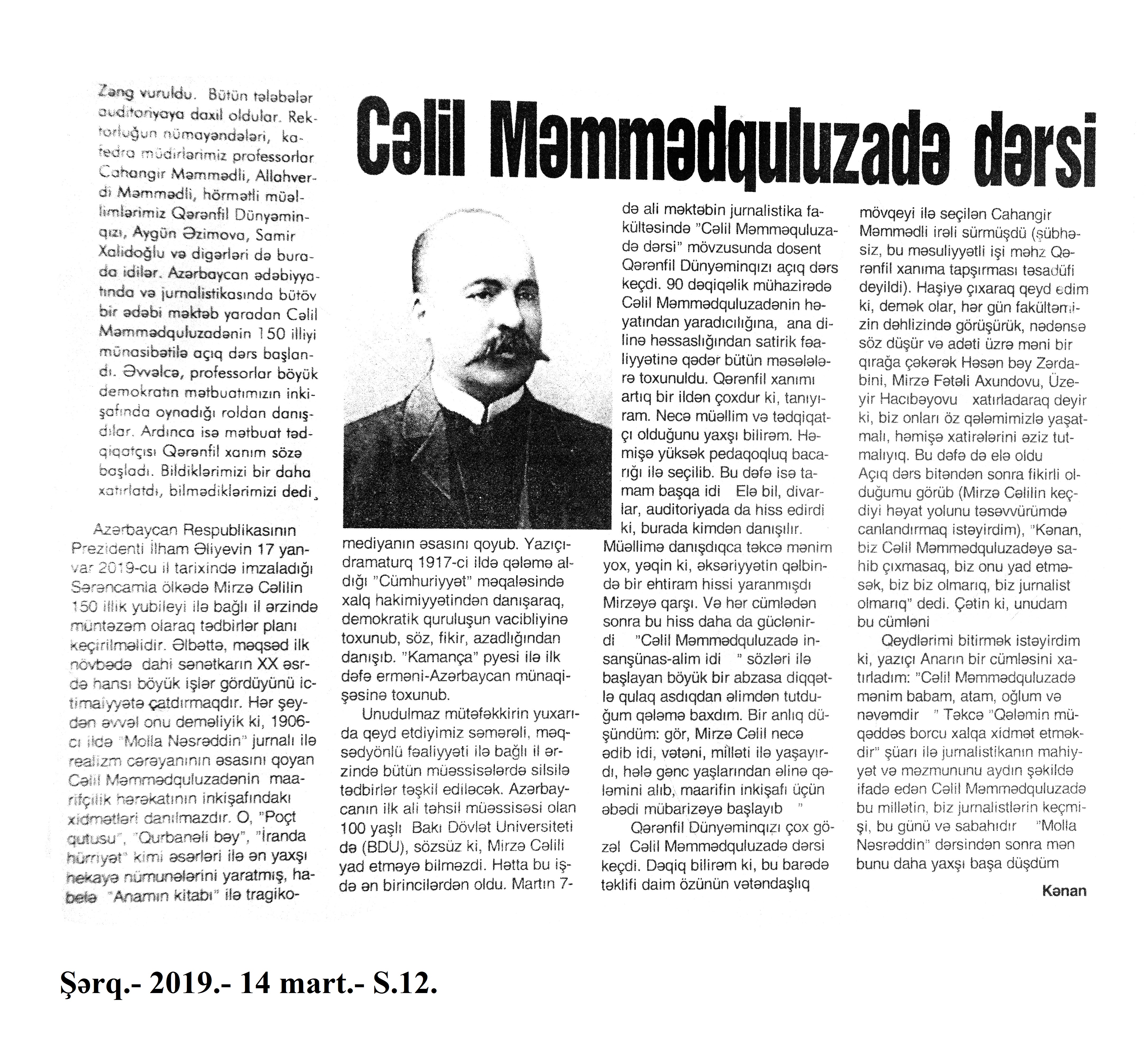 Bax: 489 Cəlil Məmmədquluzadə – 150 774. Aleksayte, İ. Mirzə Cəlilin hekayələri ilə Litva müəlliflərinin yaradıcılığındakı tipoloji paralellər /Litva dilindən tərc.etdi Mahir Həmzəyev //Ədəbiyyat qəzeti.- 2019.- 8 mart.- S.26. 775. Aydınoğlu, T. Azərbaycançılığın bədii-publisistik əsaslarını yaratmış mütəfəkkir yazıçı: Cəlil Məmmədquluzadə – 150: [AMEA-nın Nizami adına Ədəbiyyat İnstitutunda keçirilən tədbir haqqında] //Xalq qəzeti.-2019.- 8 mart.- S.15. 776. Babayeva, G. Mirzə Cəlilin “İranda hürriyyət” hekayəsi: mütləqiyyətdən istiqlaliyyətə: [yazıçının eyniadlı hekayəsi haqqında] //525-ci qəzet.-2019.- 15 mart .- S.6. 777. Binnətova, A.; Qasımbəyli, Y. Mirzə Cəlil və Özbəkistan ədəbi-mədəni mühiti: Daşkənddə görkəmli ədibin kitabı nəfis tərtibatla nəşr olunub //Kaspi.- 2019.- 13 mart.- S.15. 778. Binnətova, A.; Qasımbəyli, Y. Mirzə Cəlil və Özbəkistan ədəbi-mədəni mühiti: Daşkənddə görkəmli ədibin kitabı nəfis tərtibatla nəşr olunub //Kaspi.-2019.- 14 mart.- S.15. 779. Cavid, R. Mirzə Cəlilin sevdası: Romandan parça //525-ci qəzet.- 2019.- 30 mart.- S.22. 780. Cəlil, M. Zırrama: Hekayə //Ədalət.- 2019.- 14 mart.- S.1;5. 781. Gənclər Kitabxanasının kollektivi Cəlil Məmmədquluzadənin xatirəsini anıb //Mədəniyyət.-2019.- 15 mart .- S.6. 782. Kənan. Cəlil Məmmədquluzadə dərsi //Şərq.- 2019.- 14 mart.- S.12. 783. Məmmədli, A. Cəlil Məmmədquluzadənin nəsri: Və ya mollanəsrəddinçilərin yaradıcılığı azərbaycançılıq kontekstində: (I məqalə) //Kaspi.- 2019.- 19 mart.- S.15. 784. Musayeva, Y. Ölümsüz eşq: Milli məfkurəmizin qoşa sərkərdəsi – Cəlil və Həmidə Məmmədquluzadələr //Azərbaycan.- 2019.- 15 mart.- S.11. 785. Musayeva, Y. Ölümsüz eşq: Milli məfkurəmizin qoşa sərkərdəsi – Cəlil və Həmidə Məmmədquluzadələr //Azərbaycan.- 2019.- 16 mart.- S.7. 786. Rzayeva, M. “Ölülər hardan bilsin ki?...: Azərbaycan tarixində Mirzə Cəlil qədər bu xalqı diriltmək istəyən ikinci bir şəxsiyyət yoxdur: [yazıçının yaradıcılığı haqqında ziyalıların müqayisəli fikirləri] //Şərq.- 2019.- 30 mart.- S.8. 787. Sarıyeva, İ. Mirzə Cəlil irsindəki müsəlman-erməni münasibətlərinə aid fraqmetləri redaktə edəkmi: “Ədəbi dairələrdə kəskin diskussiya gedir”... //Bakı Xəbər.-2019.- 13 mart.- S.15. 788. Şahanə. Cəlil Məmmədquluzadəyə həsr olunmuş elmi-nəzəri konfrans keçirilib: [Bakı Xareoqrafiya Akademiyasında “Cəlil Məmmədquluzadə və “Molla Nəsrəddin” ədəbi məktəbi” movzusunda] //525-ci qəzet.- 2019.- 30 mart.- S.16. 789. Ülvi, A.; Qasımbəyli, Y. Mirzə Cəlilin Türküstana yeni səfəri: [yazıçının yubileyi ilə əlaqədar] //525-ci qəzet.- 2019.- 12 mart .- S.6. 790. Yusifli, C. Mirzə Cəlil məqamı //Ədəbiyyat qəzeti.- 2019.- 8 mart.- S.21. Cəfər Cabbarlı – 120 791. ADPU-da tədbir: Cəfər Cabbarlı – 120 //Kredo.- 2019.- 20 mart.- S.5. 792. Cəfər Cabbarlının 120 illiyi müxtəlif tədbirlərlə qeyd olunacaq //Mədəniyyət.-2019.- 15 mart.- S.2. 793. Həmidə. “Azərbaycan incəsənətində Cəfər Cabbarlı fenomeni”: [Memarlıq və İncəsənət İnstitutunda eyniadlı mövzuda keçirilən elmi-praktik konfrans haqqında] //Mədəniyyət.- 2019.- 29 mart.- S.1-2. 794. Hüseynova, M. Cəfər Cabbarlı irsi: yaradıcılıqda üslub xüsusiyyətləri //525-ci qəzet.- 2019.- 19 mart.- S.6. 795. Xızıda Cəfər Cabbarlının abidəsi önündə tədbir keçirilib //Mədəniyyət.- 2019.- 20 mart.- S.3. 796. Qədirova, A. Mədəniyyətimizin susmaz duyğusu //525.-ci qəzet.- 2019.- 30 mart.- S.18. 797. Mədətov, F. “Axır səni buldum, ey Dan ulduzu”: Cəfər Cabbarlının şeir yaradıcılığında Xalq Cümhuriyyəti //Ədəbiyyat qəzeti.- 2019.- 16 mart.- S.17. 798. “Mən bir sönməz ulduzam ki...”: [Bakı Xoreoqrafiya Akademiyasında eyniadlı elmi-praktik konfransın keçirilməsi haqqında] Mədəniyyət.- 2019.- 8 mart .- S.4. 799. Nigar. ADPU-da Cəfər Cabbarlının 120 illik yubiley tədbiri //Palitra.- 2019.- 15 mart.- S.12. 800. Novruz bayramı münasibətilə Milli Kitabxanada sərgi: [“Cəfər Cabbarlı – 120”, “İsmayıl Şıxlı – 100”, “Mehdi Hüseyn – 110” və “Zeynal Xəlil – 105” adlı geniş kitab sərgilərinin açılışı haqqında] //Xalq cəbhəsi.- 2019.- 20-27 mart.- S.16. 801. Regional idarənin müəssisələrində tədbirlər: [Sumqayıt Şəhər Nizami Gəncəvi adına kitabxana-klubda “Cəfər Cabbarlı və maarifçilik” mövzusunda keçirilən dəyirmi masa haqqında] //Mədəniyyət.- 2019.-1 mart.- S.3. 802. Şahanə. Milli Kitabxanada yeni sərgilər: [Novruz bayramı münasibətilə “Cəfər Cabbarlı – 120”, “İsmayıl Şıxlı – 100”, “Mehdi Hüseyn – 110” və “Zeynal Xəlil – 105” adlı geniş kitab sərgilərinin açılışı haqqında] //525-ci qəzet.- 2019.- 20 mart.- S.24. Həmid Araslı – 110 803. Akademik Həmid Araslının 110 illik yubileyi Ədəbiyyat İnstitutunda qeyd olunub //Ədəbiyyat qəzeti.- 2019.- 2 mart.- S.8. 804. Baxşəliyeva, G. Azərbaycan və Şərq ədəbiyyatlarının yorulmaz tədqiqatçısı, fədakar elm təşkilatçısı //Ədəbiyyat qəzeti.- 2019.- 8 mart.- S.14-15. 805. Kərimov, P. Akademik Həmid Araslı görkəmli mətnşünas alim kimi: Həmid Araslı – 110 //525-ci qəzet.- 2019.- 2 mart.- S.23. 806. Paşayev, Q. Klassik və şifahi xalq ədəbiyyatımızın misilsiz tədqiqatçısı //Ədəbiyyat qəzeti.- 2019.- 2 mart.- S.8-9. İsmayıl Şıxlı – 100 807. Ağabalayeva, S. Kür meydanı ram eləmək: Xalq yazıçısı İsmayıl Şıxlının 100 illiyinə / //525-ci qəzet.- 2019.- 20 mart.- S.16;19. 808. Kürdəmirdə İsmayıl Şıxlının 100 illiyi qeyd edilib //525-ci qəzet.- 2019.- 15 mart.- S.7. 809. Mustafay