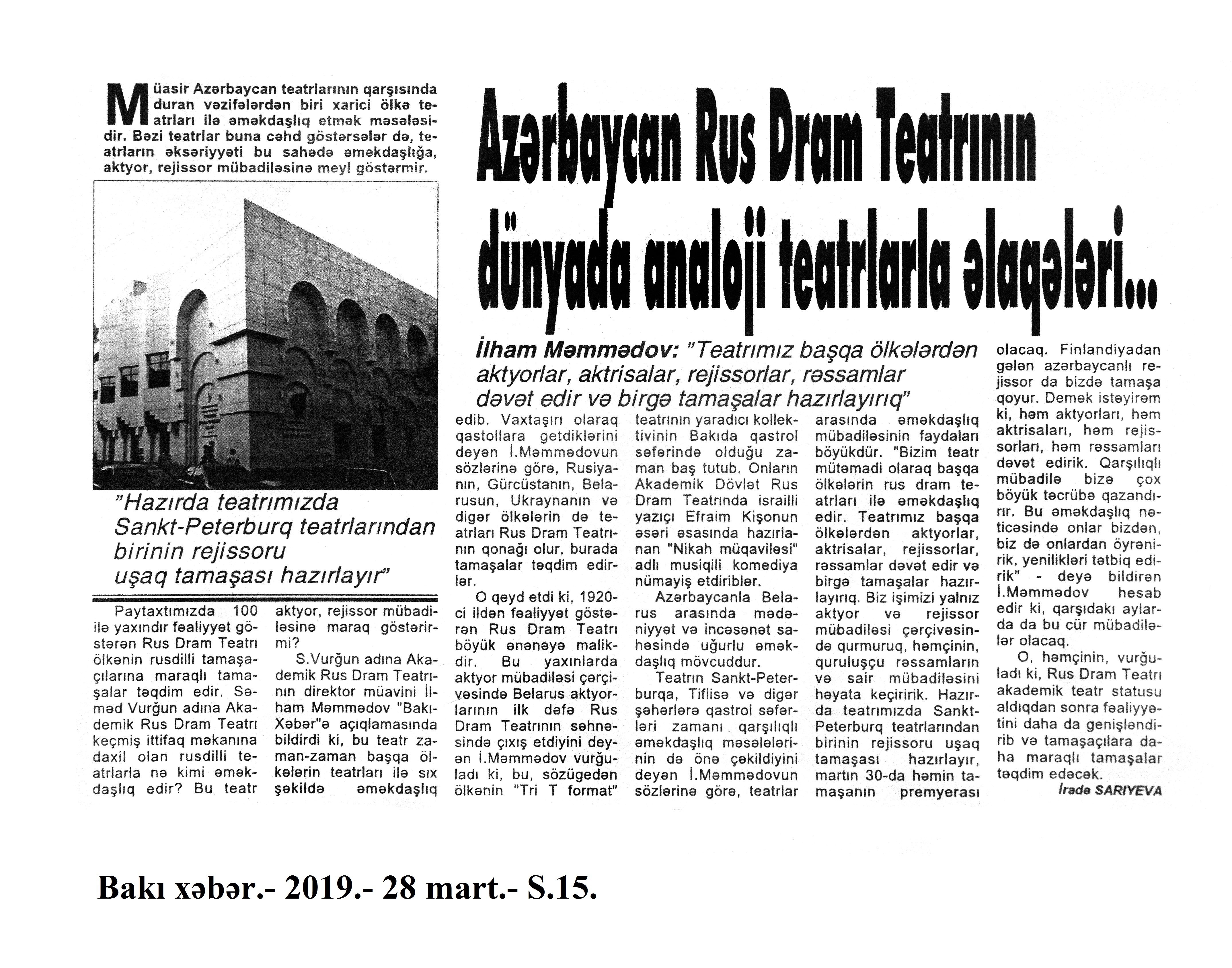 Azərbaycan Dövlət Akademik Opera və Balet Teatrı 422. Azəri, L. Belqrad səhnəsindən təəssüratlar: [teatrın çıxışı haqqında] //Mədəniyyət.-2019.- 6 mart.- S.8. Azərbaycan Dövlət Gənc Tamaşaçılar Teatrı 423. Meydanova, X. “Teatrdan uzaq qalanda özümü tək hiss edirəm”: [aktrisa Xəyalə Meydanova ilə müsahibə] /müsahibəni apardı Könül Oruc //Üç nöqtə.-2019.- 7 mart.- S.9. 424. Müşfiq, Ş. “Sabaha qədər - Öpürəm. Oskar”: [Əməkdar artist Nicat Kazımovun hazırladığı “Tanrıya 14 məktub” adlı tamaşanın nümayişi haqqında] //525-ci qəzet.-2019.- 28 mart.- S.7. 425. Nəzrin. Pərvindən yeni səhnə əsəri: Gənc Tamaşaçılar Teatrı yeni mono-tamaşa hazırlanıb: [Ayla Osmanovanın “Mən öləndə ağlama” tamaşasının nümayişi haqqında] //525-ci qəzet.-2019.- 28 mart.- S.8. 426. Nəzrin. Tariyel Qasımovun 80 illik yubileyi keçiriləcək: [teatrda Xalq artistinin yubileyi ilə əlaqədar keçiriləcək tədbir haqqında] //525-ci qəzet.- 2019.- 15 mart.- S. 7.