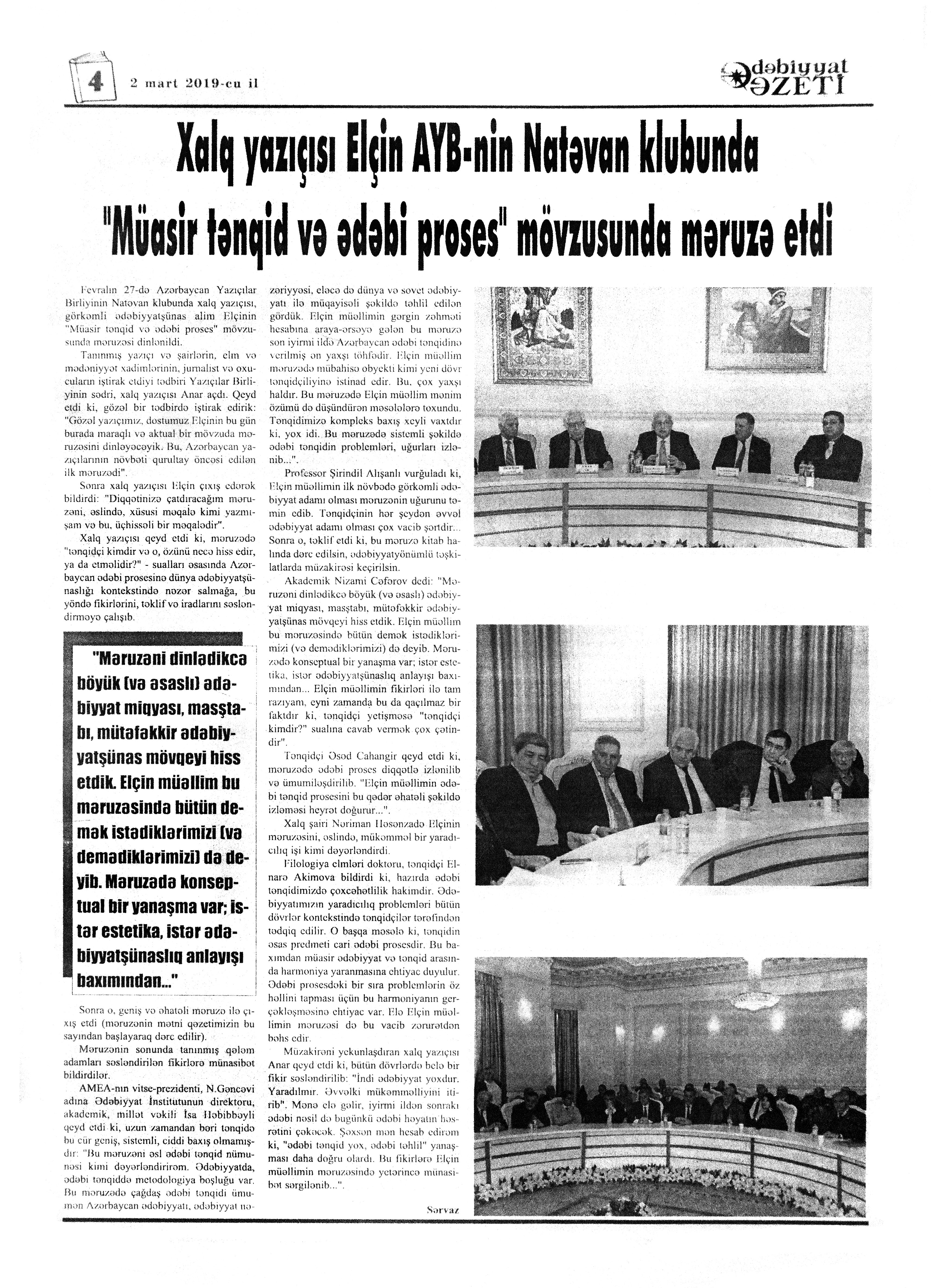 Dəniz, Mikayıl Müşfiq və nida işarəsi... 541. Akimova, E. Servantes, Borxes və Günel Şamilqızının “Qəhrəman”ı //Ədəbiyyat qəzeti.- 2019.- 16 mart.- S.12-13. 542. Altaylı, S. Həsənoğlunun “Sirət-in Nəbi” adlı məsnəvisində lirik haşiyələr, yaxud Həsənoğlunun iki yeni qəzəli: [XIII əsrin məşhur şairi İzzəddin Əsfərayi haqqında] //Ədəbiyyat qəzeti.- 2019.- 8 mart.- S.24-25. 543. Altaylı, S. Həsənoğlunun yeni qəzəli: [XIII yüzildə yaşamış görkəmli şairimizin yaradıcılığı haqqında] //Ədalət.- 2019.- 16 mart.- S.13. 544. “Amerika türkləri” işıq üzü görüb: [Xanəmir Telmanoğlunun eyniadı kitabı haqqında] //Ədəbiyyat qəzeti.- 2019.- 16 mart.- S. 25. 545. Aras, O. Avropada Azərbaycan: [Almaniyada yaşayan türkoloq Nizaməddin Onk haqqında] //Ədəbiyyat qəzeti.- 2019.- 16 mart.- S.7. 546. Aras, O. Henrix Böll, Köln və mən: [müəllifin Almaniya təəssüratları] //Ədəbiyyat qəzeti.- 2019.- 8 mart.- S.25. 547. Aras, O. Şeir qoxusu: [şair Qəşəm Nəcəfzadə haqqında] //525-ci qəzet.- 2019.- 30 mart.- S.16. 548. Aslan, Ş. Tanrının imtahanından üzüağ çıxmaq...: [gənc yazarın düşüncələri] //525-ci qəzet.-2019.- 15 mart .- S.7. 549. Aslan, V. Tanrıya və sevdiyi adamlara sığınan şair: Əbülfət Mədətoğlu – 60 //Ədəbiyyat qəzeti.- 2019.- 2 mart.- S.18. 550. Aytel, İ. Üçtərəfli dünya: [şair Ramiz Rövşənin yaradıcılığı haqqında] //Kaspi.- 2019.-30 mart.- S.14. 551. Ayvaz, O. Xatirələrin xöşbəxt güşəsi: [müəllifin mövzu ətrafında fikirləri] //Ədəbiyyat qəzeti.- 2019.- 8 mart.- S.32. 552. Azər, A. Yazıçı azad olmalıdır: Alpay Azər: Demək olar ki, bütün hekayələrimdə bu cür avtobioqrafik detallar var /müsahibəni apardı Aytac Quliyeva //Kaspi.-2019.- 16-18 mart.- S.11. 553. “Azərbaycan ədəbiyyatı antologiyası” Fransada nəşr edilib //Mədəniyyət.- 2019.- 20 mart.- S.7. 554. Azəri, Ə. İmamverdi İsmayılovun “Sonuncu fəsil” ibrətnaməsi: [eyniadlı kitab haqqında] //Ədalət.- 2019.- 13 mart.- S.6. 555. Babasoy, Ü. Şairin Tanrıya göndərdiyi elçi: Şeirdə insan bədəninin rolu //Ədəbiyyat qəzeti.- 2019.- 2 mart.- S.9. 556. Babasoy, Ü. Vaxtın paradoksal inkarı: internet, vaxtın ölümü və şeir //Ədəbiyyat qəzeti.- 2019.- 8 mart.- S.26. 557. Bakıxanov, T. Hüseyn Cavid ömrünün yarımçıq əsərlərindən biri...: Ərtoğrul Cavid – 100 //Xalq qəzeti.- 2019.- 30 mart.- S.9. 558. Bakilər, Y. B. “Haqq-nahaqq seçilər haqq divanında”: [müəllifin Nazir Əhmədlinin eyniadlı kitabı haqqında məqaləsi] //Olaylar.- 2019.- 19 mart.- S.12. 559. Barat, E. Azərbaycan elminin ucalığı – İsa Həbibbəyli //Kaspi.- 2019.- 16-18 mart.- S.18. 560. Basqallı, B. Qələmi qurumayan şair: [Dəmir Çeşməli haqqında] //Ədalət.-2019.- 29 mart.- S.6. 561. Bayramov, V. “Güllə səsinə açılan qapı”: [Tamxil Ziyəddinoğlunun eyniadlı kitabı haqqında] //Xalq qəzeti.- 2019.- 17 mart.- S.16. 562. Bədəlov, N. Söz toxuyan qadın: [yazıçı Sara Oğuz Nəzirovanın “Beton evdən yazılar” adlı kitabı haqqında] //Ədəbiyyat qəzeti.- 2019.- 8 mart.- S.16-17. 563. Bədirxanlı, İ. Kamil insan: [jurnalist Kamil Məhərrəmoğlu haqqında] //525-ci qəzet.-2019.- 29 mart.- S.8. 564. Cabbarlı, N. Çevrilmə istəyi, “kiçik” qəhrəmanlar və ya az sözlə böyük həqiqətlərin ifadəsi: [yazıçı Təranə Vahidin “Cənnətdən yuxarı...” kitabı haqqında] //Kaspi.- 2019.- 30 mart.- S.19-20. 565. Cahangir, Ə. Sən hardasan, ilahi?: Nəzakətin “Yurd dediyim bu torpaq” şeirlər kitabı haqqında //Ədəbiyyat qəzeti.- 2019.- 8 mart.- S.22-23. 566. Canıyev, A. Tanrının ən gözəl zarafatı!: [yazıçı, Əməkdar jurnalist Aqil Abbas haqqında] //Ədalət.- 2019.- 30 mart.- S.8-9. 567. Cavanşir Yusifli: Əli Kərim poeziyasının bu günün çağdaş prosesinə təsiri var: [Cavanşir Yusifli ilə müsahibə] /müsahibəni apardı Azər Turan //Ədəbiyyat qəzeti.- 2019.- 16 mart.- S.29. 568. Cavid, R. Sevgi, zəriflik, ümid və sair...: [müəllifin düşüncələri] //525-ci qəzet.- 2019.- 8 mart .- S.23. 569. Cəfərli, T. Əbədi sevgi axtarışında...: Yazıçı-şair Şəmil Sadiqin “Azadlıqdakı ruhum” kitabı haqqında //Ədalət.- 2019.- 28 mart.- S.6. 570. Cəfəroğlu, B. Ana dilimizin fədakar və yorulmaz tədqiqatçısı: Dəyərli alim və ədib Firuzə Məmmədlinin elmi yaradıcılığı haqqında qeydlər //525-ci qəzet.- 2019.- 7 mart.- S.6. 571. Cəfərov, N. Dilçiliyin təşəkkülü //Ədəbiyyat qəzeti.- 2019.- 8 mart.- S.11. 572. Cəfərov, Ş. “Türkologiyamızın Afad Qurbanovu”: ADPU-da kitab təqdimatı //Azərbaycan müəllimi.- 2019.- 15 mart.- S.11. 573. Cəmaləddin, G. Dərdlə doğmalaşan şair: Sabir Sarvanın əziz xatirəsinə //525-ci qəzet.- 2019.- 13 mart.- S.8. 574. Dirili, Y. “Sərdar Əsəd yaddaşımda narazı şair kimi yaşayır”: (Xatirə) //Kredo.- 2019.- 20 mart.- S.11. 575. Elçin. Məsuliyyətimizi nə üçün janrın boynuna atırıq?: Tənqidimiz və ədəbi prosesimiz ətrafında bir neçə söz: Birinci məqalə //Ədəbiyyat qəzeti.- 2019.- 2 mart.- S.5-7.; 525-ci qəzet.- 2019.- 2 mart.- S.10-11-12. 576. Elçin. Məsuliyyətimizi nə üçün janrın boynuna atırıq?: Tənqidimiz və ədəbi prosesimiz ətrafında bir neçə söz: İkinci məqalə //Ədəbiyyat qəzeti.- 2019.- 8 mart.- S.4-6.; 525-ci qəzet.- 2019.- 8 mart.- S.10-12. 577. Elçin. Məsuliyyətimizi nə üçün janrın boynuna atırıq?: Tənqidimiz və ədəbi prosesimiz ətrafında bir neçə söz: Üçüncü məqalə //Ədəbiyyat qəzeti.- 2019.- 16 mart.- S.4-6.; 525-ci qəzet.- 2019.- 16 mart.- S.10-11. 578. Eldar Şərif – 75: [tərcüməçi və publisistin yubileyi münasibətilə AYB-nin təbriki] //Ədəbiyyat qəzeti.- 2019.- 16 mart.- S.25. 579. Eminov, A. Qafar Cəfərlinin