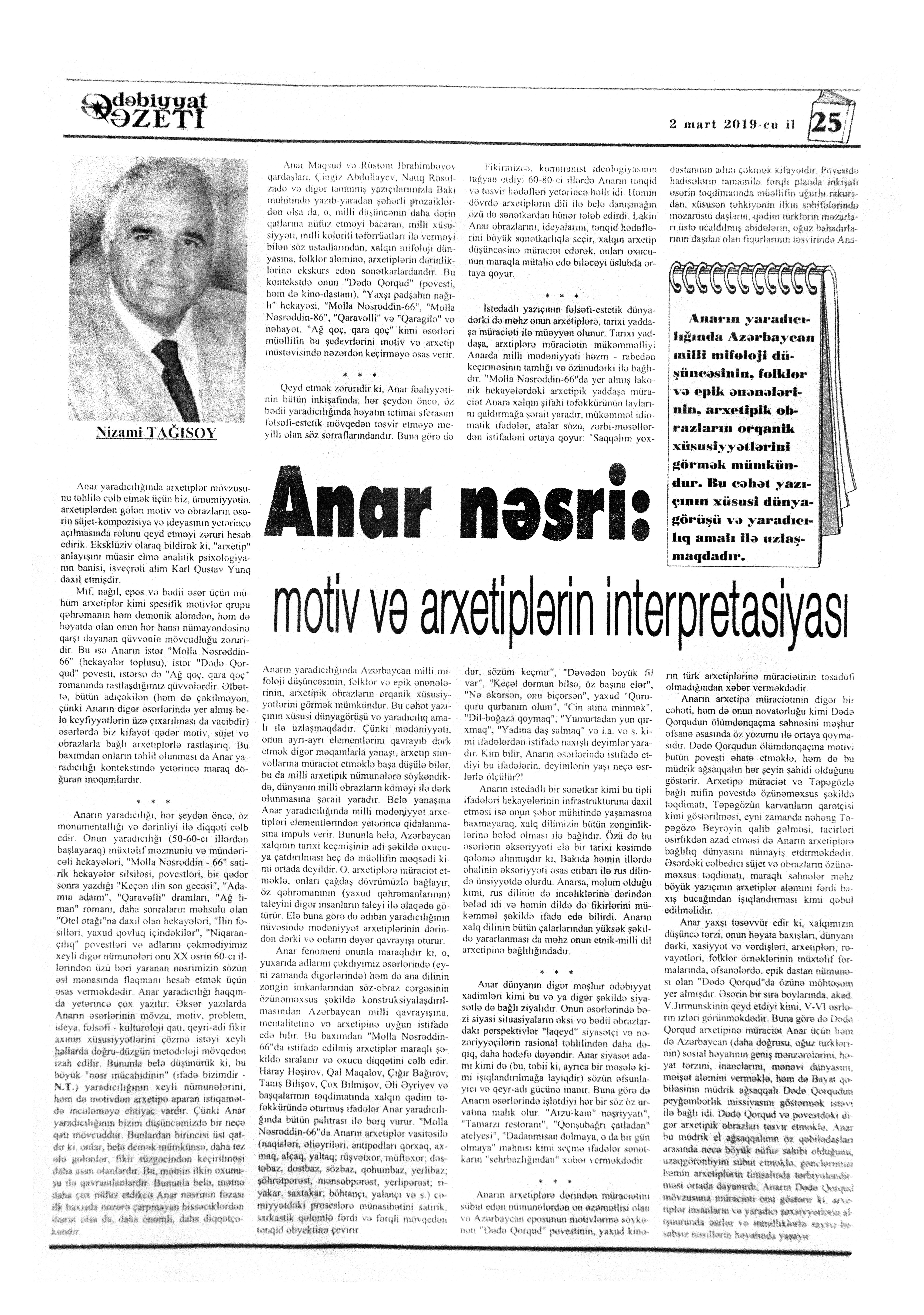 Bax: 800 Anar – 80 813. “Gözmuncuğu” özbək dilində: [Xalq yazıçısının eyniadlı kitabı] //Mədəniyyət.- 2019.- 6 mart.- S.7. 814. Xələfli, Ə. R. Anar – meyar //Kredo.- 2019.- 14 mart.- S.1;5. 815. Məmmədli, N. Böyük yolun Anarı: Ədəbi düşüncəmizin müdriki haqqında bir neçə söz //Kredo.- 2019.- 14 mart.- S.3. 816. Mövsüm, R. Anarın təsəllisi... //525-ci qəzet.- 2019.- 12 mart.- S. 7; Kaspi.- 2019.- 16-18 mart.- S. 22. 817. Müşfiq, Ş. “Anarın Dədə Qorqud yaradıcılığı” kitabı təqdim olundu: [AMEA-nın Mərkəzi Elmi Kitabxanasında professor Yeganə İsmayılovanın eyniadlı kitabının təqdimatı haqqında] 525-ci qəzet.- 2019.- 12 mart.- S.7. 818. Rza, X. Ağ saçların simfoniyası: [Xalq yazıçısı haqqında] //Ədəbiyyat qəzeti.- 2019.- 16 mart.- S.15. 819. Tağısoy, N. Anar nəsri: motiv və arxetiplərin interpretasiyası: [yazıçının yaradıcılığı haqqında] //Ədəbiyyat qəzeti.- 2019.- 2 mart.- S.25. 820. Tağısoy, N. Anar nəsrinin şəhər fəzası: [yazıçının yaradıcılığı haqqında] //525-ci qəzet.- 2019.- 14 mart.- S.7. 821. Vahabzadə, İ. Altıncı mərtəbə: [yazıçının “Beşmərtəbəli evin altıncı mərtəbəsi” romanı haqqında] //525-ci qəzet.- 2019.- 12 mart.- S. 7. Nizami Xudiyev – 70 822. Quliyev, Ə. Nizami Xudiyev: pedaqoq-alim və ictimai xadim portreti //525-ci qəzet. -2019.- 20 mart.- S.14. 823. Quliyev, Ə. Pedaqoq – Alim, ictimai xadim //İki sahil.- 2019.- 19 mart.- S.16. 824. Məmmədli, İ. Yeddinci onilə layiqli yekun: Professor Nizami Xudiyevin 70 yaşına //525-ci qəzet.- 2019.- 5 mart.- S.6. 825. Mustafayev, F. Ömür yalnız yaşanmış illərin sayı ilə ölçülmür: Nizami Xudiyev – 70 //Azərbaycan müəllimi.- 2019.- 15 mart.- S. 12. 826. Yusifoğlu, R. Ömrün və elmin ziyası fonunda uğur hekayəsi: Nizami Xudiyev – 70 //Xalq qəzeti.- 2019.- 10 mart.- S.6.