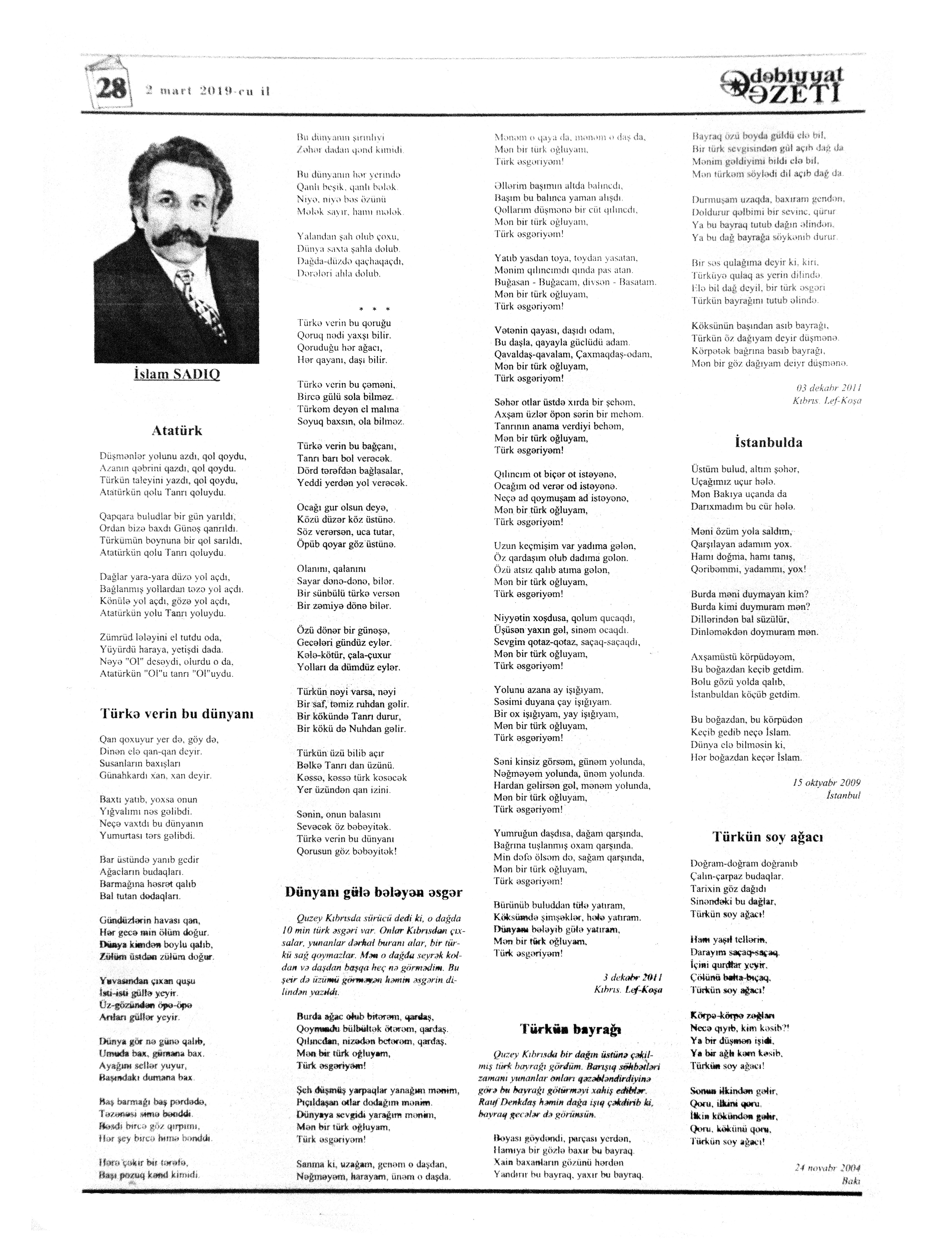 BƏDİİ ƏDƏBİYYAT VƏ ƏDƏBİYYATŞÜNASLIQ ŞEİRLƏR 427. Asim, X. İtən cavablar; Getsəm yaxşıdır; Səni niyə yaşayım ki /təqdim etdi Cavanşir Yusifli //Ədəbiyyat qəzeti.- 2019.- 16 mart.- S. 30. 428. Baba, A. Xəbərim olmur; Zəncir; Payız gəlib...; Səma olmaq istəyirdim və s. //525-ci qəzet.- 2019.- 6 mart.- S.7. 429. Biləsuvarlı, F. Bu şəhər; Mənsiz; Bəlkə görüşmədik...; Gedirəm... //Kaspi.- 2019.- 30 mart.- S.14. 430. Biləsuvarlı, F. Mənim; Bu qadın...; Qaçır //Ədəbiyyat qəzeti.- 2019.- 16 mart.- S.31. 431. Cəmilbəyli, C. Gəldim, ana!; Söz qurtarıb deməyə; Dərdimə min bərəkallah; Zirvəsindəyəm artıq //525-ci qəzet.- 2019.- 28 mart .- S.8. 432. Çeşməli, D. Edam edən oldun; Bahara səni; Gördüyüm yerdə; Azərbaycan və s. //Ədalət.- 2019.- 19 mart.- S.7. 433. Dilbazi, M. Sən-qəhqəhə...; “Bölümdə qaldıqca vətən torpağı” //Ədalət.- 2019.- 8 mart.- S.8. 434. Dövran, R. Təbrizim; Mən Şuşanın dağlarında qar görürəm; Yaşadım; Gözlə yolumu; Sən öyrətmisən //Ədalət.- 2019.- 5 mart.- S. 7. 435. Duyğun, R. Nərmin və Elnur dastanı: Qarabağ döyüşlərində əllərini və ayaqlarını itirmiş qazi Elnuru sevib onunla evlənən Nərmin xanıma həsr edirəm //Ədəbiyyat qəzeti.- 2019.- 16 mart.- S.13. 436. Elqızı, M. Türk qardaşım: Oğurluq gözdədir, ürəkdə deyil; Vətənə yorğan de, toprağa balış...; Zaman-zaman; Buraxdın verdiyin “hə”ni də, getdin... //525-ci qəzet.-2019.- 15 mart.- S.7. 437. Elsevər, S. Sevgi; Siçanlar və adamlar; Azad qadın heykəlinə; Tənha qadın rəsminə və s. //Kaspi.- 2019.- 2-4 mart.- S.20. 438. Əhməd, Ə. Rəssam; Yalançıların melodiyası; Rebekka; Sonuncu qərar; Lalın zümzüməsi və s. //Kaspi.- 2019.- 30 mart.- S.23. 439. Əkbəroğlu, Ə. Gedər; Dağlar; Sadəcə; Qalmadı və s. //Kaspi.- 2019.- 2-4 mart.- S.23. 440. Əlifoğlu, Ş. Mədət Əyyuboğlunun yubileyində: [şairin yaradıcılığı haqqında] //Kredo.- 2019.- 7 mart.- S.15. 441. Əsma, Ə. Müharibədən danişsam da inanmayın mənə: Birinci çek:; İkinci çek:; Üçüncü çek: [türk ədəbiyyatı] /tərc. etdi Fərid Hüseyn //Ədəbiyyat qəzeti.- 2019.- 8 mart.- S.28. 442. Fəranək F.İ. Xatın; Röyalar; Sən sınsan; Gəlin aparırlar; Uşaqlaşıram, analaşıram, yaşlanıram //525-ci qəzet.- 2019.- 7 mart.- S. 7. 443. Gəncəvi, M. Rübailər //Ədalət.- 2019.- 8 mart.- S.8. 444. Gün, N. Mənə soyuqdur: Günəş; Döydüm qapını; Boşluq //Ədalət.- 2019.- 8 mart.- S.9. 445. Həsənbəy, Y. Qayıda bilmərəm, gözləmə məni //525-ci qəzet.- 2019.- 14 mart.- S.8. 446. Horovlu, Ş. Bir şeir nədir ki, məni bağışla, Bir şeir verərmi sənin yerini?: Torpaq yuxusu; Ağlayır; Sənlə gedirəm; Açarım qapıya düşmür; Tutmağım gəlir və s. //Ədəbiyyat qəzeti.- 2019.- 16 mart.- S.16. 447. Horovlu, Ş. Şəhid xatirələr; Torpaq olmağa; Yaşamağa dəyməz ki...; Vətən tərəfi; Aparın işıqgələnə //525-ci qəzet.-2019.- 7 mart.- S.7. 448. Hüseynxan, Ə. Atasını itirmiş qızın hekayəsi: Ayrıldıq...; Bəlkə də...; Bilirsənmi; Bu şəhəri unutma, Allah və s. //Kredo.- 2019.- 7 mart.- S.12. 449. İlhamoğlu, Z. Çatmır; Düşünüb addım at...; Şair ömrü; Külümün altında və s. //Ədalət.-2019.- 29 mart.- S.7. 450. İsabəyli, Q. Satirik nəfəsdərimlər //Ədalət.- 2019.- 2 mart.- S.16. 451. İsaqoğlu, V. Haqqa bağlanmışam haqqı sevəli: Salam, altmış yaşım; ...Gəlib yetişdim; Layla çal; ...Gözüm var, Ana və s. //Kredo.- 2019.- 20 mart.- S.14. 452. İsaqoğlu, V. Salam, altmış yaşım; Mən altmış yaşıma gəlib yetişdim; Layla çal; Dəyməz və s. //Ədalət.-2019.- 15 mart.- S. 7. 453. İsmayıl, Z. “Azərbaycanda elmə yüksək səviyyədə diqqət və qayğı göstərilir”: [filologiya üzrə fəlsəfə doktoru ilə müsahibə] /müsahibəni apardı Türkan Bəylərli //525-ci qəzet.-2019.- 28 mart.- S.6. 454. İsmayılzadə, İ. Gözləyin, dünyaya qayıtmağım var: Toy günü; Yollar (mahnı); Qızlar, oğlanlar; Vaxt və s. //Ədalət.- 2019.- 16 mart.- S.14. 455. Karahan, M. Türk düşüncə və siyasət adamı: Əhməd bəy Ağaoğlu – 150: [ictimai xadim, jurnalist, pedaqoq və yazıçının yubileyi ilə bağlı] //525-ci qəzet.-2019.- 28 mart.- S.6. 456. Kəbiri, R. Haray; Nigarançılıq; Məni dan ulduzundan keçirt və s. //525-ci qəzet.- 2019.- 29 mart.- S.7. 457. Kərimzadə, F. Hanı qəbirlərin, Sarı dolama... //Ədəbiyyat qəzeti.- 2019.- 16 mart.- S.8. 458. Qarabulud, S. Dustaqlıqda qamçı; Qələm qorxusu; Haray; Nigarançılıq //525-ci qəzet.-2019.- 29 mart.- S.7. 459. Qaramanlı, Ş. Bayrağım; Ana; Yolda düşündüklərim; Araz qoydu və s. //Həftə içi.- 2019.- 15 mart.- S.8. 460. Qərib, S. Bu ürək; Gözəl sev məni; Yaşamaq cox gözəl; Qalmadı; Sözsüz nəğməm //Kaspi.- 2019.- 2-4 mart.- S.23. 461. Qəşəmoğlu, Ə. Gözlərin mənə deyir ki, Sənsən o sirdən gələnim...: Azərbaycan bayrağı; Türklük; Eşqdən o yana; Adına yazılan qadın; Sındı əlimdəki piyalə... və s. //Ədəbiyyat qəzeti.- 2019.- 2 mart.- S.26. 462. Qoca, F. Azadlıqdan sonra... //Ədəbiyyat qəzeti.- 2019.- 8 mart.- S. 9. 463. Qoca, F. Türk xalqına açıq məktub; Mən türkəm; Qəzəblənib qalxanda; Göyüş oğlu Fikrətəm //525-ci qəzet.- 2019.- 28 mart.- S.7. 464. Laçınlı, X. Kəs əllərimi; Həsrətin yolları; Çəkil get //Ədalət.- 2019.- 7 mart.- S.8. 465. Məhərrəmova, T. Ədəbiyyat adamları hansı ölkələrin mətbuatını təqib edirlər?: “Öz yazıçılarımız, şairlərimiz, ədəbiyyatımızla bağlı hər hansı xəbərə rast gəlmək istəyirəm”:[yazıçı-publisist Nəriman Əbdülrəhmanlı, Elçin Hüseynbəyli və Orxan Fikrətoğlunun mövzu ətrafında fikirləri] //Kaspi.- 2019.- 16-18 mart.- S.10. 466. Məmmədzadə, R. Qarabağın gözəlləri; Qaraçı qız