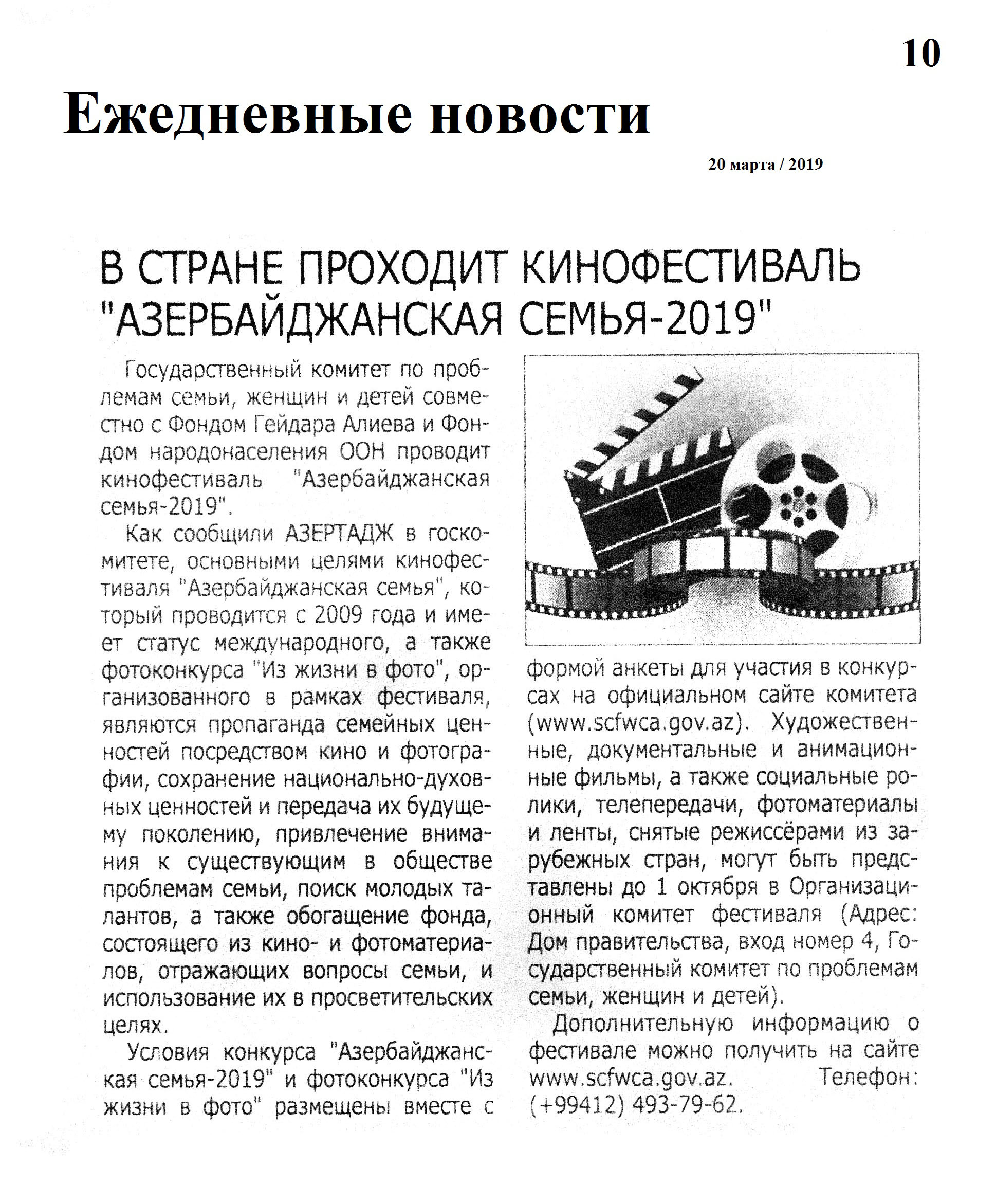 КИНО 930. Азербайджанский фильм удостоен приза на Международном фестивале в Турции: [о фильме «Oturacaqlar» Орхана Агазаде] //Ежедневные новости.- 2019.- 15 марта.- С.10. 931. Азербайджанское государство проявляет большую заботу о развитии кинематографа: [о мерах по реализации распоряжения] //Бакинский рабочий.- 2019.- 8 марта.- С.7. 932. Алиев, Ш. Погружаясь в особый мир: Шамиль Алиев: Ковер - родной язык азербайджанского народа, через него он говорит со своим Создателем: [беседа с кинорежиссером] /провела С.Алиева //Каспiй.- 2019.- 16 марта.- С.20. 933. В Баку открылся новый кинотеатр: [«Salaam Cinema» в здании молоканской церкви] //Ежедневные новости.- 2019.- 20 марта.- С.10. 934. В стране проходит кинофестиваль «Азербайджанская семья – 2019» //Ежедневные новости.- 2019.- 20 марта.- С.10. 935. Дан старт кинофестивалю «Азербайджанская семья 2019» //Бакинский рабочий.- 2019.- 2 марта.- С.7. 936. Кязимова, С. Мультфильмы объединяют народы: В Праге прошел фестиваль азербайджанских анимационных фильмов //Каспiй.- 2019.- 28 марта.- С.4. 937. Тофиг Тагизаде золотыми буквами вписал свое имя в историю азербайджанского кино //Бакинский рабочий.- 2019.- 2 марта.- С.8.