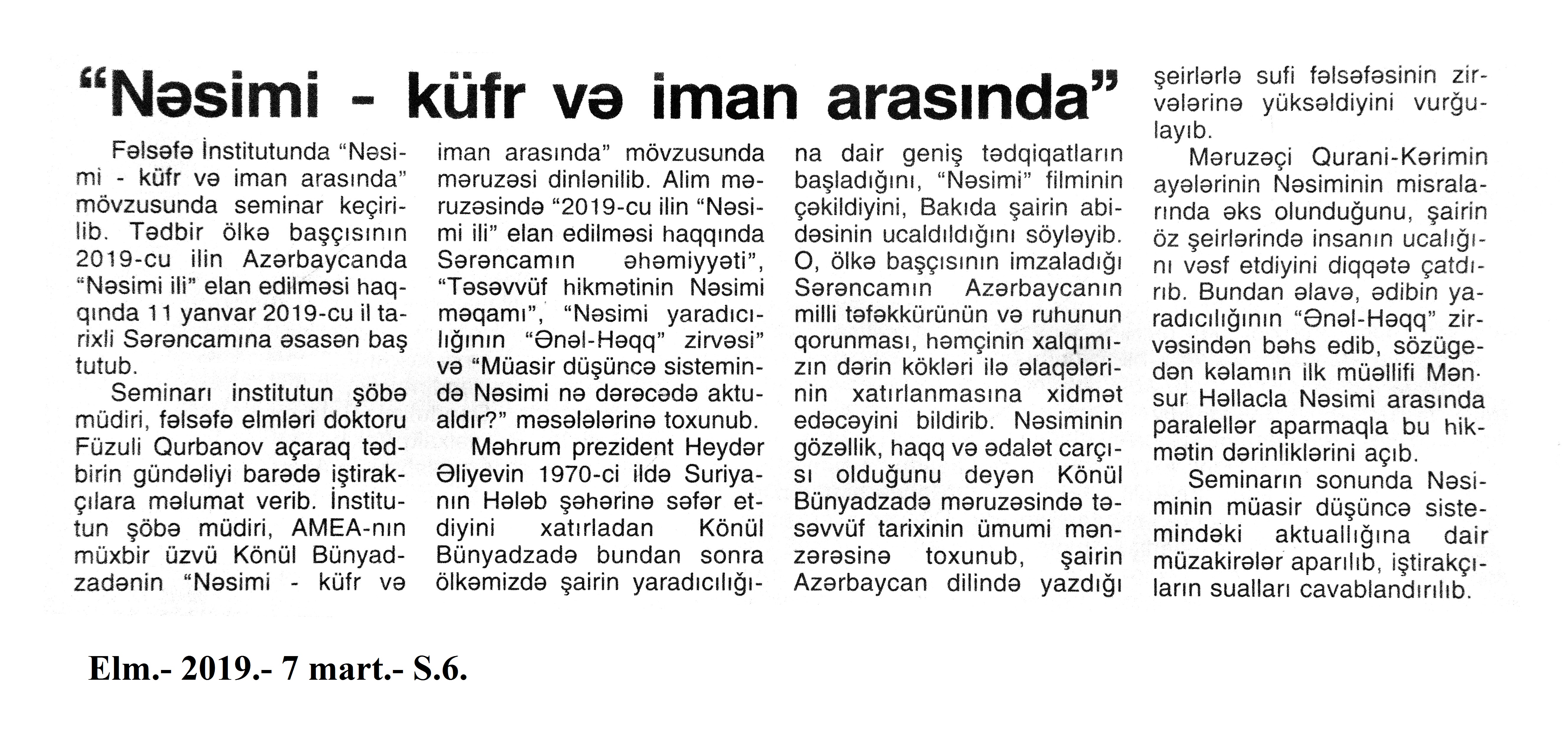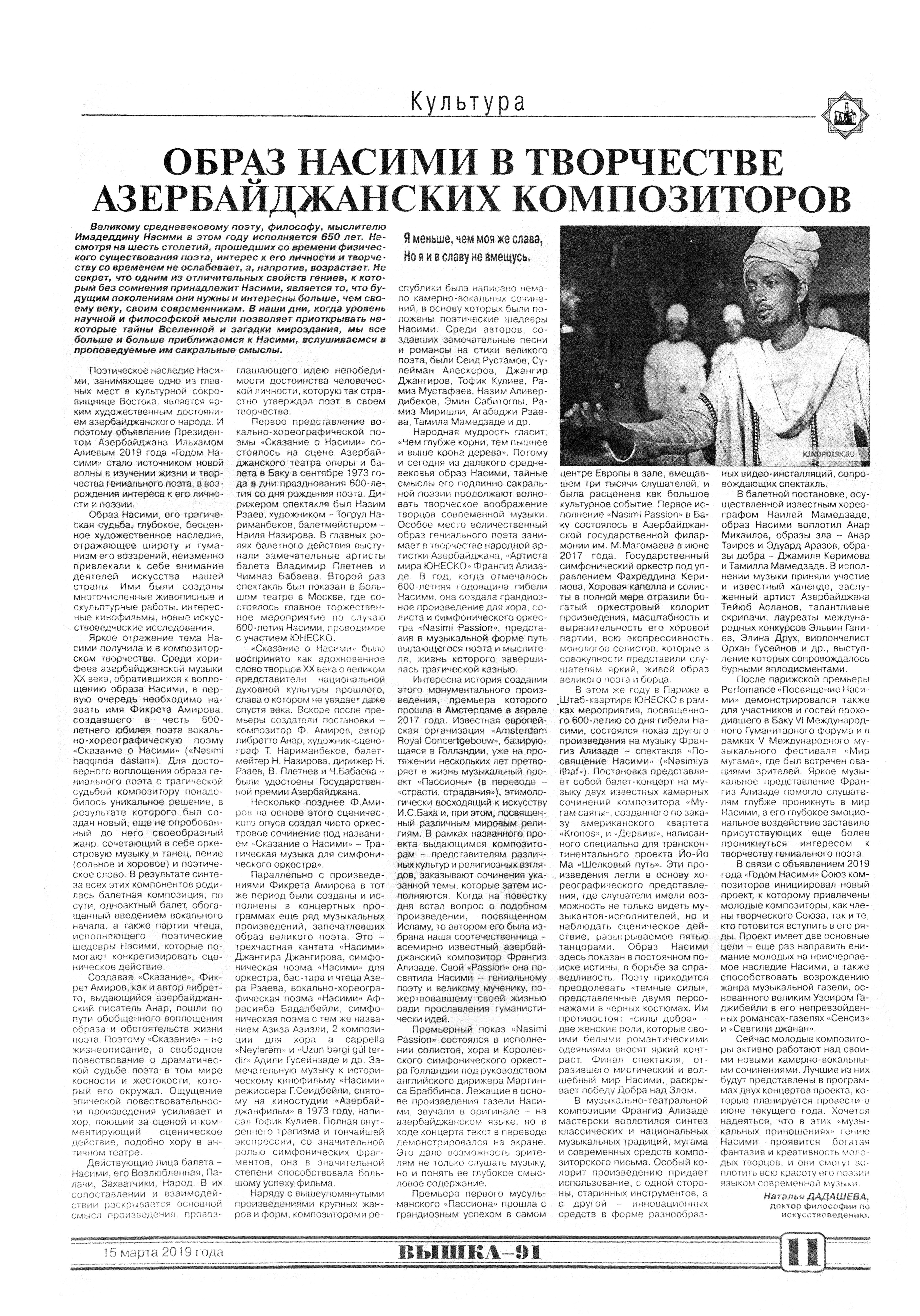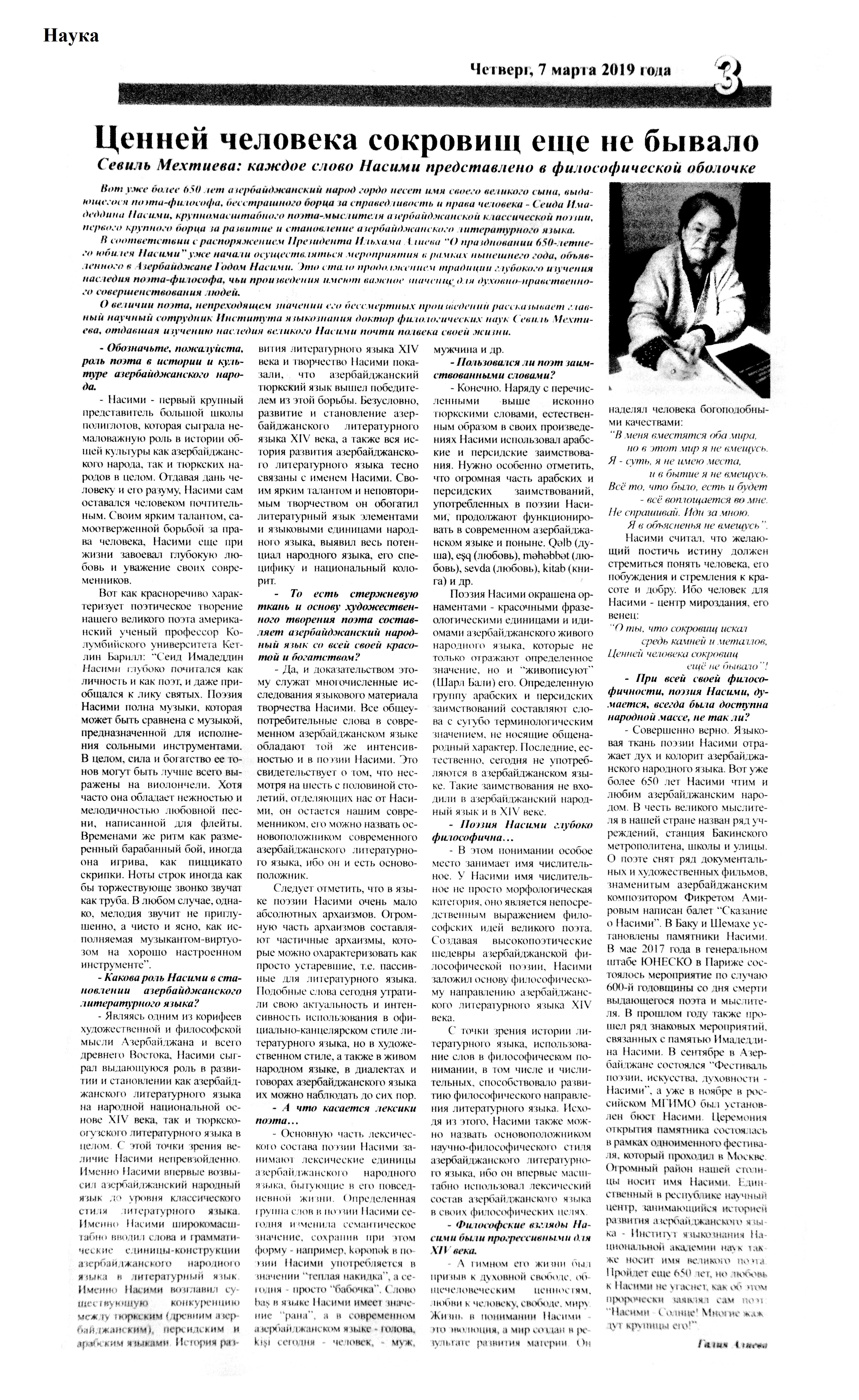 Год Насими – 2019 963. Гасанзаде, Д. Душа и мир - все это я!: [беседа с доктором искусствоведения Д.Гасанзаде] /провела М.Мурсалова //Каспiй.- 2019.- 30 марта.- С.18-19. 964. Дадашева, Н. Вечно живой гений: Образ Насими в творчестве азербайджанских композиторов //Каспiй.- 2019.- 12 марта.- С.12. 965. Дадашева, Н. Образ Насими в творчестве азербайджанских композиторов //Вышка.- 2019.- 15 марта.- С.11. 966. Ислам, А. Я стих священный, свечение его огня: Международная конференция «Имадеддин Насими и узбекская литература» //Каспiй.- 2019.- 29 марта.- С.9. 967. Мехтиева, С. Ценней человека сокровищ еще не бывало: Севиль Мехтиева: Каждое слово Насими представлено в философской оболочке: [интервью с доктором филологических наук] /провела Г.Алиева //Наука.- 2019.- 7 марта.- С. 3. 968. «Я меньше, чем моя же слава, но я и в славу не вмещусь» //Неделя.- 2019.- 15 марта.- С. 19.