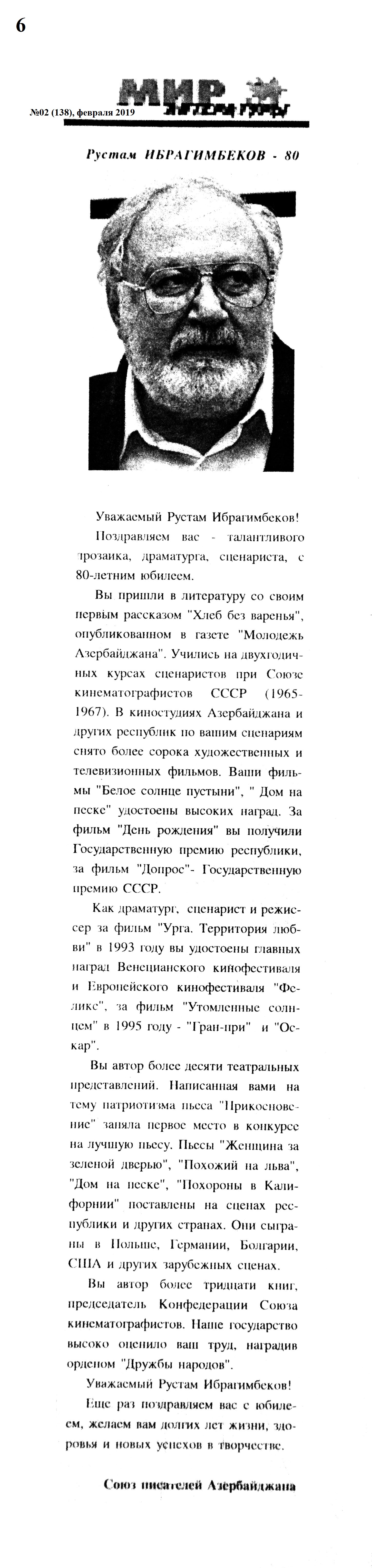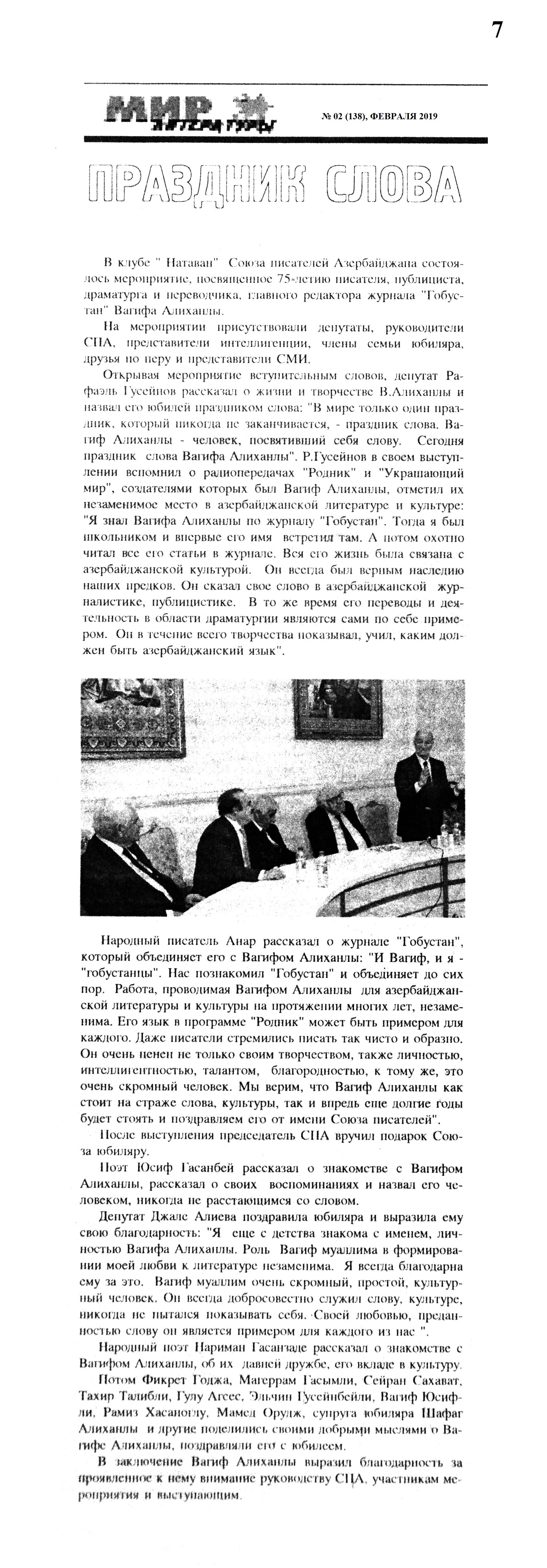 Памяти Вагифа Мустафазаде 924. В Москве прошел вечер джаза, посвященный памяти Вагифа Мустафазаде //Бакинский рабочий.- 2019.- 12 марта.- С.5. 925. Гасанова, С. Оригинальный, блестящий, выдающийся: День рождения Вагифа Мустафазаде собрал в Москве его друзей, коллег и ценителей джаза //Азербайджанские известия. - 2019.- 16 марта.- С.3. 926. Иманова, А. Гордый человек, который знал себе цену: Памяти великого музыканта, пианиста и композитора Вагифа Мустафазаде //Каспiй. - 2019.- 16 марта.- С.18-19.