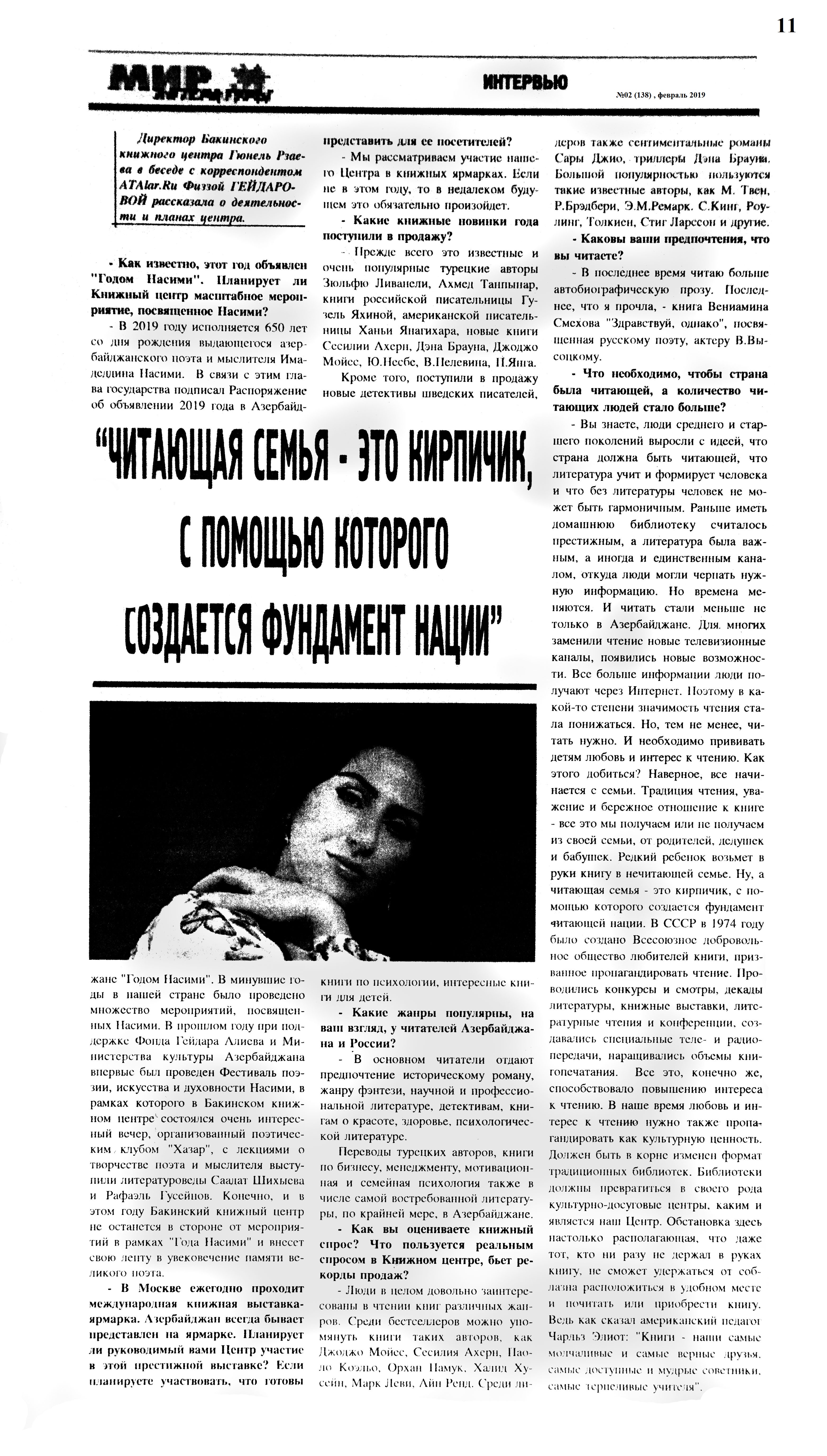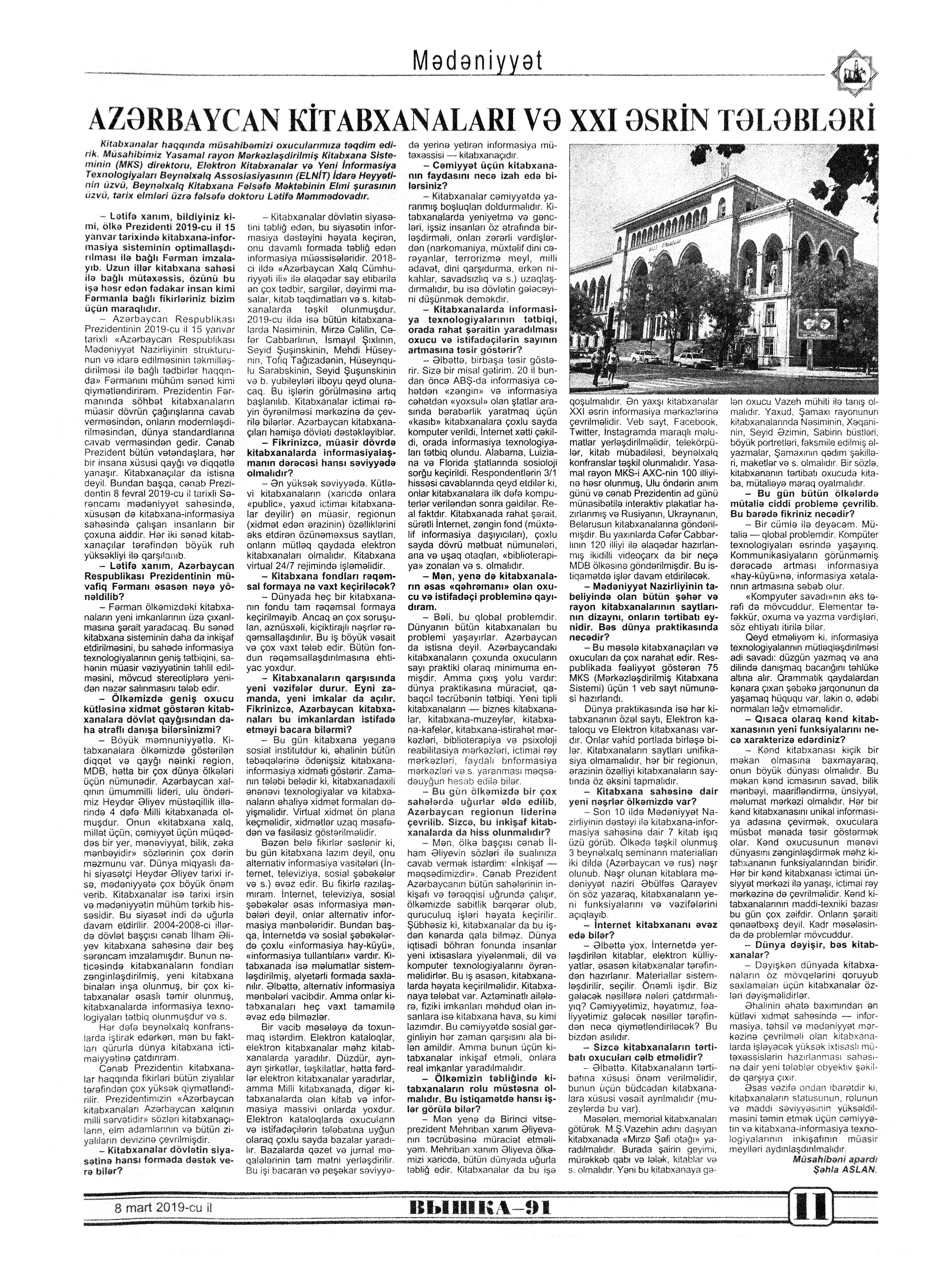 KİTABXANA İŞİ 195. Akademik Nərgiz Paşayeva Oksford Universitetinin Bodli Kitabxanasının yaradıcısının şərəfinə təşkil edilən təntənəli qəbulda iştirak edib //İki sahil.-2019.- 20 mart.- S.10. 196. Çexiyada yaşayan həmvətənimizin miniatür kitabının təqdimatı: [Leyla Bəyimin (Cəfərovanın) “Qarabağ şikəstəsi” adlı kitabı haqqında] Mədəniyyət.-2019.-1 mart.- S.4. 197. “Dağ yəhudilərinin tarixi və mədəniyyəti” kitabının təqdimatı: [Bakı Kitab Mərkəzində] //Mədəniyyət.-2019.- 8 mart.- S.6. 198. Əliyeva, T. Cəfakeş elm adamı: Bəybala Ələsgərov – 65: [M.F.Axundov adına Azərbaycan Milli Kitabxanasının əməkdaşı haqqında] //Hürriyyət.-2019.- 29 mart.- S.13. 199. Hüseynov, F. Mədəniyyət müəssisələrində ictimaiyyətlə əlaqələr və mətbuatla işin təkmilləşdirilməsi: Regional mədəniyyət idarələrinin informasiya məsələləri üzrə məsul şəxsləri üçün təlimlər keçirilir: [Milli Kitabxanada keçirilən tədbir haqqında] //Mədəniyyət.-2019.-1 mart.- S.3. 200. Məmmədova, L.A. Azərbaycan kitabxanaları və XXI əsrin tələbləri: [tarix elmləri üzrə fəlsəfə doktoru Lətifə Məmmədova ilə müsahibə] /müsahibəni apardı Şəhla Aslan //Вышка.- 2019.-8 марта.- С.11. 201. “Milli geyimlər və folklor”: “Sərhəd bilməyən incəsənət” layihəsində virtual görüş: [Uşaq Kitabxanası və Ukrayna Milli Uşaq Kitabxanası arasında eyniadlı virtual görüşün keçirilməsi haqqında] //Mədəniyyət.-2019.- 20 mart.- S.7. 202. Nərimanoğlu, M. Nadir kitablar: Milli sərvətimiz: [M.F.Axundov adına Azərbaycan Milli Kitabxanasında 1962-ci ildə yaradılan Nadir kitablar bölməsi 2013-cü ildə şöbə statusu almışdır. Hazırda Nadir kitablar muzey şöbəsi] //Azərbaycan.-2019.- 3 mart.- S.7. 203. Nitq mədəniyyətinin inkişafında mütaliənin rolu: [Cəfər Cabbarlı adına Respublika Gənclər Kitabxanasında “Gənclərdə təfəkkür və nitq mədəniyyətinin inkişafında mütaliənin rolu” mövzusunda dəyirmi masa keçirilib] //Mədəniyyət.- 2019.- 29 mart.- S.2.