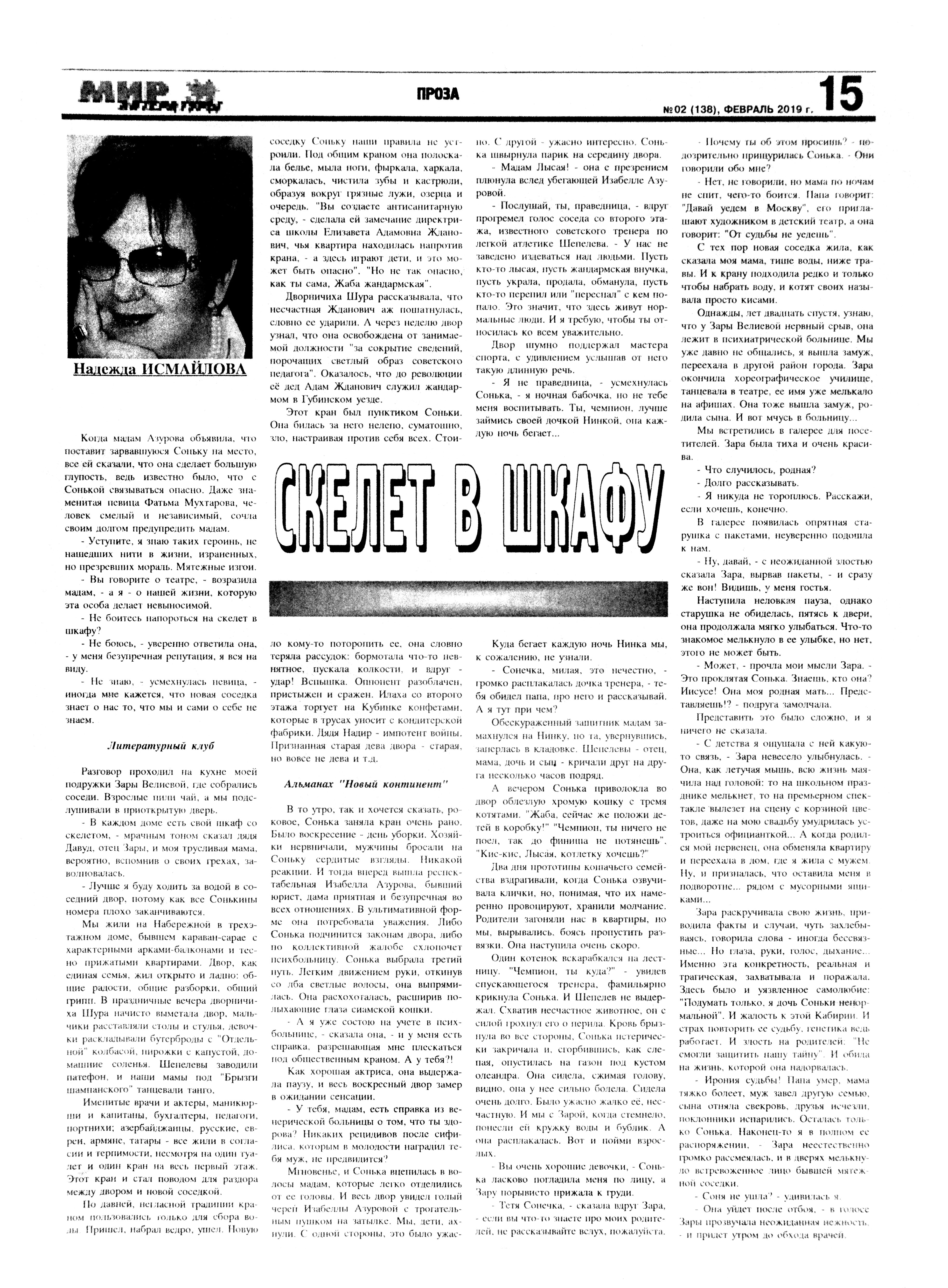 ЛИТЕРАТУРОВЕДЕНИЕ И ЛИТЕРАТУРНАЯ КРИТИКА 944. Алиева, Э. С любовью к людям! Неравнодушие - вот, пожалуй, самое главное качество человека, не только журналиста: [беседа с публицистом Эльмирой Алиевой] /провела М.Мурсалова //Каспiй.- 2019.- 8 марта.- С.8-9. 945. Анаргызы, Г. Сказка длиною в пятьдесят лет: Гюнель Анаргызы: Мои родители столько лет прожили вместе и не утратили взаимного трепетного отношения: [беседа с писателем] /провела Р.Аббасова //Каспiй.- 2019.- 30 марта.- С.12-13. 946. Во Франции издана книга «Антология азербайджанской литературы» //Ежедневные новости.- 2019.- 1 марта.- С. 10. 947. Гусейнова, А. Любимый народом газельхан: [о творчестве поэта Алиаги Вахида] //Мир литературы.- 2019.- №02(138) февраль.- С.5. 948. Джафаров, Г. Возвращение национального достояния: Гамид Джафаров: Когда мы наконец нашли могилу Гусейна Джавида, я упал перед ней на колени и зарыдал: [беседа с полковником МВД в отставке] /провела А.Ислам //Каспiй.- 2019.- 2 марта.- С.14-15. 949. Евдаев, Н. С любовью к родным берегам…: Ноберт Евдаев: Баку остался со мной навсегда: [беседа с поэтом] /провела А.Ислам //Каспiй.- 2019.- 6 марта.- С.13. 950. Идеология азербайджанства в творчестве Самеда Вургуна: [исследования академика Теймура Керимли] //Бакинский рабочий.- 2019.- 7 марта.- С.4. 951. Иманова, С. Поэт мировой скорби…»: [о творчестве поэта и публициста Мухаммеда Хади] //Мир литературы.- 2019.- №02(138) февраль.- С.4. 952. Ислам, А. Свобода как сакральная сущность любви и научного познания: Любовь и свобода в лирике азербайджанской ренессансной поэзии: [Мехсети Гянджеви и Атааллаха Аррани] //Каспiй.- 2019.- 15 марта.- С.12-13. 953. Ислам, А. Шедевр в копилку победы: «Плач по Карабаху» в миниатюрном формате: [о презентации одноименной книги Лейлы Бегим в Музее Миниатюрной Книги] //Каспiй. - 2019.- 1 марта.- С.12. 954. Исмайлова, Н. Скелет в шкафу: Рассказ //Мир литературы.- 2019.- №02(138) февраль.- С.15. 955. К 120-летию Джафара Джаббарлы //Новое время. - 2019.- 15 марта.- С.10. 956. «Память о великом мастере»: [вечер памяти Бахтияра Вагабзаде в клубе «Натаван»] //Мир литературы.- 2019.- №02(138) февраль.- С.1-3. 957. Праздник слова: [мероприятие к 75-летию публициста и переводчика Вагифа Алиханлы в клубе «Натаван»] //Мир литературы.- 2019.- №02(138) февраль.- С.7. 958. Рзаева, Г. «Читающая семья-это кирпичик, с помощью которого создается фундамент нации»: [беседа с директором БКЦ Гюнель Рзаевой] /провела Ф.Гейдарова //Мир литературы.- 2019.- №02(138) февраль.- С.11. 959. Рустам Ибрагимбеков-80: [поздравление Союза Писателей //Мир литературы.- 2019.- №02(138) февраль.- С.6. 960.