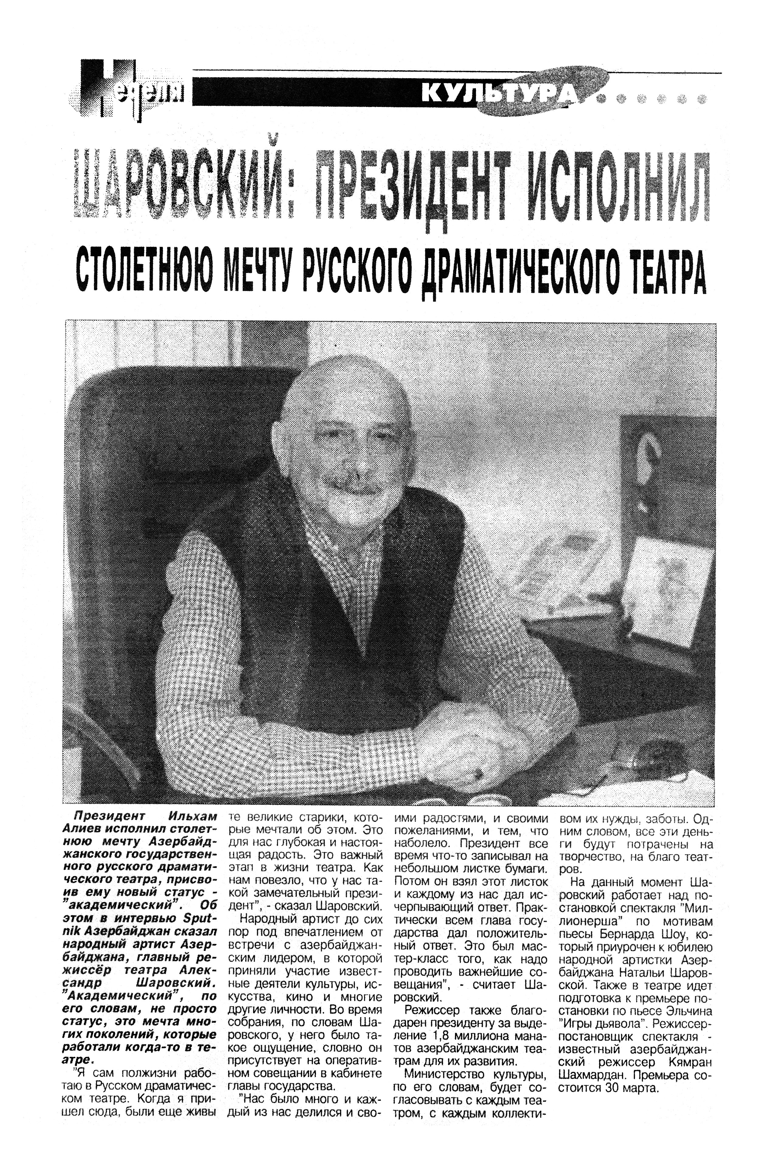 ТЕАТР 938. Ислам, А. Богатая женщина: ТЮЗ показал спектакль по пьесе Али Амирли на осетинской сцене: [о постановке одноименного спектакля режиссером Бахрамом Османовым в Северо-Осетинском Драмтеатре] //Каспiй.- 2019.- 12 марта.- С.13. 939. «Маленький принц» на сцене Государственного музыкального театра: [в постановке народной артистки, режиссера Джаннет Селимовой] //Бакинский рабочий.- 2019.- 1 марта.- С.6. 940. Микеладзе, Г. Кризис зрительских симпатий, или Почему системы образования и культуры дистанцируются друг от друга: [о роли театров в воспитании молодого поколения] //Каспiй.- 2019.- 2 марта.- С.18-19. 941. Оперу «Аида» покажут на сцене Азербайджанского государственного академического театра оперы и балета //Бакинский рабочий.- 2019.- 14 марта.- С.5. 942. Селимова, Дж. Вселенские мечты Маленького принца: Философская сказка Антуана де Сент-Экзюпери на бакинской сцене: [беседа с режиссером ТЮЗа Джаннет Селимовой об одноименной постановке] /провела А.Ислам //Каспiй.- 2019.- 5 марта.- С.13. 943. Шаровский: Президент исполнил столетнюю мечту Русского Драматического Театра: [режиссер театра А.Шаровский о присвоении статуса «академического»] //Неделя.- 2019.- 8 марта.- С.19.