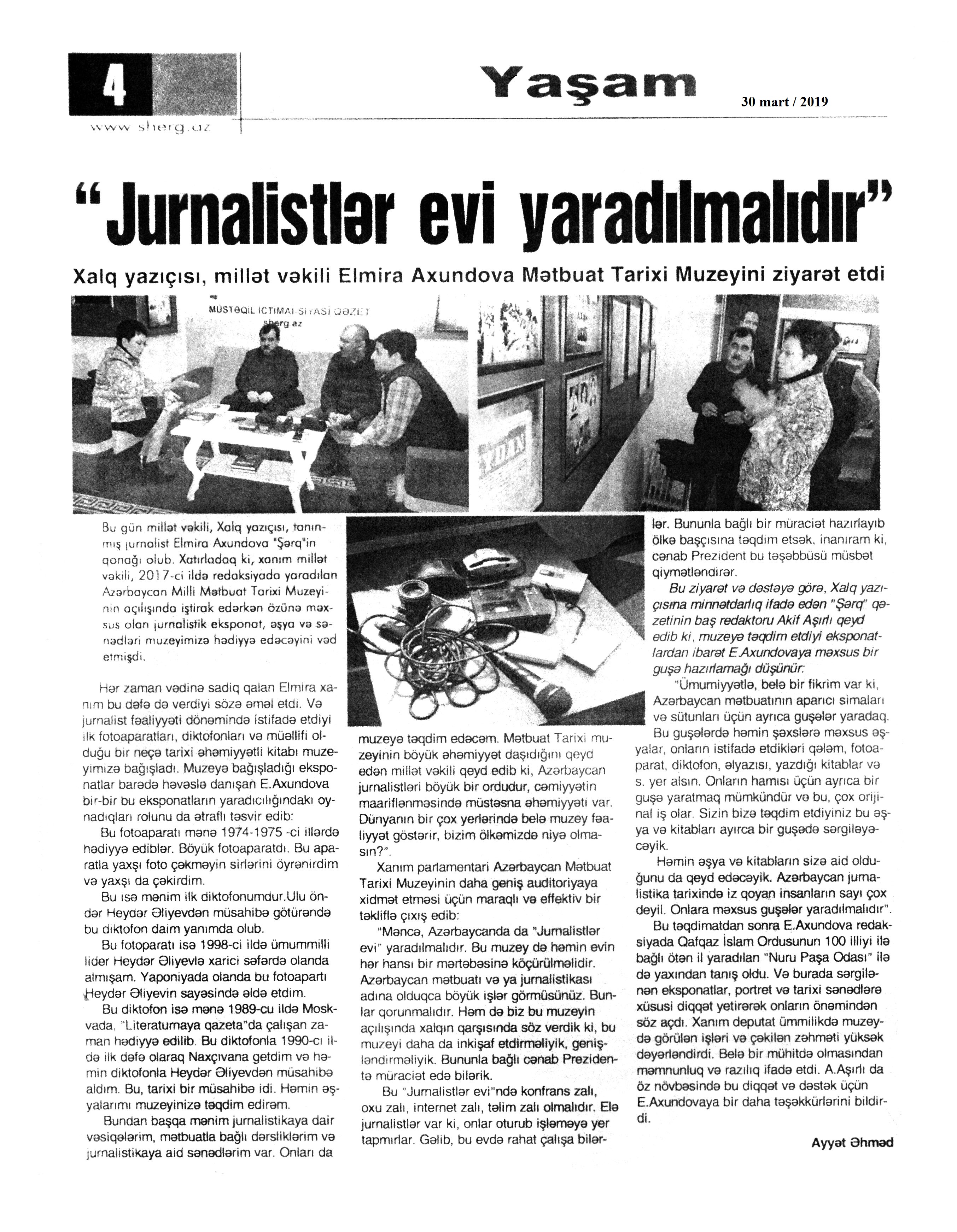 31 mart – Azərbaycanlıların soyqırımı günü 75. Qan yaddaşımızın 101-ci ili: Azərbaycanlıların Soyqırımı Günü ilə bağlı Qubada anım mərasimi və konfrans keçiriləcək //Mədəniyyət.-2019.-29 mart.- S.1-2. 76. Qələndər. Suraxanı rayonunun nümayəndələri Memorial Soyqırımı Muzeyi ilə tanış olublar //Həftə içi.- 2019.- 30 mart-1 aprel.- S.7.; Xalq qəzeti.- 2019.- 30 mart- S.10. 77. “Qu quşunun nəğməsi”: Azərbaycanlıların Soyqırımı Gününə həsr edilmiş musiqi axşamı: [Dövlət Akademik Filarmoniyasında keçirilən tədbir haqqında] //Mədəniyyət.-2019.- 29 mart.- S.3.