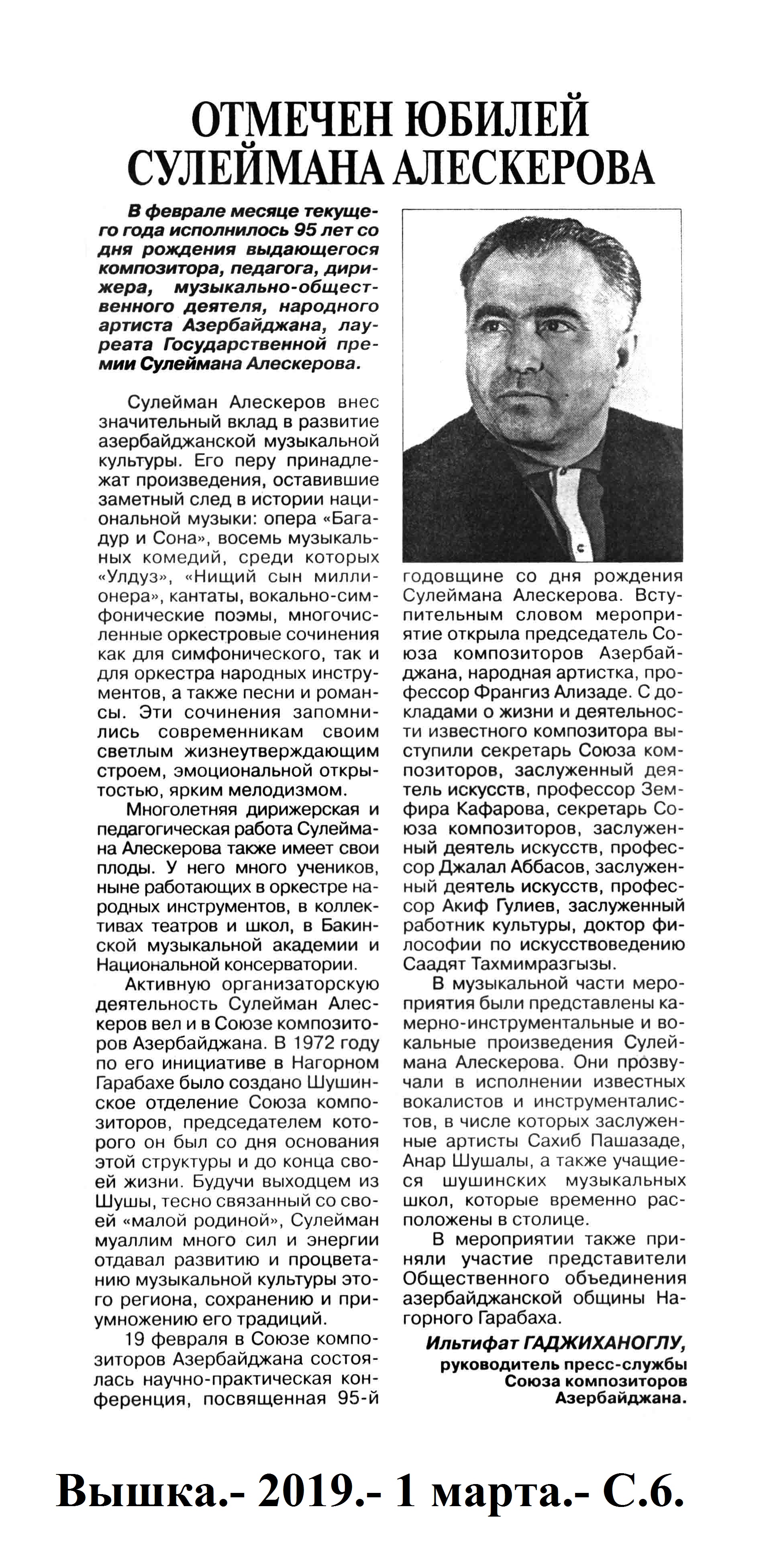МУЗЫКА 914. Будет отмечено 140 - летие со дня рождения Гусейнгулу Сарабского //Ежедневные новости.- 2019.- 8 марта.- С.10. 915. В Баку отметили день рождения Леопольда Ростроповича: [в Доме-музее Л. и М.Ростроповичей] //Бакинский рабочий.- 2019.- 2 марта.- С.10. 916. Гаджиханоглу, И. Отмечен юбилей Сулеймана Аскерова: [к 95-летию композитора] //Вышка.- 2019.- 1 марта.- С.6. 917. Геокчаев, Т. Путь постижения музыки: Теймур Геокчаев: Каждый педагог выполняет миссию проводника в безграничный мир профессии: [беседа с народным артистом, дирижером] /провела Р.Аббасова //Каспiй.- 2019.- 2 марта.- С.16-17. 918. Ислам, А. Объединяющая народы и культуры: Музыка Средних веков и история музыкальных инструментов: [одноименный семинар в Центре Мугама] //Каспiй.- 2019.- 20 марта.- С.13-14. 919. Касимова, Х. Судьбоносная встреча: Хураман Касимова: Президент Ильхам Алиев - друг каждого азербайджанца: [беседа с народной артисткой] /провела А.Ислам //Каспiй.- 2019.- 5 марта.- С.9. 920. Кязимова, С. Стартовал конкурс «Мугам-2019»: [в Центре Мугама] //Азербайджанские известия.- 2019.- 16 марта.- С.1. 921. Мамедова, А. Щедрая на таланты земля: Руслан Агабабаев пропагандирует национальную музыку за океаном: [о творчестве композитора] //Каспiй.- 2019.- 13 марта.- С.13. 922. Сафаралибекова, Р. Монография к юбилею: Тариель Мамедов: В неиссякаемом потоке новых идей: [к 70-летнему юбилею музыковеда] //Каспiй.- 2019.- 20 марта.- С.14. 923. Сафарова, З. Сказка длиною в пятьдесят лет: Земфира Сафарова: В настоящее время Гюнель - популярное имя, а тогда наша девочка была первой: [беседа с музыковедом] /провела Р.Аббасова //Каспiй.- 2019.- 16 марта.- С.12-13.