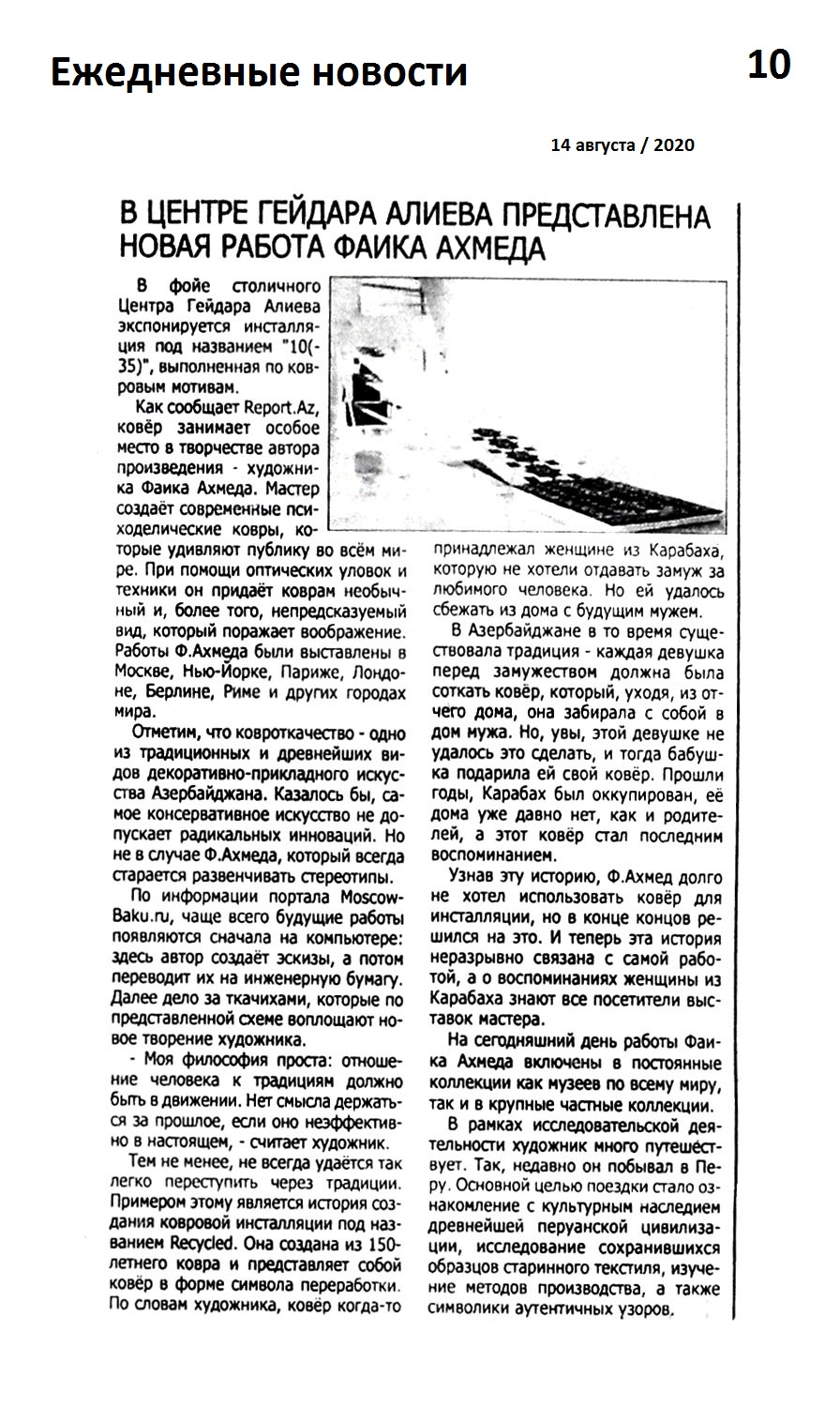 584. В Центре Гейдара Алиева представлена новая работа Фаика Ахмеда: [инсталяция по ковровым мотивам] // Ежедневные новости.- 2020.- 14 августа.- С.10.