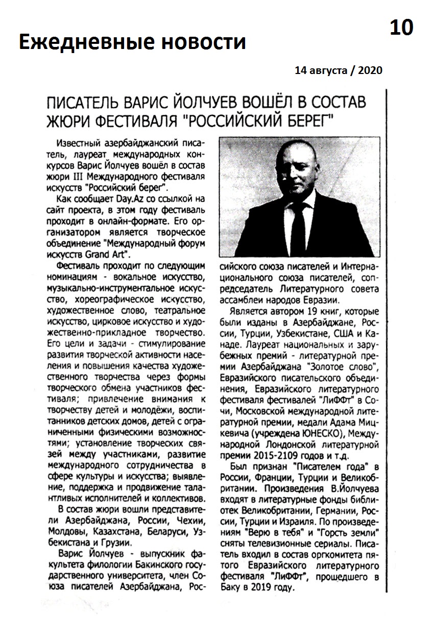 2020.- 29 avqust.- S. 14. 534. Ukraynada yazıçı həmvətənimizə yubiley təltifi: