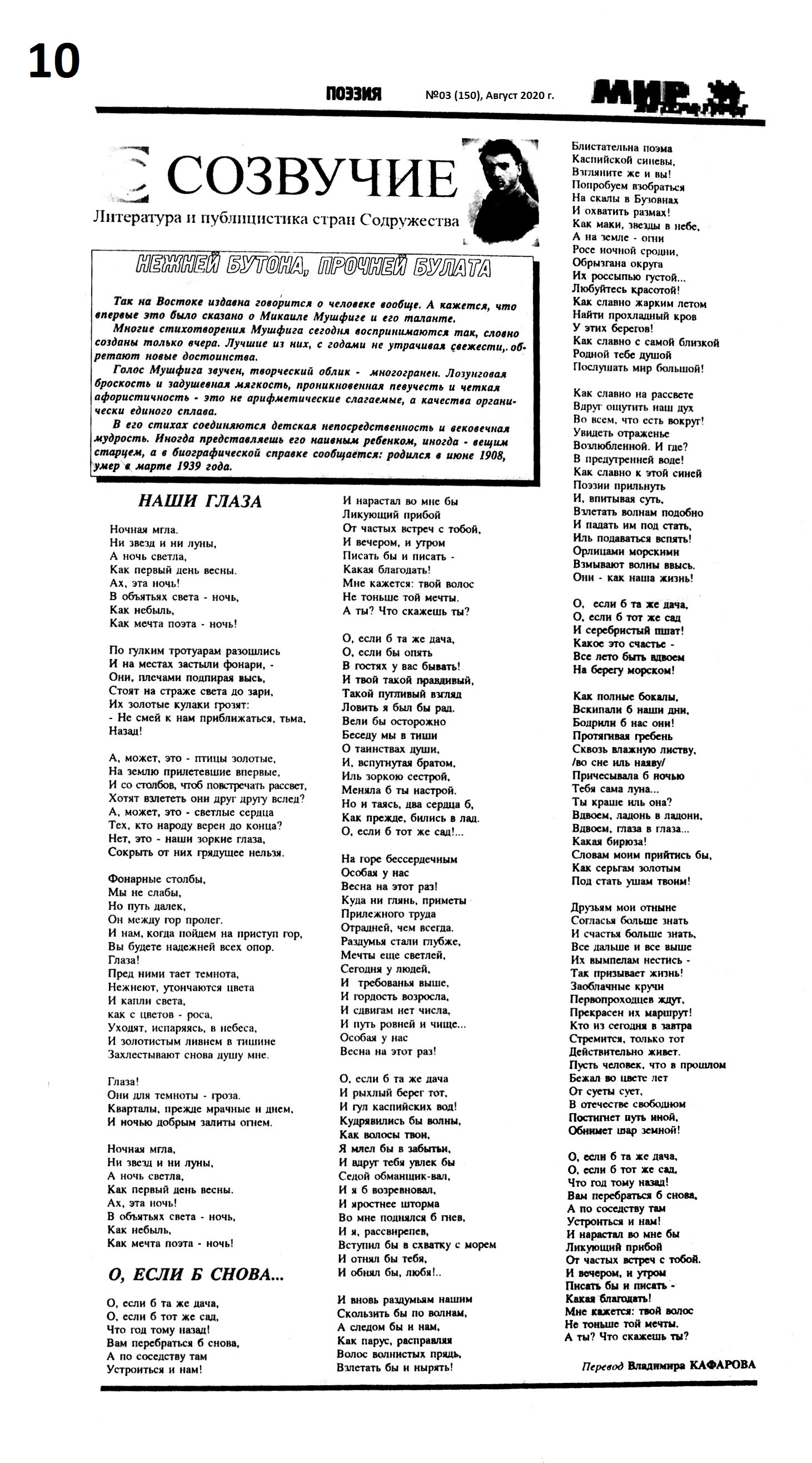 619. Мушфиг, М. Наши глаза; О, если бы снова…Стихи // Мир литературы.- 2020.- № 3(150), август.- С. 10.