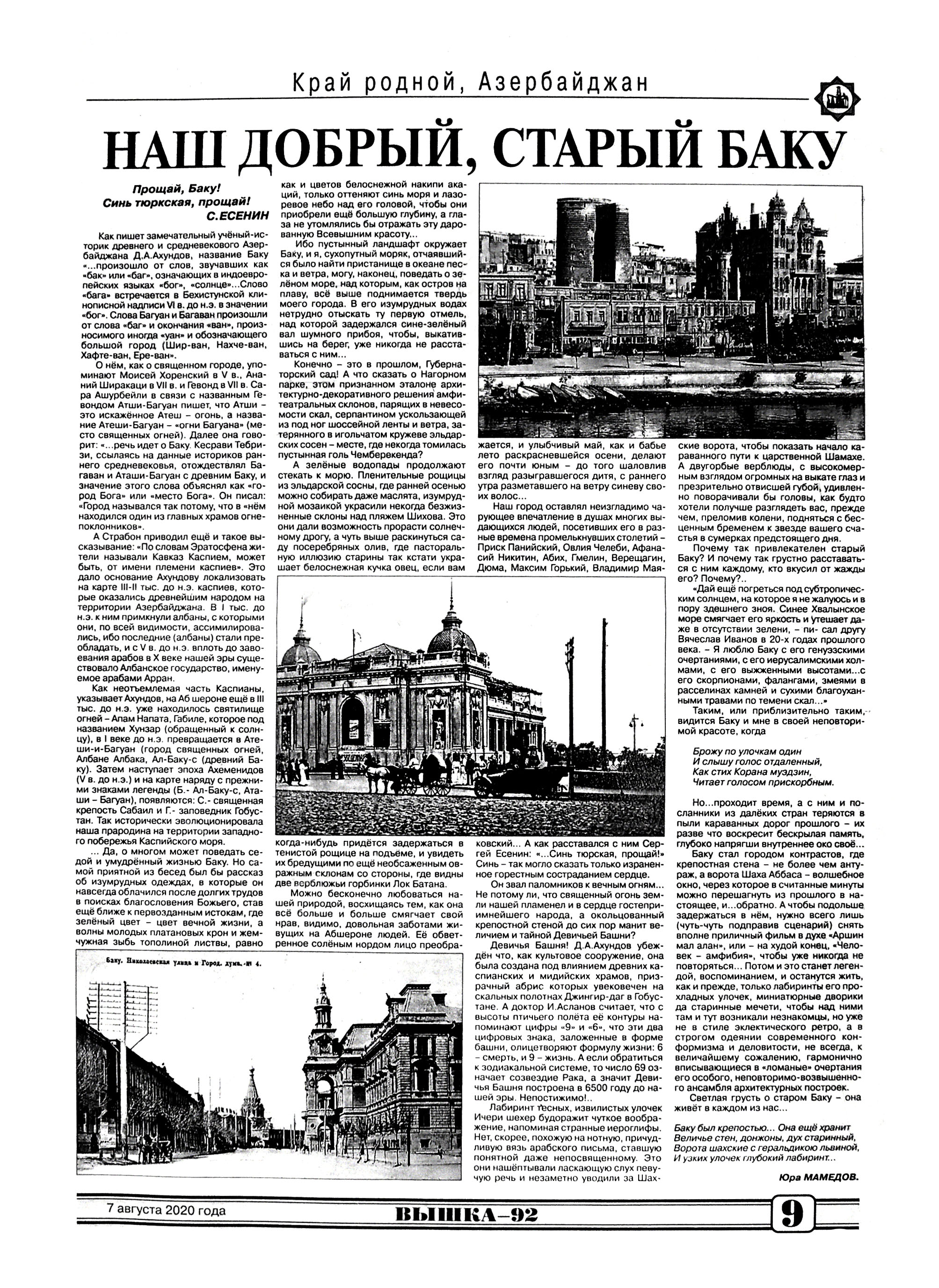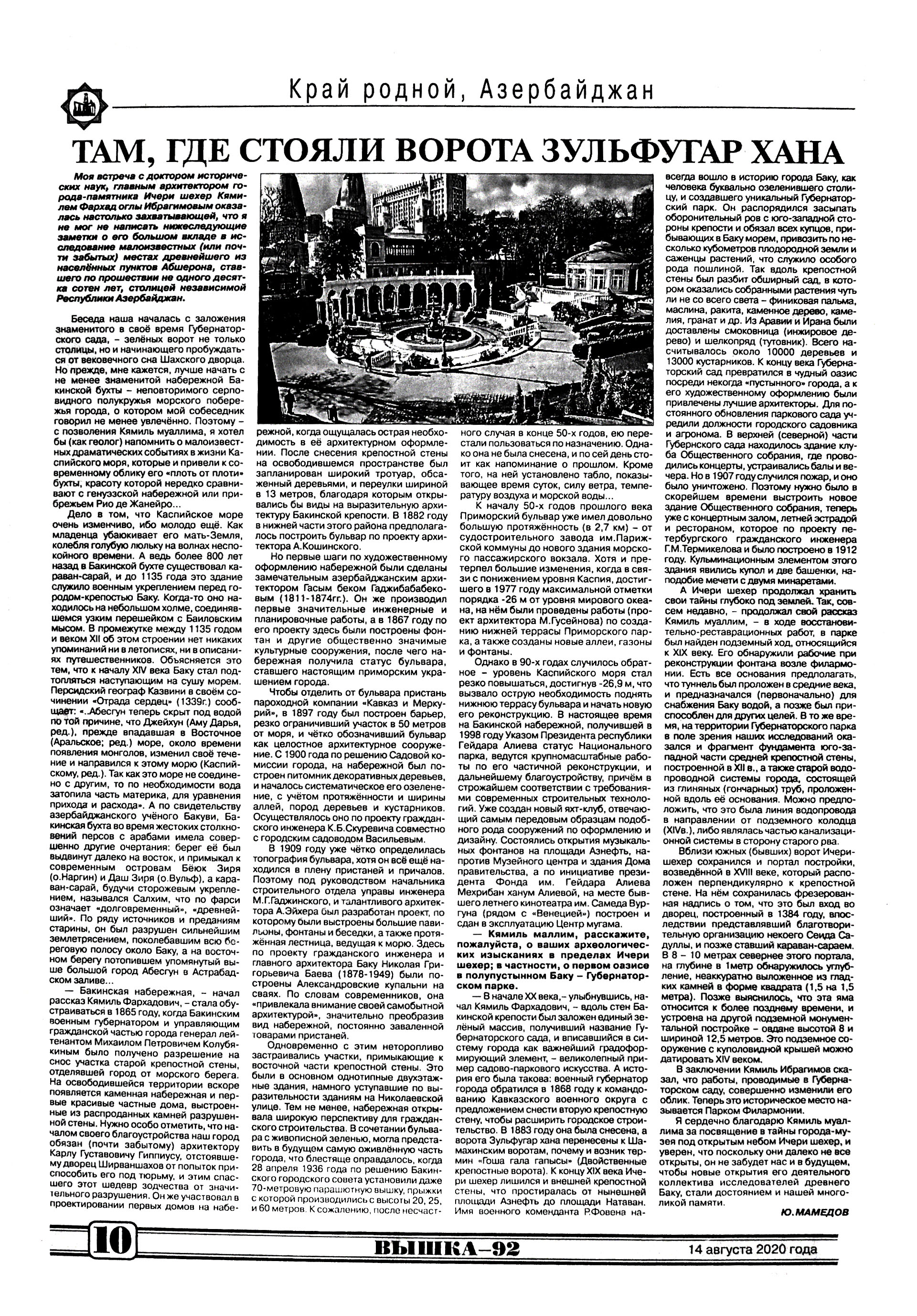 571. Алиев, Э. Архитектор Эльчин Алиев: Тысячи архитектур-ных зданий в Азербайджане нуждаются в реставрации [интервью] // Неделя.- 2020.- 14 августа.- С.20. 572. Ибрагимов, К. Там, где стояли ворота Зульфугар хана: [беседа с главным архитектором города-памятника Ичери ше-хер К.Ибрагимовым] /провел Ю.Мамедов // Вышка.- 2020.- 14 августа.- С.10. 573. Мамедов, Ю. Наш добрый, старый Баку: [о памятниках истории и культуры] // Вышка.- 2020.- 7 августа.- С. 9.