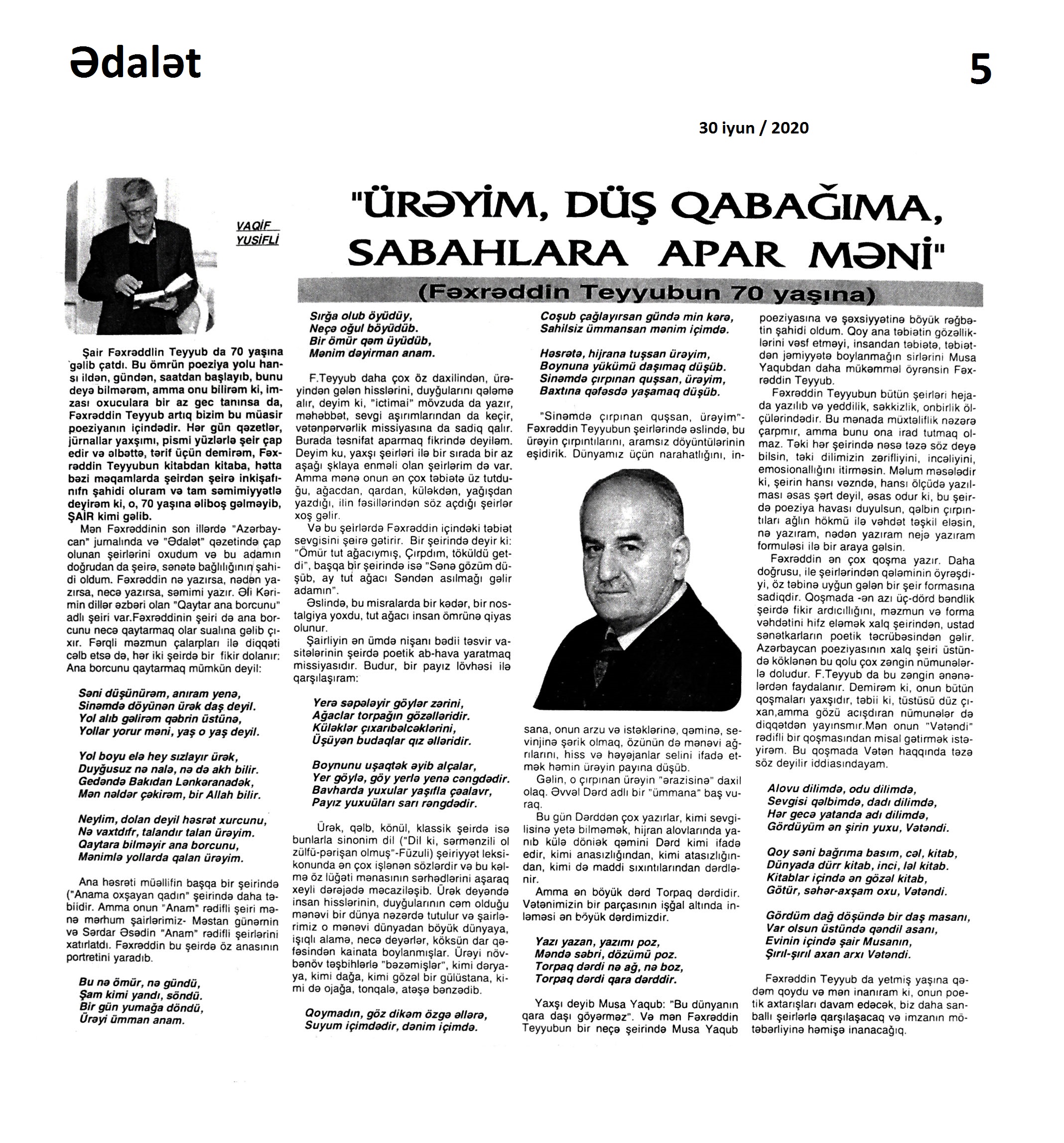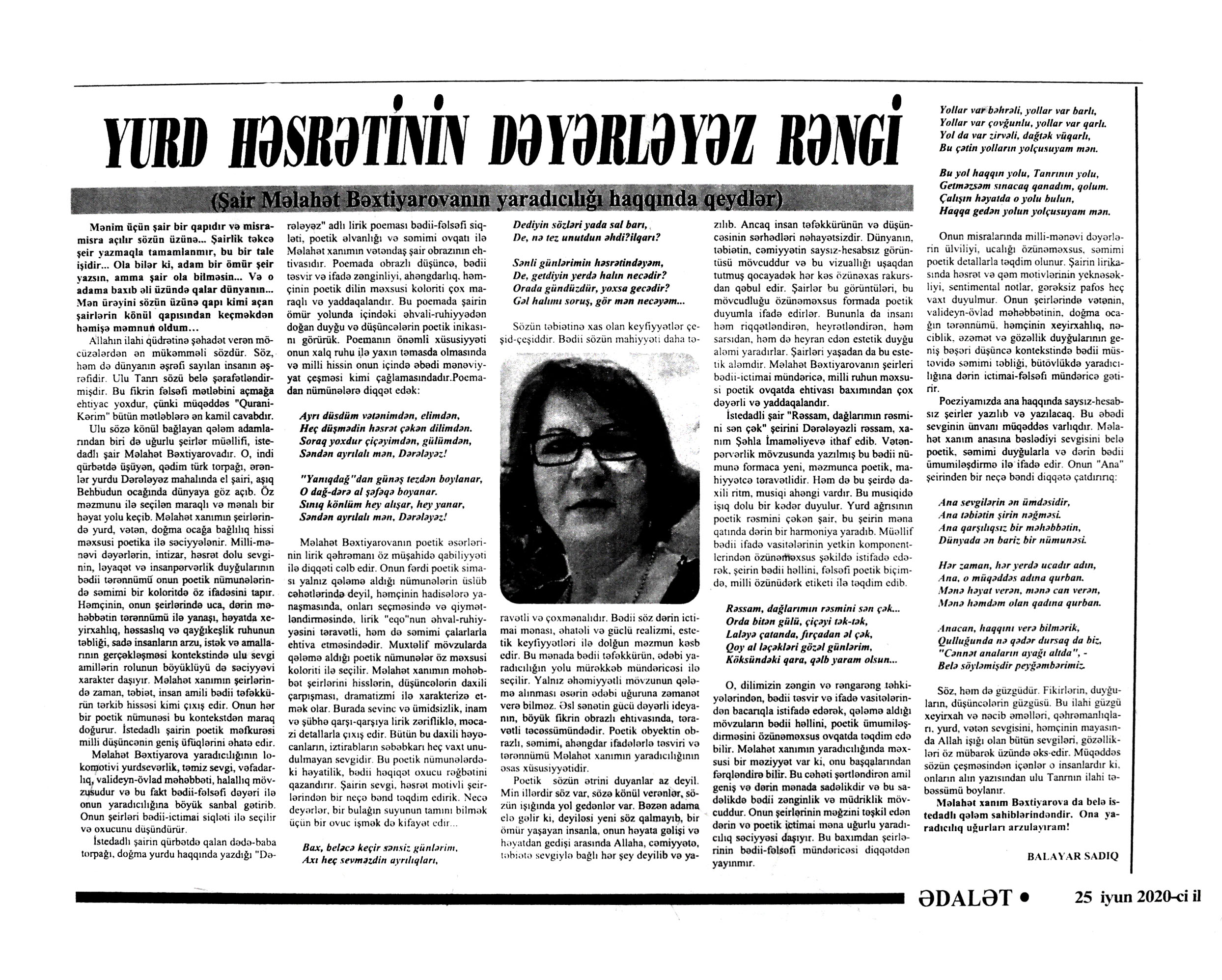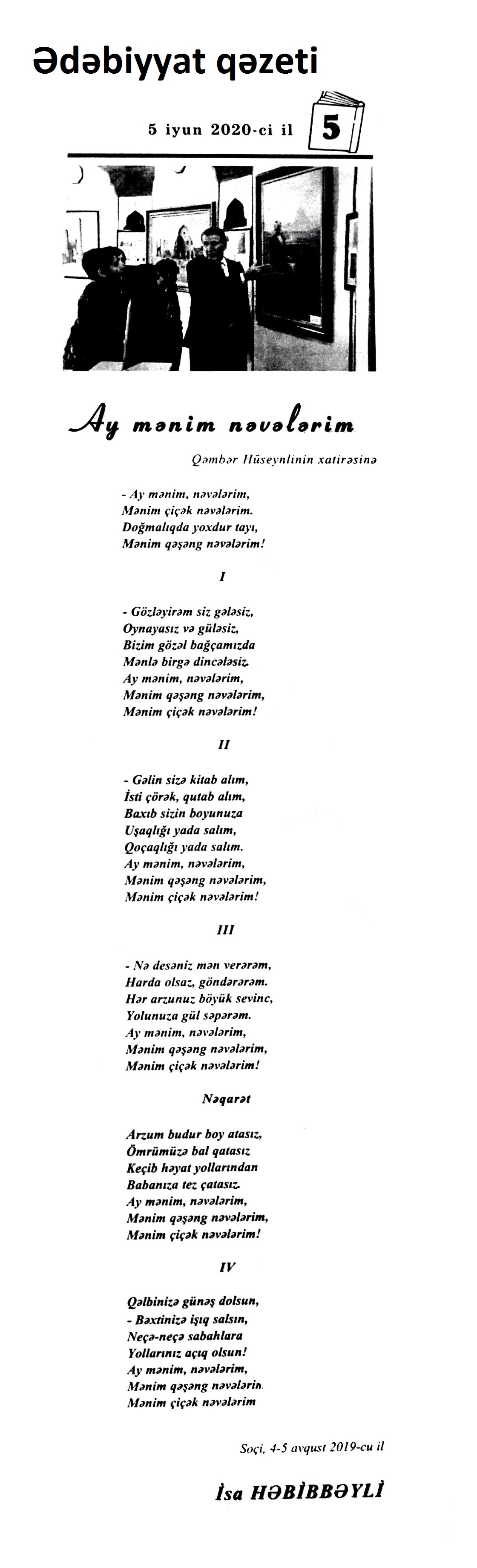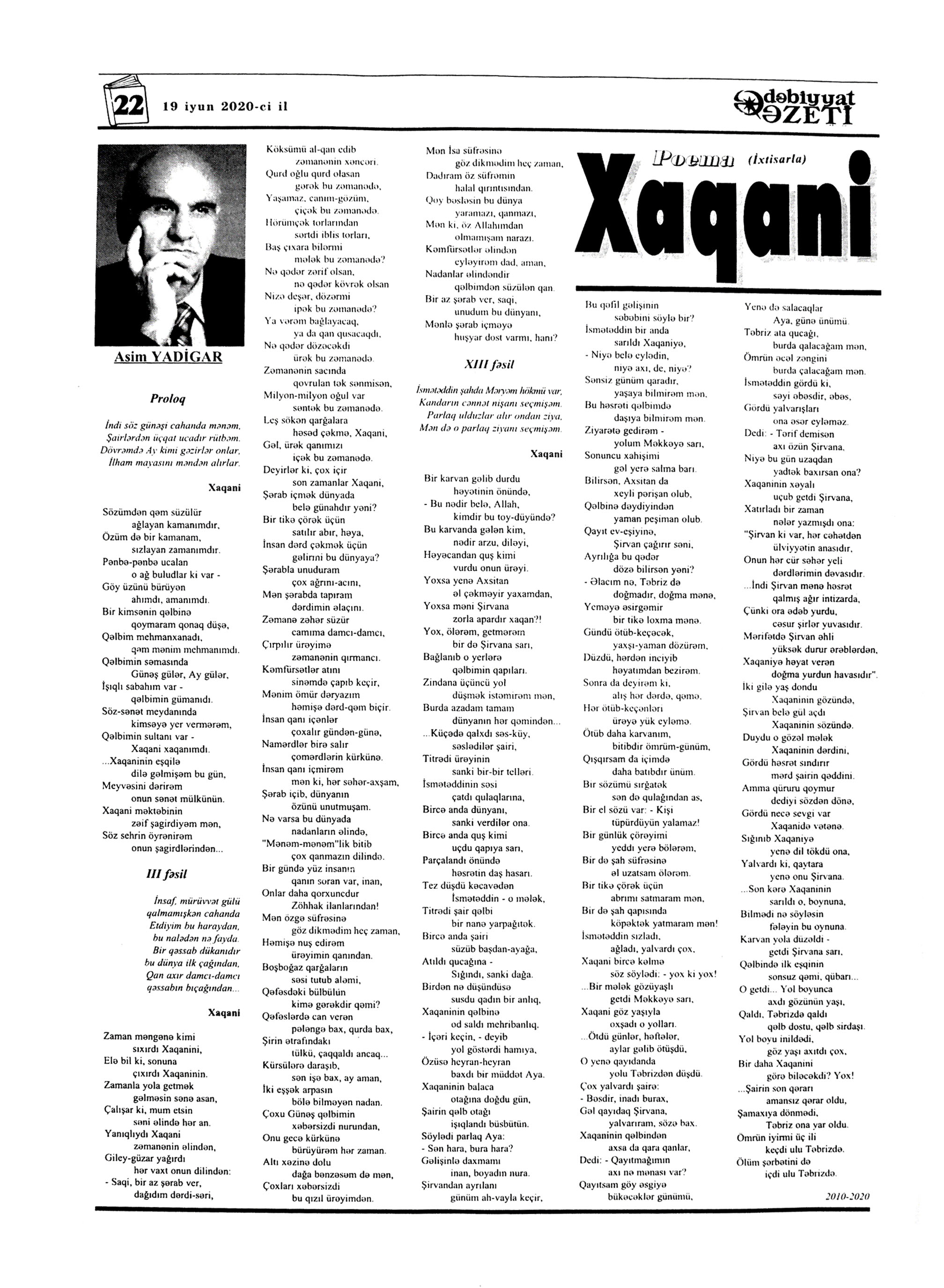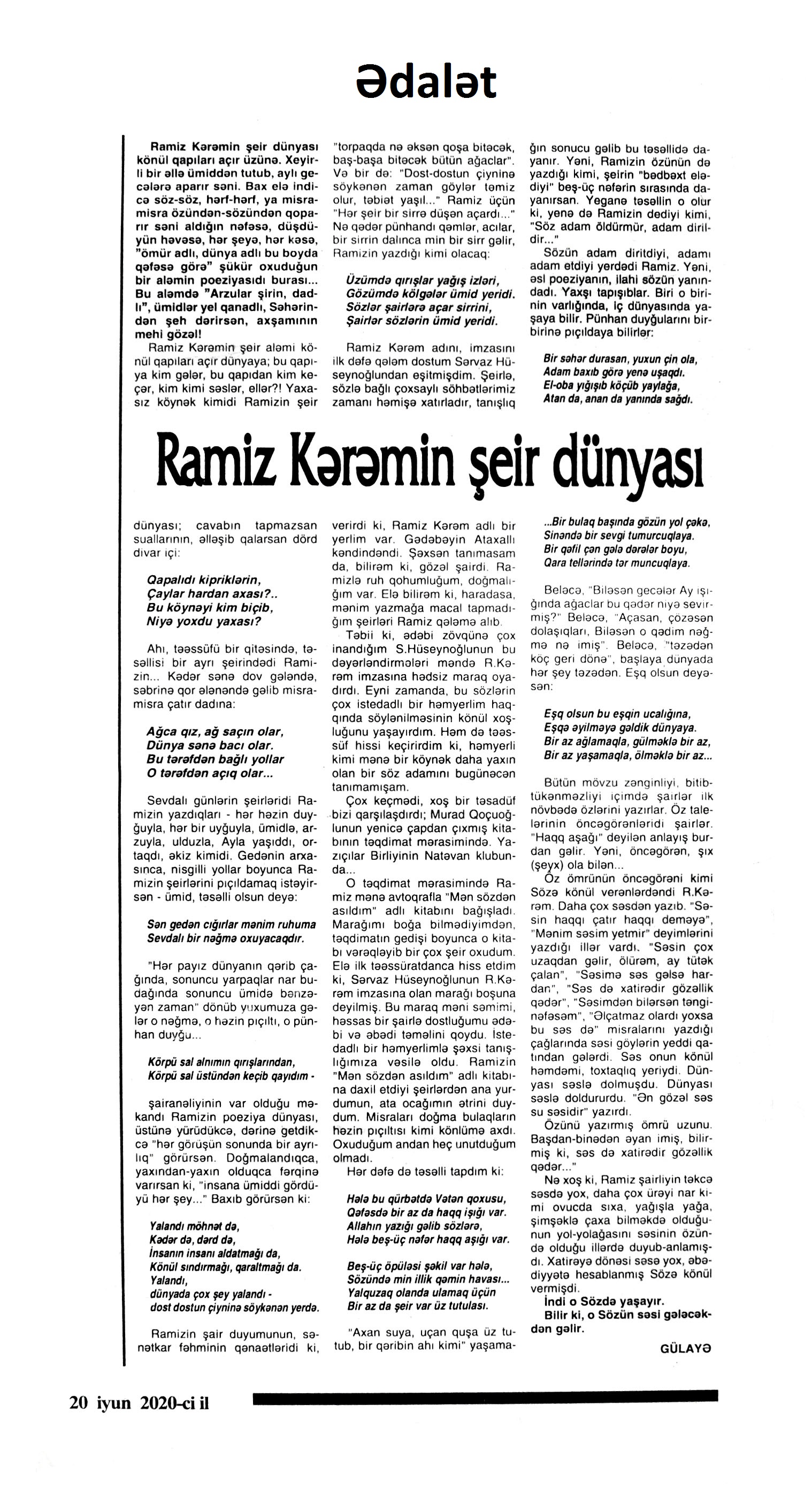 POEMALAR 331. Xələfli, Ə. R. Bir acı xatirə var: II Cahan savaşında qurban gedənlərin xatirəsinə // Kredo.- 2020.- 18 iyun.- S.8-9. 332. Xələfli, Ə. R. Bir atanın düzyolu: Azadlıq yolunda qurban gedənlərin xatirəsinə // Kredo.- 2020.- 11 iyun.- S.8-9. 333. Xələfli, Ə. R. Dönməzlik yolu: “Azadlıq eşqinə bir yarpaq” poemasına əlavə və şərh // Kredo.- 2020.- 4 iyun.- S.9. 334. Xələfli, Ə. R. Hər ocağın öz işığı // Kredo.- 2020.- 22 iyun.- S.8-9. 335. Xələfli, Ə. R. Ölüm maşınının ağzında: Azadlıq yolunda qurban gedənlərin xatirəsinə // Kredo.- 2020.- 4 iyun.- S.8-9. 336. Yadigar, A. Xaqani: poema (ixtisarla) // Ədəbiyyat qəzeti.- 2020.- 19 iyun.- S. 22. ; Ədalət.- 2020.- 20 iyun.- S. 14.