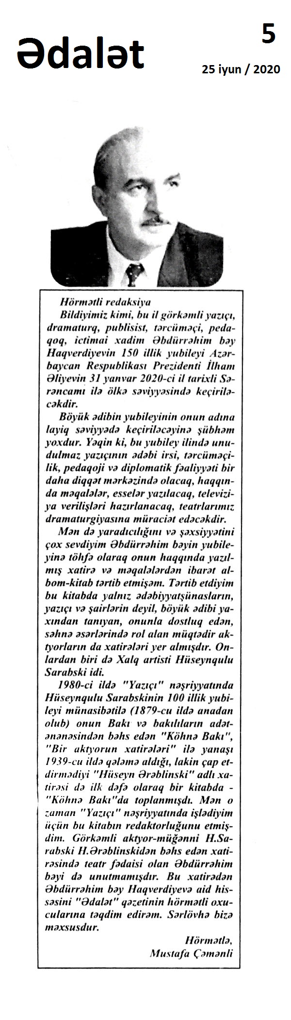 Əbdürrəhim bəy Haqverdiyev – 150 521. Abbaslı, T. Ünlü ulularımızdan: mənən-mədəniyyətən də Bəy – Əbdürrəhim bəy Haqverdiyev... // Mədəniyyət.- 2020.- 24 iyun.- S.1;6. 522. Abbasova, A. Əbdürrəhim bəy Haqverdiyevin “Pəri-cadu” əsərində xtonik varlıqlar // Kaspi.- 2020.- 26-29 iyun.-S.12;13. 523. Çəmənli, M. Hörmətli redaksiya: [müəllifin “Hüseynqulu Sarabski: Əbdürrəhim bəy Haqverdiyev” adlı məqaləsini redaksiyaya təqdim etməsi haqqında] // Ədalət.- 2020.- 25 iyun.- S. 5. 524. Əbdürrəhim bəy Haqverdiyev Mirzə Cəlil haqqında // Respublika.- 2020.- 1 iyun.- S.13. 525. Əbdürrəhim bəy Haqverdiyev – 150: Klassik dram sənətinin korifeyi //Respublika.- 2020.- 1 iyun.- S.13. 526. Xəndan, C. Unudulmaz xatirələr: Əbdürrəhim bəy Haqverdiyev-150: [müəllifin məqaləsi Mustafa Çəmənlinin təqdimatında verilir] // 525-ci qəzet.- 2020.- 5 iyun.- S.21 527. Osmanova, G. Folklorun Əbdürrəhim bəy Haqverdiyevin hekayələrinin poetikasina təsiri // Kaspi.- 2020.- 26-29 iyun.-S.8. 528. Ruhullan, S. Haqverdiyev haqqında xatirələrim - Sidqi Ruhullanın məqaləsi // 525-ci qəzet.- 2020.- 20 iyun.- S.19. 529. Sarabski, H. Əbdürrəhim bəy Haqvediyev: [müəllifin Bakıda 1982-ci ildə çapdan çıxmış “Köhnə Bakı” adlı kitabından xatirələri] //Ədalət. - 2020.- 25 iyun.- S. 5. 530. Şamıoğlu, Ş. Ədibin həyatının ən az öyrənilmiş üç ili...: Əbdürrəhim bəy Haqverdiyev – 150 // Azərbaycan.- 2020.- 2 iyun.- S.10.
