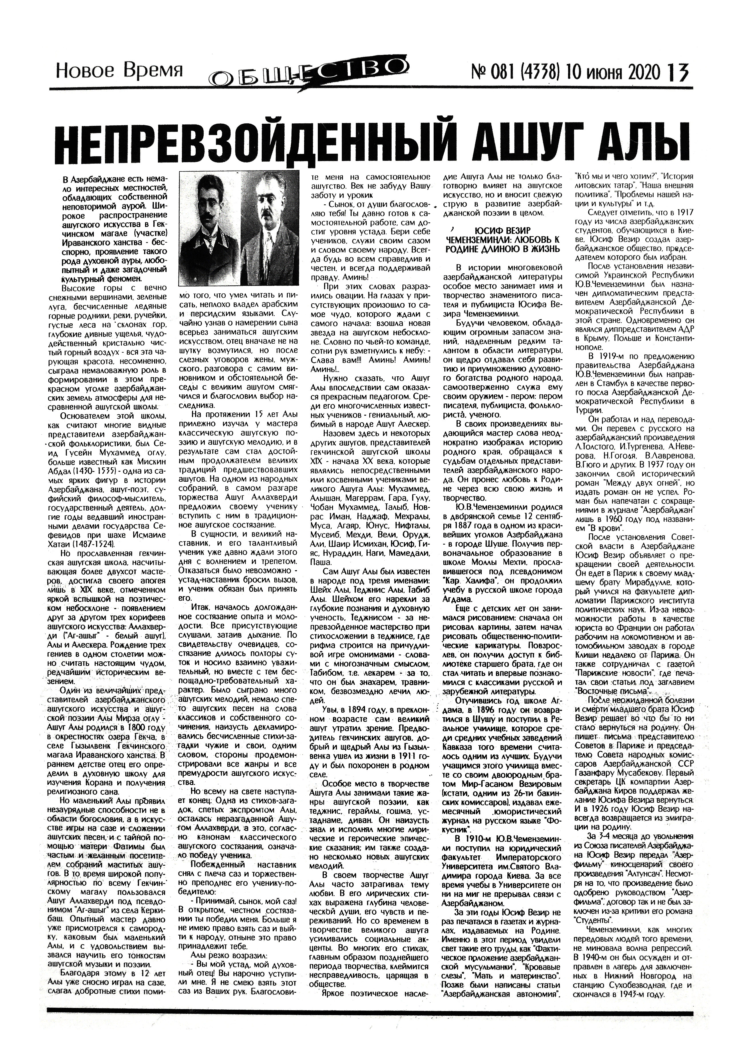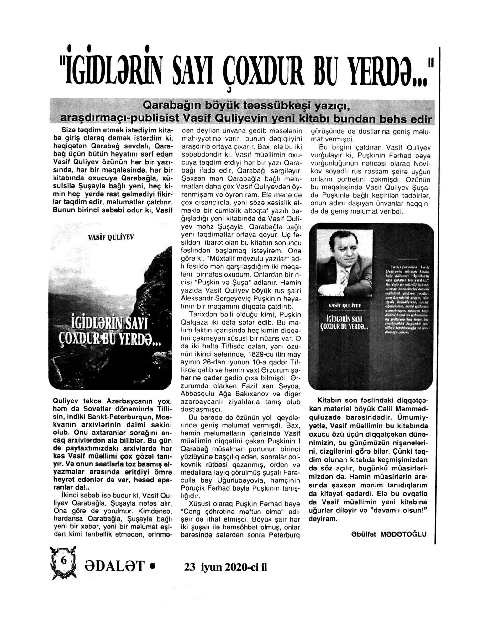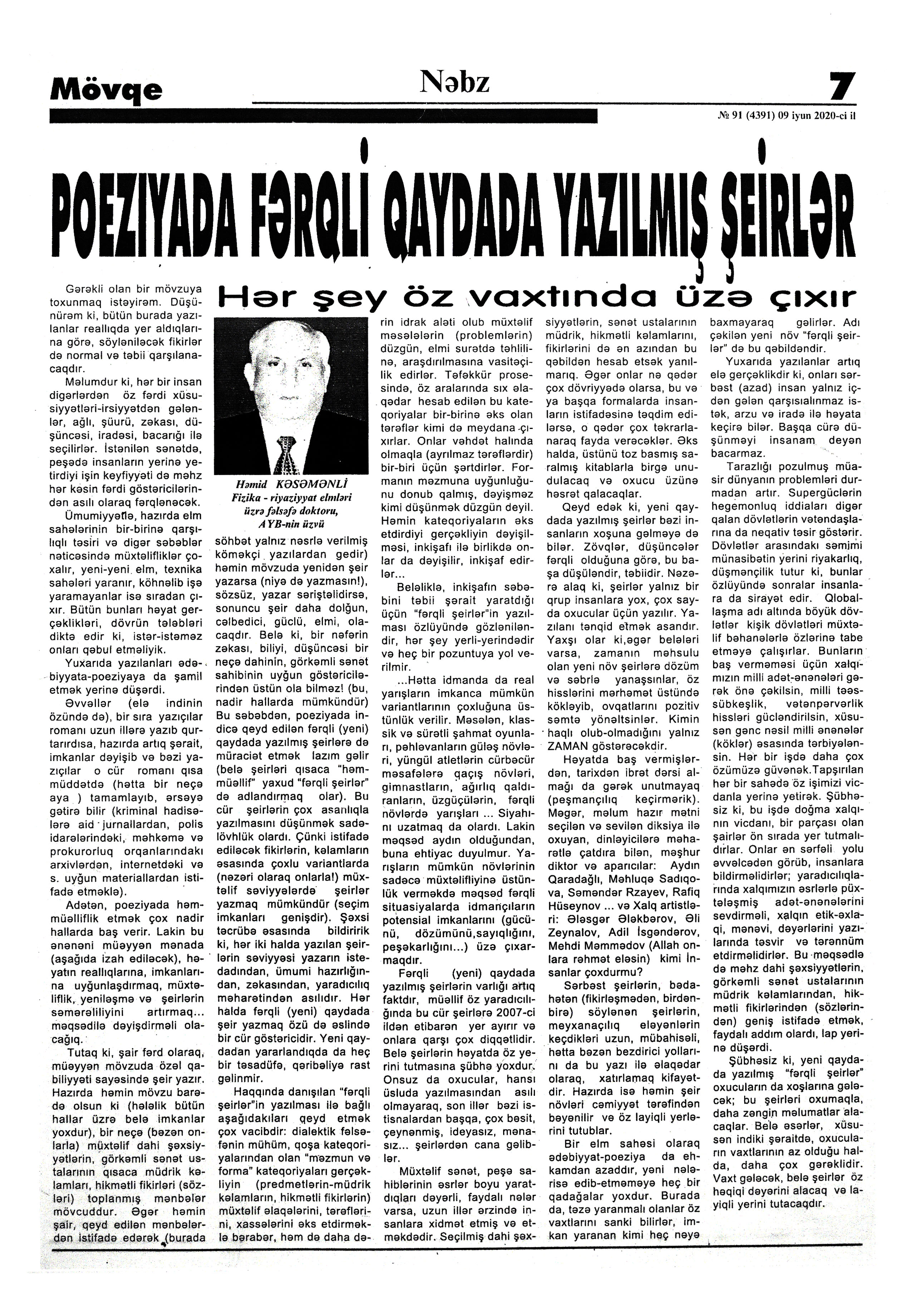 7. Dövlət dili dövlətçilik, suverenlik atributudur: Azərbaycan dili normalarına riayət edilməsi ilə bağlı mühüm dəyişikliklər qüvvəyə minib // Mədəniyyət.- 2020.- 24 iyun.- S.1. 8. Əfəndiyeva, İ. M. Atam haqqında xatirələr: [müəllifin atası Məmmədsadıq Əfəndiyev haqqında] // Ədəbiyyat qəzeti.- 2020.- 12 iyun.- S.10-11. 9. Heydər Əliyev mərkəzlərinin elmi işçiləri üçün növbəti təlim: [Mədəniyyət üzrə Elmi-Metodiki və İxtisasartırma Mərkəzi tərəfindən] // Mədəniyyət.- 2020.- 19 iyun.- S.2. 10. Mədəniyyət və sosial-humanitar elmlərin aktual problemləri: [Daşkənddəki Əlişir Nəvai adına Özbək Dili və Ədəbiyyatı Universitetinin təşkilatçılığ ilə “Mərkəzi Asiyanın mədəni həyatı və sosial-humanitar elmlərin aktual problemləri” adlı videokonfransın keçirilməsi haqqında] // Mədəniyyət.- 2020.- 3 iyun.- S.3. 11. Məhəbbətoğlu, Q. Mədəniyyətimizin bugünkü inkişafı üçün Ulu Öndərimizə borcluyuq // İki sahil.- 2020.- 13 iyun.- S.15. 12. Məmmədli, N. Bölgələrdə mədəni həyat: Bölgələrdə mədəni həyat // Mədəniyyət.- 2020.- 26 iyun.- S.4. 13. Məmmədli, N. Bölgələrin mədəniyyət gündəliyindən // Mədəniyyət.- 2020.- 5 iyun.- S.3. 14. Məmmədli, N. Regional mədəniyyət idarələrindən xəbərlər // Mədəniyyət.- 2020.- 10 iyun.- S.4. 15. Məmmədli, N. Yerlərdəki mədəniyyət müəssisələrindən xəbərlər // Mədəniyyət.- 2020.- 24 iyun.- S.4. 16. Muradova, S. Heydər Əliyev və dəyərlərə qayıdış // Kredo.- 2020.- 18 iyun.- S.3;5.