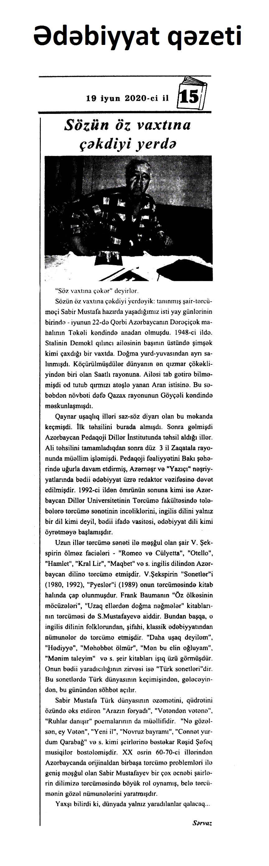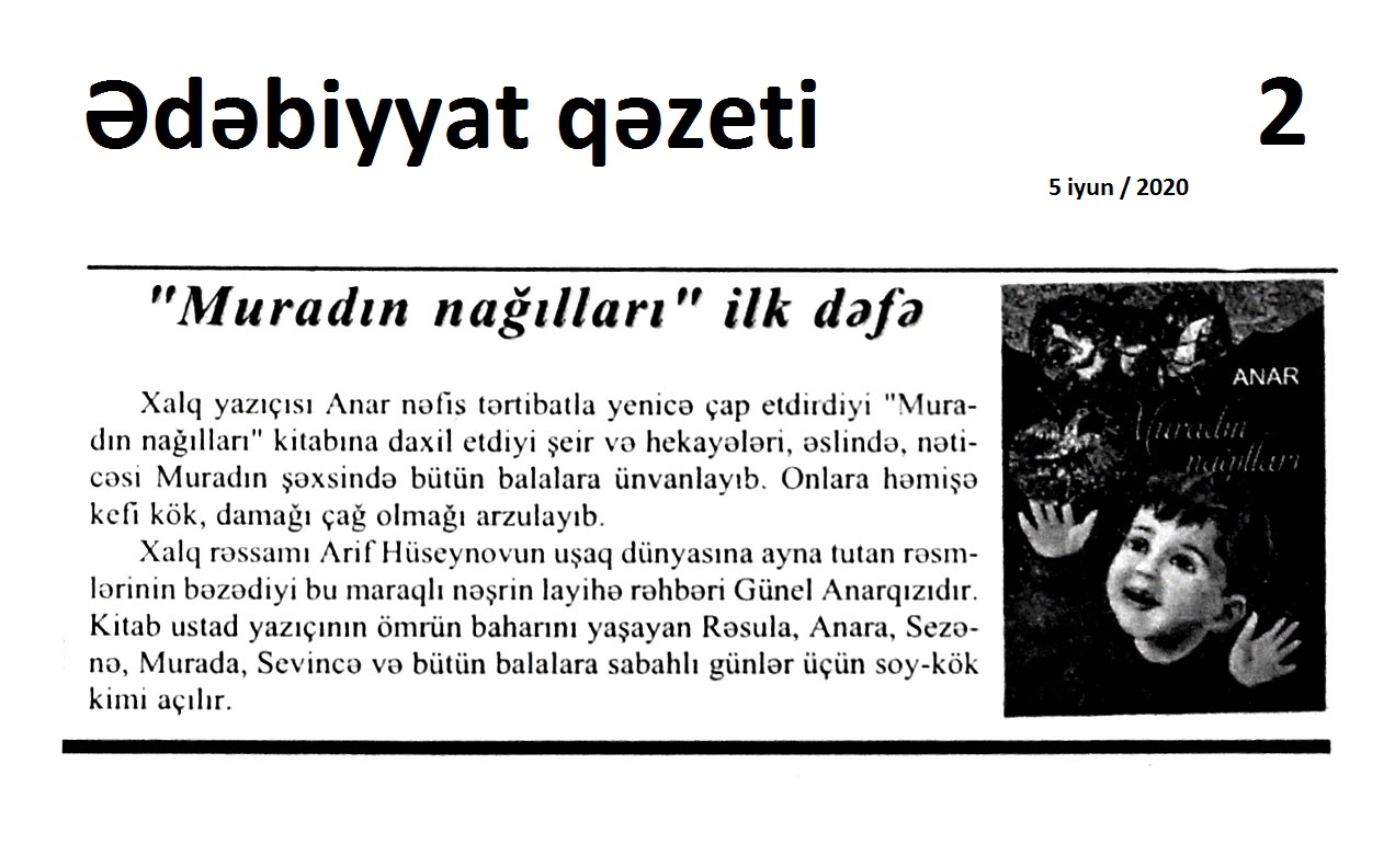 IV. ƏDƏBİYYATŞÜNASLIQ 351. Abbas, A. “Batmanqılınc”: [Qarabağda cərəyan edən hadisələrdən bəhs edən roman haqqında] // Ədalət.- 2020.- 11 iyun.- S.5. 352. Abbasov, İ. atalar nə deyibsə, düz deyib…; yaxud “Əlində qayçı qoyun otarmaq” nə deməkdir?: [atalar sözləri haqqında] // Ədəbiyyat qəzeti.- 2020.- 12 iyun.- S.28. 353. Ağsəs, Q. Yeddi il və yeddi gün: Fərqanə Mehdiyevanın əziz xatirəsinə // 525-ci qəzet.- 2020.- 3 iyun.- S.17. 354. Axundov, M. X. Cəlil Məmmədquluzadə və Həmidə xanım barədə təəssüratım // 525-ci qəzet.- 2020.- 12 iyun.- S.15. 355. Axundova, M. X. Cəlil Məmmədquluzadə və Həmidə xanım: Təəssüratım: [pedaqoq, şair Mirzə Xosrov Axundovun təəssüratları] // Kredo.- 2020.- 11 iyun.- S.4. 356. Axundova, M. X. Pedaqoq-maarifçi və şair Mirzə Xosrov Axundov: [yaradıcılığı haqqında] // 525-ci qəzet.- 2020.- 12 iyun.- S.15. 357. Akimova, E. S. Gəlin narahat olaq: dərsliklərdəki problemlər, ədəbiyyatdan uzaq salınan uşaqlar // Ədəbiyyat qəzeti.- 2020.- 5 iyun.- S.18-19. 358. Albalıyev, Ş. Deyimlər - yozumlar // Kredo.- 2020.- 4 iyun.- S.15. 359. Allahmanlı, M. Q. Unudulmaz elm xadimi, görkəmli pedaqoq və nəcib insan: [Məhəmməd Balayev haqqında] // Respublika.-2020.- 4 iyun.- S.6. 360. Allahverdiyev, C. Hidayət və İrəvan ədəbi-mədəni mühiti // 525-ci qəzet.- 2020.- 3 iyun.- S.15. 361. Anar. “Cavabsız qoymaq istəmədim”: [Xalq yazıçısına unvanlanan məktuba cavab] // Ədəbiyyat qəzeti.- 2020.- 12 iyun.- S.2. 362. Anar. Uşaq ədəbiyyatımızın qaynağı folklorumuzdur // Ədəbiyyat qəzeti.- 2020.- 5 iyun.- S.2. 363. Anarın povestləri “Roman qazeta”da: [Anarın Moskvada “Göz muncuğu” adıyla nəşr olunan kitabı haqqında] // Ədəbiyyat qəzeti.- 2020.- 12 iyun.- S.2. 364. Aras, O. Kamal Abdulla və Şərqin sirləri // Ədəbiyyat qəzeti.- 2020.- 19 iyun.- S. 27. 365. Aslanova, A. Göz yaşlarından doğan sənət: [ədəbiyyatda sentimentalizm haqqında] // Kaspi.- 2020.- 10 iyun.- S.8. 366. Atatürkü ağladan mahnı, “şeirin Rəsulzadəsi”, talan olan diyar... - Şəhidziyalı: [şair Əhməd Cavadın yazdığı və Üzeyir Hacıbəylinin bəstələdiyi “Çırpınırdı qara dəniz” mahnısı haqqında] // Türküstan .- 2020.- 2-8 iyun.- S.24. 367. Aytel, İ. Ağ işıq: Və yaxud “ölümü öldürüb” dünyaya gələn şairin 70-inə salam: [şair Musa Ələkbərlinin yubileyi münasibətilə] // Ədəbiyyat qəzeti.- 2020.- 12 iyun.- S.11. 368. Azər, A. Essevari fikirlər // Ədəbiyyat qəzeti.- 2020.- 12 iyun.- S.25. 369. Azərbaycan ədəbiyyatında alleqoriya: [filologiya üzrə elmlər doktoru Lalə Əlizadənin eyniadlı kitabı haqqında] // Mədəniyyət.- 2020.- 5 iyun.- S.7. 370. “Azərbaycan mühacirət ədəbiyyatı kitabxanası”ndan yeni cild: [Nizami Gəncəvi adına Ədəbiyyat İnstitutunun eyniadlı layihəsi Səlim Rəfiq Rəfioğluya həsr edilib] // Mədəniyyət.- 2020.- 12 iyun.- S.7. 371. Babayev, Y. Qarabağ ədəbi-mədəni mühitinin XIX-XX əsrlər mərhələsinə qədər onun keçdiyi tarixi inkişaf yolunun mənzərəsi: [filologiya üzrə fəlsəfə doktoru Səbinə Əhmədovanın “Qarabağ ədəbi-mədəni mühiti” adlı monoqrafiyası haqqında] // Ədəbiyyat qəzeti.- 2020.- 19 iyun.- S. 23. 372. Babayeva, G. Qarabağ ədəbi-mədəni mühitinin tarixi yeni baxış müstəvisində: [Səbinə Əhmədovanın eyniadlı monoqrafiyası] // 525-ci qəzet.- 2020.- 10 iyun.- S.23. 373. Bağırlı, A. Heydər Əliyevin obrazı dramaturgiyada və teatrda: [Ümummilli liderimiz haqqında yazılan dram əsərləri və onların səhnə həyatı görməsi haqqında] // Respublika.- 2020.- 20 iyun.- S.5. 374. Bağırlı, A. Qafiyəm ol, uşaq təbəssümü: Vaqif Səmədoğlunun poeziyasında uşaq dünyası // Ədəbiyyat qəzeti.- 2020.- 12 iyun.- S.5. 375. Balayar, S. Yurd həsrətinin Dəyərləyəz rəngi: Şair Məlahət Bəxtiyarovanın yaradıcılığı haqqında qeydlər // Ədalət.- 2020.- 25 iyun.- S. 7. 376. Barat, E. Poeziyanın riyazi ifadəsi: Rafail Tağızadənin şeirlərində qeyri-səlis məntiq // Ədəbiyyat qəzeti.- 2020.- 19 iyun.- S. 31. 377. Bayramova, S. Zahid Xəlil - uşaq ədəbiyyatının böyük ismi // Ədəbiyyat qəzeti.- 2020.- 5 iyun.- S.31. 378. Bu dünya dəmyə dünyadı...: 5 iyun Vaqif Səmədoğlunun doğum günüdür // Mədəniyyət.- 2020.- 5 iyun.- S.1. 379. Cavad Heyətin 95 illiyinə həsr olunan videoseminar: [Nizami Gəncəvi adına Milli Azərbaycan Ədəbiyyatı Muzeyində həkim, ədəbiyyatşünasın yubileyi ilə əlaqədar keçirilən tədbir haqqında] // Mədəniyyət.- 2020.- 10 iyun.- S.4. 380. Cəfərov, N. Q. “Günlər keçir. ancaq izsiz yox...”: “Üç nöqtə” qəzetinin qonaği Nizami Cəfərovdur: [ədəbiyyatşünas alimin xatirələri] / hazırladı Pünhan Əfəndiyev // Üç nöqtə.- 2020.- 18 iyun.- S.14. 381. Cəfərov, N. Q. “Günlər keçir. ancaq izsiz yox...”: Nizami Cəfərov: O qədər mehriban mühit yaratdı ki, cəsarətlənib bir -iki sual da mən verdim...: [ədəbiyyatşünas alimin xatirələri] / hazırladı Pünhan Əfəndiyev // Üç nöqtə.- 2020.- 20 iyun.- S.14. 382. Cəfərov, N. Q. “Yavaş-yavaş ahıllaşıram”: Nizami Cəfərov: Keçən günlər barəsində daha tez-tez düşünürəm: [ədəbiyyatşünas alimin xatirələri] / hazırladı Pünhan Əfəndiyev // Üç nöqtə.- 2020.- 9 iyun.- S.14. 383. Cəfərov, N. Q. “Yavaş-yavaş ahıllaşıram”: Nizami Cəfərov: Orta məktəbdə oxuyanda jurnalist olmaq istəyirdim...: [ədəbiyyatşünas alimin xatirələri] / hazırladı Pünhan Əfəndiyev // Üç nöqtə.- 2020.- 11 iyun.- S.14 384. Cəfərov, N. Q. “Yavaş-yavaş ahıllaşıram”: Nizami Cəfərov: Keçən günlər barəsində daha tez -tez düşünürəm: [ədəbiyyatşünas alimin xatirələri] / hazırladı Pünhan Əfəndiyev // Üç nöqtə