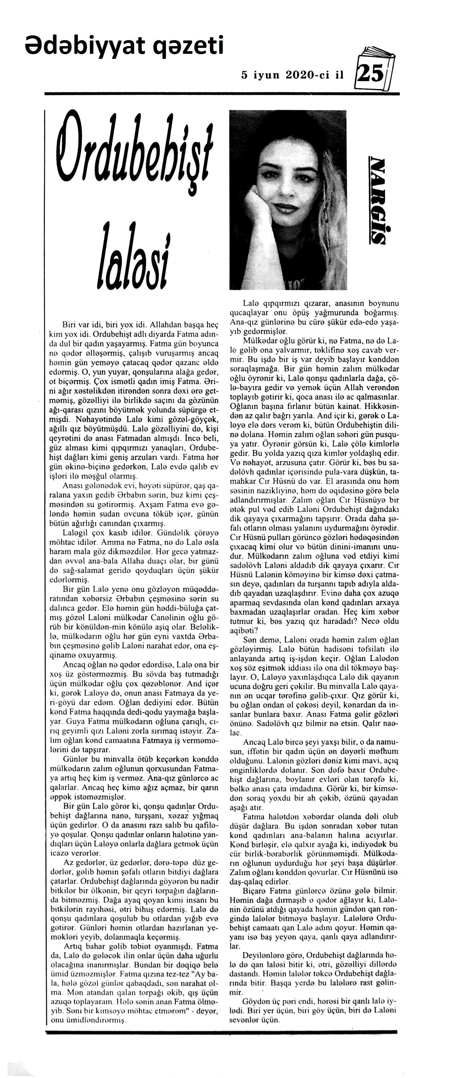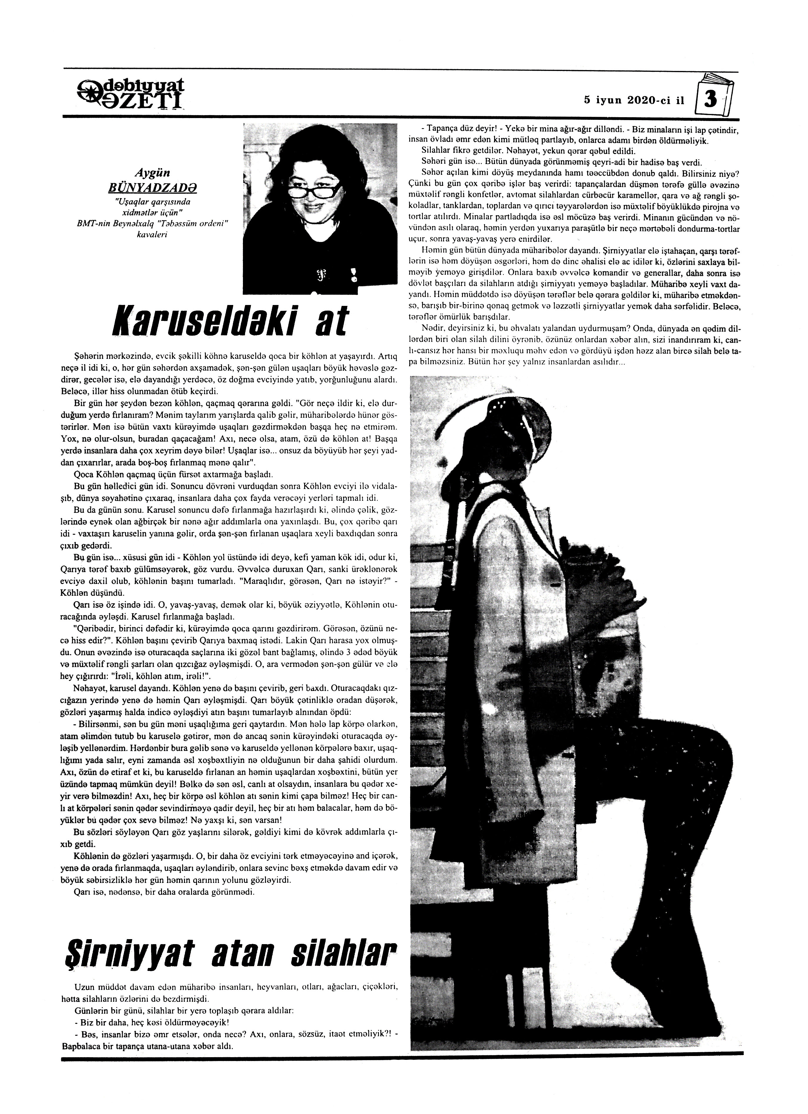 HEKAYƏLƏR. NAĞILLAR 283. Abasıyanık, S. F. İpək dəsmal: [türk ədəbiyyatı] / tərc. etdi Əjdər Ol // Kaspi.- 2020.- 10 iyun.- S.9. 284. Abasıyanık, S. F. Uzun Ömər: [türk ədəbiyyatı] / tərc. etdi Əjdər Ol // Kaspi.- 2020.- 10 iyun.- S.9. 285. Abdullayev, Z. Seyid baba // Ədalət.- 2020.- 5 iyun.- S.16. 286. Amanova, S. B. Xarıbülbül // Ədəbiyyat qəzeti.- 2020.- 5 iyun.- S.29. 287. Andre, P. Uşaq və üfüq: Səhra müdriklərinin hekayətləri: [fransız ədəbiyyatı] / tərc. etdi Fərid Hüseyn // Kaspi.- 2020.- 10 iyun.- S.7. 288. Azər, Ş. Unutmaməni: [fars ədəbiyyatı] / tərc. etdi Məhəmməd Nuri // Kaspi.- 2020.- 13-16 iyun.- S.9. 289. Bərdəli, B. On dörd gün karantində // Ədəbiyyat qəzeti.- 2020.- 19 iyun.- S. 20; 21. 290. Bünyad, Y. Bəlkə də bir yuxudu // Ədəbiyyat qəzeti.- 2020.- 19 iyun.- S. 26; 27. 291. Bünyadzadə, A. “Karuseldəki at”; “Şirniyyat atan silahlar” // Ədəbiyyat qəzeti.- 2020.- 5 iyun.- S.3. 292. Ərşad, A. Yol əhvalatı // Azad Azərbaycan.- 2020.- 18 iyun.- S.7. 293. Əsgərova, T. Qayğı // Kaspi.- 2020.- 20-22 iyun.- S.15. 294. Hacı, K. Cənnət alması // Kaspi.- 2020.- 26-29 iyun.-S.14. 295. Həsənoğlu, H. Ağ vərəqlər // Azad Azərbaycan.- 2020.- 5 iyun.- S.7. 296. Həsənoğlu, H. Tənbeh // Azad Azərbaycan.- 2020.- 9 iyun.- S.7. 297. Hüseyn X. Ə. Qan qoxusu // Kredo.- 2020.- 18 iyun.- S.14. 298. Hüseyn X. Ə. Qan qoxusu // Kredo.- 2020.- 22 iyun.- S.14. 299. İdrisoğlu, A. Tayqulaqlar ölkəsi // Azad Azərbaycan.- 2020.- 18 iyun.- S.7. 300. İsabəyli, Q. İ. Bir hekayə, iki nağıl; Beş dost; Dəvəylə hörümçək; Görünməz və Alabəzək Kos // Ədəbiyyat qəzeti.- 2020.- 5 iyun.- S.13. 301. Korotkeviç, V. S. Çovğun: [belarus ədəbiyyatı] / tərc. etdi Xanım Aydın // Kaspi.- 2020.- 26-29 iyun.-S.9. 302. Qubalı, G. Dəniz adlı bir dünya // Ədalət.- 2020.- 9 iyun.- S.8. 303. Markes, Q. Q. Dünyanın ən gözəl ölüsü: [Kolumbiya ədəbiyyatı] / tərc. etdi Natiq Səfərov // Türküstan.- 2020.- 23-29 iyun.- S.23. 304. Məhərrəmov, V. Kiçiklərin böyüklərə böyük dərsi // Ədalət.- 2020.- 5 iyun.- S.10. 305. Məmmədli, İ. Elçilik // Ədəbiyyat qəzeti.- 2020.- 19 iyun.- S. 9. 306. Məmmədli, İ. M. Qələm // 525-ci qəzet.- 2020.- 20 iyun.- S.21. 307. Məmmədli, N. Ə. Qara kvadrat // Türküstan.- 2020.- 23-29 iyun.- S.16. 308. Mina, R. “Qayğıkeş külək” // Ədəbiyyat qəzeti.- 2020.- 5 iyun.- S.9. 309. Nargis. Ordubebişt laləsi // Ədəbiyyat qəzeti.- 2020.- 5 iyun.- S.25. 310. Piri, E. Əyyaş ata: Hekayə esse // Ədəbiyyat qəzeti.- 2020.- 19 iyun.- S. 11. 311. Rəxşanlı, R. Niyalın yamacında // Kredo.- 2020.- 4 iyun.- S.14. 312. Semyonov, Y. Qayıtma: [rus ədəbiyyatı] / tərc. etdi Həsən Tağıyev // Kaspi.- 2020.- 13-16 iyun.- S.14;15. 313. Turan, T. Xalça oğrusu // Türküstan.- 2020.- 23-29 iyun.- S.22. 314. Yusifqızı, R. Təranənin arzusu // Ədəbiyyat qəzeti.- 2020.- 5 iyun.- S.27.