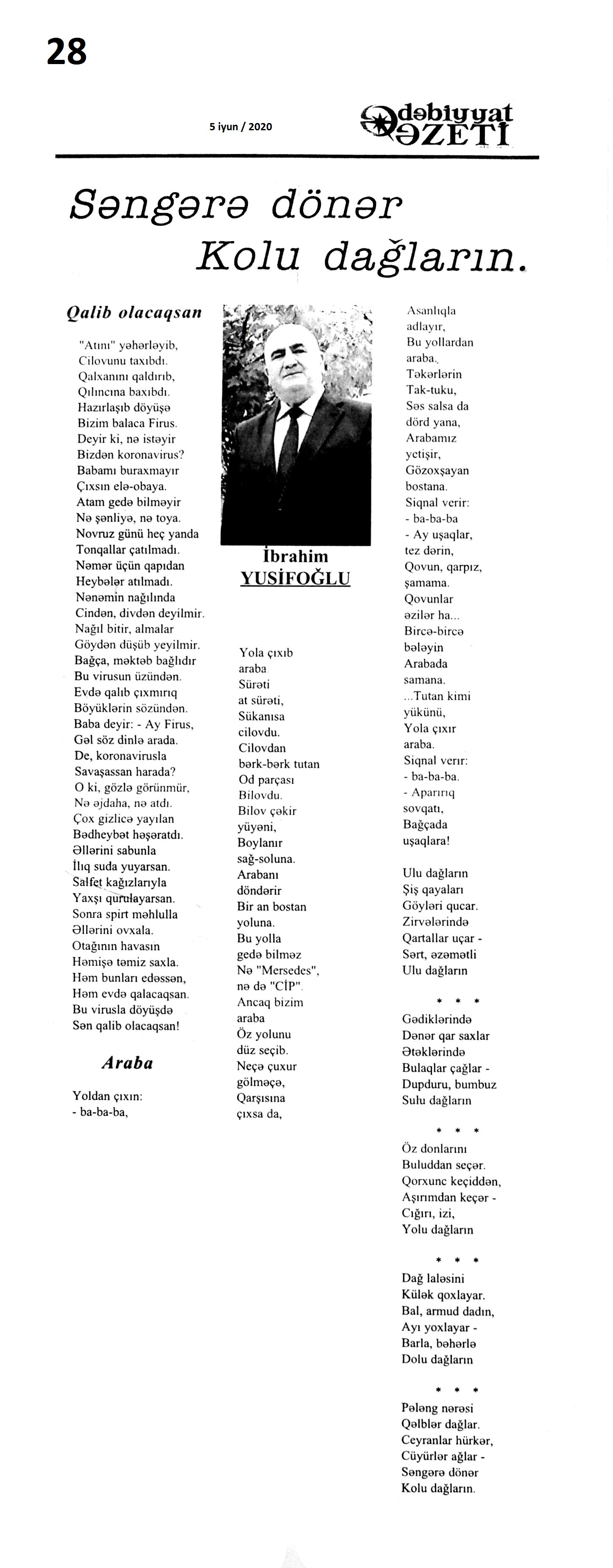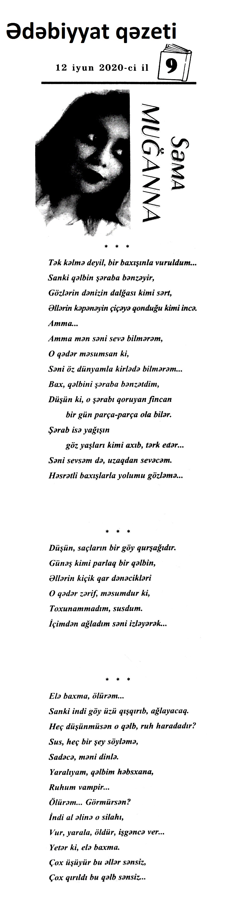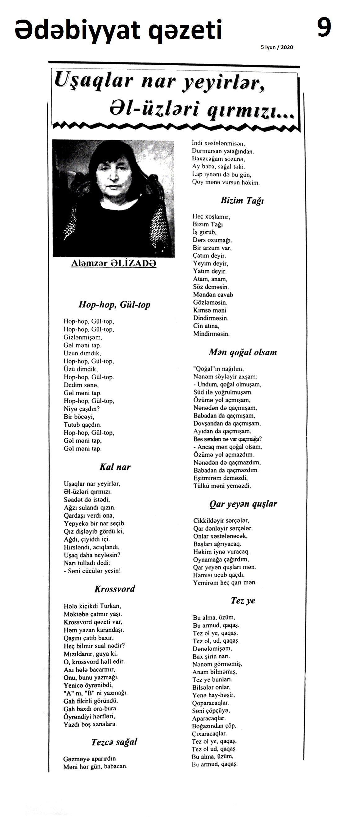 III. BƏDİİ ƏDƏBİYYAT ŞEİRLƏR 242. Abdin, S. İntihar xəbəri döyür qapımı...; Bu dünyanı qara gördüm; Mən bilmirəm hara gedim? // Ədalət.- 2020.- 9 iyun.- S.5. 243. Ağa, A. Dəli külək; Arılar; Çeçələ barmaq // Ədəbiyyat qəzeti.- 2020.- 5 iyun.- S.32. 244. Ağa, M. Bu dünyanın hər üzünü; Bu dünyanın çox...; Yaman gözəlsiz düzü...; Məni adam et...; Yaşayır göy dənizdə...; Əvvəl-əvvəl göyə baxdı...; Dərib dəstə bağladın; Aç yelkənini...; Bir qədər yaxinda... // Kaspi.- 2020.- 10 iyun.- S.15. 245. Arabaçı, A. Heç zaman endirmədim sözü zirvədən dizə // Ədalət.- 2020.- 5 iyun.- S.10. 246. Aslan, V. Beşi yeddinci ay; Sabirə xitab; Gəlirəm; Uzaqlara baxan insan!; Ağla; Bərdə; Məqam; Nəvələrim; Qaçıram, qaşıram sevdiklərimdən...; Görüşəcəyik // Ədəbiyyat qəzeti.- 2020.- 19 iyun.- S. 13. 247. Bəxtiyar, S. Tapmacalı şeirlər // Ədəbiyyat qəzeti.- 2020.- 5 iyun.- S.21. 248. Cəmil, A. Hana; Günəş və tumurcuq; Sadıq baba, Güllü nənə; Aysel; Göbələk həsrəti; Günəş baxır Günəşə // Ədəbiyyat qəzeti.- 2020.- 5 iyun.- S.26. 249. Elsevər, S. Kirillə latını qarışdıranda; İki yalan // Ədəbiyyat qəzeti.- 2020.- 5 iyun.- S.25. 250. Əlioğlu, Ə. Bayram tonqalında; Yaz yağışı; Yumaq; Biçənəkdə itmişdik...; Soyuq da bizdən qaçdı; Ayla gizlənpaç; Dələnin yolu; Bizimlə gəzsin; Şam meşəsi; Vələs; İş tapan babam // Ədəbiyyat qəzeti.- 2020.- 5 iyun.- S.28. 251. Əlizadə, A. Uşaqlar nar yeyirlər, Əl-üzləri qırmızı...; Hop-hop, Gül-top; Kal nar; Krossvord; Tezcə sağal; Bizim Tağı; Mən qoğal olsam; Qar yeyən quşlar; Tez ye // Ədəbiyyat qəzeti.- 2020.- 5 iyun.- S.9. 252. Firuddinoğlu, M. Gəl: Şair Oktay Abdullaya // Ədalət.- 2020.- 4 iyun.- S.6. 253. Günəş, E. Qadın istərsə...; Bakı küləyi; Susur sevgi // Yeni Təfəkkür.- 2020.- 19 iyun.- S.3. 254. Heybətağaqızı, R. Yenə o dağ olaydı: M.Müşfiqin xatirəsinə // Ədalət.- 2020.- 5 iyun.- S.16. 255. Həbibbəyli, İ. Ə. Ay mənim nəvələrim: Qəmbər Hüseynlinin xatirəsinə // Ədəbiyyat qəzeti.- 2020.- 5 iyun.- S.5. 256. Hüseynbəyli, F. Uşaq şeiri; Ata rəsmi; Top oyunu; Uşaq və sual // Ədəbiyyat qəzeti.- 2020.- 5 iyun.- S.32. 257. Hüseynoğlu, S. Analar bir günəşdi, övladlar günəbaxan; Dolu; Dibçək; Şaftalı bağında; Qoruqçu çay; Pinti qız; Yağış; Analar bir günəşdir; Vüqarın çəkməsi; Tək ağac; Dərə; Dağ çayı; Dava; Lalənin güllü donu // Ədəbiyyat qəzeti.- 2020.- 5 iyun.- S.23. 258. Xəlil, Z. Koronavirus dövründə uşaqlar; Tütək çalan quş; Sözdən çiçək yağdıraram; Baba ilə nəvənin söhbəti; Mənim dilim; Qoy sənə Günəş deyim...; İbtidai sinif müəlliminin düşüncələri; Tomris; Ay bizim elli qızlar // Ədəbiyyat qəzeti.- 2020.- 5 iyun.- S.6-7. 259. İmanzadə, İ. M. Zalım dünya qocalmır ki, qocalmır; Sanmayın yetən öləcək; Görən nə axtarırıq; Nə gəlib ki...; Lövhə; Biz niyə beləyik...; Qoymadılar; Söz; Özün de...; İlahi, aç qapımı; Ovçu Məmməd; Gedək söz dirilən yerə; Elegiya; Şəlalə; Gedirsən...; Baxışlarım // Ədalət.- 2020.- 1 iyun.- S.7. 260. İsaq, İ. Şokoladlı ev; Dirriyimiz, diriliyimiz; Ballıca; Yağış yağır; Sünbüllü şeir; Qaratoyuq; Bapbalaca... // Ədəbiyyat qəzeti.- 2020.- 5 iyun.- S.26. 261. Kəramət. Mənim ürəyimdə cəhənnəm yoxdur; Bütün sevdalar kimi...; Göyə yağan yağış; Kor kitabı; Məni bağışlamayın; Şuşanın xətrinə sus və danışma; Onsuz da; “Gözəli” gözəlləməsi; Evdə qalma; Qorxu əlacı; Quşlara zəng edirəm... // Ədəbiyyat qəzeti.- 2020.- 12 iyun.- S.3. 262. Korotkeviç, V. S. Keçmiş sevgiliyə ayrılan zaman: [belarus ədəbiyyatı] / tərc. etdi Aydan Xəndan // Kaspi.- 2020.- 13-16 iyun.- S.8. 263. Məmmədova, Ş. Hacıniyaz şeirlərindən seçmələr: Qaraqalpaq poeziyasından; Xivəli qız; könlüm mənim; Düşər; Yox mənim; Olur; Bir canan; Bibigül // Kredo.- 2020.- 11 iyun.- S.14. 264. Muğanna, S. Tək kəlimə deyil, bir baxışla vuruldum...; Düşün, saçların bir göy qurşağıdır...; Elə baxma, ölürəm... // Ədəbiyyat qəzeti.- 2020.- 12 iyun.- S.3. 265. Muradzadə, F. Bu nə qoxusudur görən, ilahi?; Bəlkə yadında qalacam; Bir usaqlıq həsrəti... // Kaspi.- 2020.- 10 iyun.- S.13. 266. Mürvətov, N. T. Bax ümidlə gələcəyə, sabaha; Çəkilirəm addımbaşı “sınağa”; Zərrəyəm; yaşadım; Məhəbbət; Ana, de də söz mənə; Ağsaqqalım // Ədəbiyyat qəzeti.- 2020.- 19 iyun.- S. 29. 267. Mürvətov, N. T. Nəzmə aldım; Dəyişəcək dünya?; Bumu?; Darılma; Artıq umur; Başa düşməz; Dünya “Cənnətdir”; Vədən vədə qaldı; Getdi; Öyümə // Kredo.- 2020.- 18 iyun.- S.6. 268. Müslüm, F. Çəkildim özümə...; Biz Tanrı verdiyi haqqa tapındıq; Kərküklü dostlar; Gecələr- çiynimdə qara yapıncı // 525-ci qəzet.- 2020.- 17 iyun.- S.22. 269. Nağıqızı, M. Heydər Əliyev dastanı; Bir ömür himni; “Kərəmi”; Al bayrağım; Anamla söhbət; Sən olaydın; Dünya // Azərbaycan müəllimi.- 2020.- 19 iyun.- S.13. 270. Namaz, M. Balalarımız üçün; Yanıltmaclar; Göz; Fidan; Qar // Ədəbiyyat qəzeti.- 2020.- 5 iyun.- S.12. 271. Nuruqızı, S. Elə payız gələni; Xəzərim; Ana dili; Vətən // Ədəbiyyat qəzeti.- 2020.- 5 iyun.- S.12. 272. Nurullahi, Ə. Başımda arpa-buğday saçlarım...; Orda bir göl vardı...: [Cənubi Azərbaycan ədəbiyyatı] // 525-ci qəzet.- 2020.- 5 iyun.- S.19. 273. Paşa, E. İtirdim; Saçlarına qurban olum... // Türküstan.- 2020.- 23-29 iyun.- S.22. 274. Rüstəmova, X. Duyuram qəlbimin döyüntüsünü-; Axmatovaya; Külək yıxa bilməz...; Başımın üstündə...; Anam; Dirilişə məktub; Məgər az idi...; Bəlkə bir oturaq...; Xəstəliyə bənzəmir...; Ürəyində bir sözün var; Belə görməmişdim...
