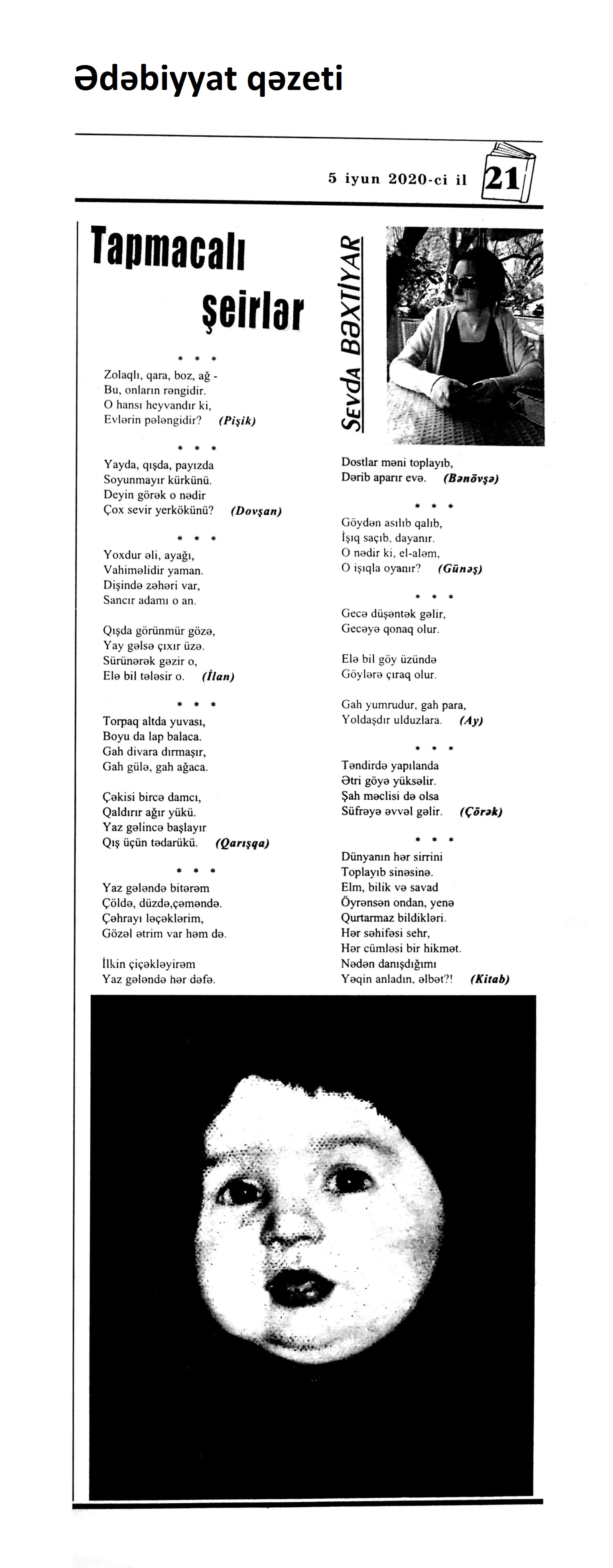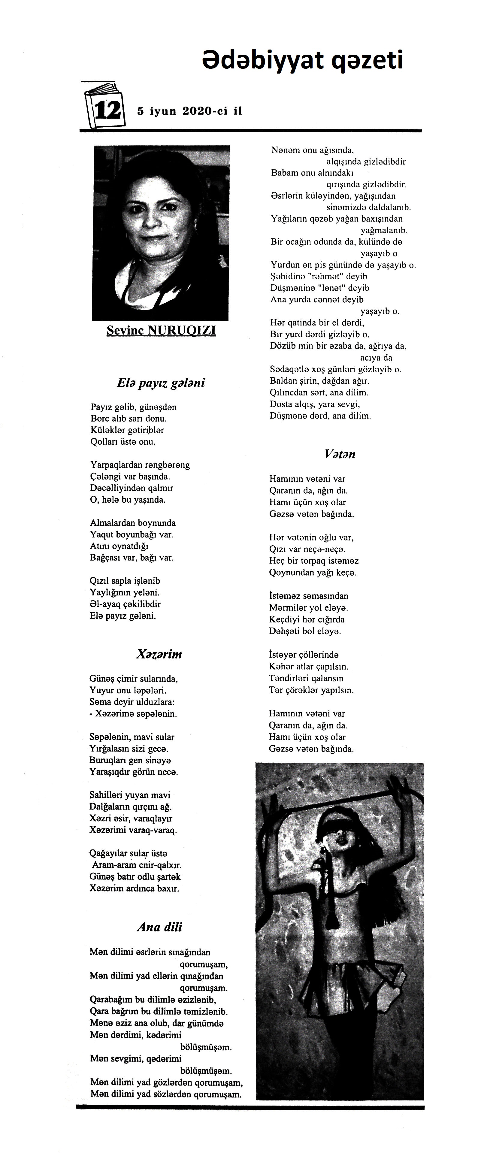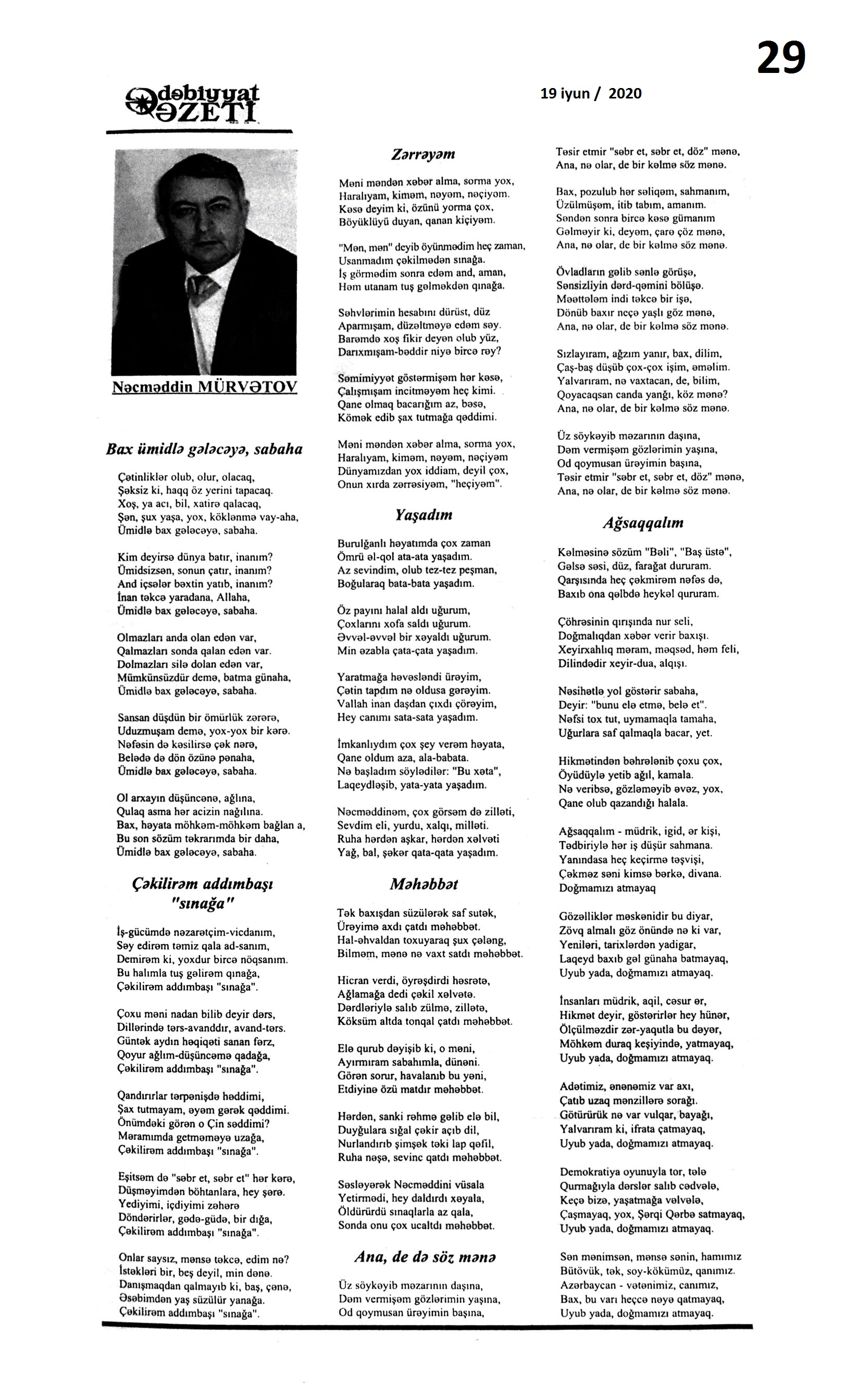 III. BƏDİİ ƏDƏBİYYAT ŞEİRLƏR 242. Abdin, S. İntihar xəbəri döyür qapımı...; Bu dünyanı qara gördüm; Mən bilmirəm hara gedim? // Ədalət.- 2020.- 9 iyun.- S.5. 243. Ağa, A. Dəli külək; Arılar; Çeçələ barmaq // Ədəbiyyat qəzeti.- 2020.- 5 iyun.- S.32. 244. Ağa, M. Bu dünyanın hər üzünü; Bu dünyanın çox...; Yaman gözəlsiz düzü...; Məni adam et...; Yaşayır göy dənizdə...; Əvvəl-əvvəl göyə baxdı...; Dərib dəstə bağladın; Aç yelkənini...; Bir qədər yaxinda... // Kaspi.- 2020.- 10 iyun.- S.15. 245. Arabaçı, A. Heç zaman endirmədim sözü zirvədən dizə // Ədalət.- 2020.- 5 iyun.- S.10. 246. Aslan, V. Beşi yeddinci ay; Sabirə xitab; Gəlirəm; Uzaqlara baxan insan!; Ağla; Bərdə; Məqam; Nəvələrim; Qaçıram, qaşıram sevdiklərimdən...; Görüşəcəyik // Ədəbiyyat qəzeti.- 2020.- 19 iyun.- S. 13. 247. Bəxtiyar, S. Tapmacalı şeirlər // Ədəbiyyat qəzeti.- 2020.- 5 iyun.- S.21. 248. Cəmil, A. Hana; Günəş və tumurcuq; Sadıq baba, Güllü nənə; Aysel; Göbələk həsrəti; Günəş baxır Günəşə // Ədəbiyyat qəzeti.- 2020.- 5 iyun.- S.26. 249. Elsevər, S. Kirillə latını qarışdıranda; İki yalan // Ədəbiyyat qəzeti.- 2020.- 5 iyun.- S.25. 250. Əlioğlu, Ə. Bayram tonqalında; Yaz yağışı; Yumaq; Biçənəkdə itmişdik...; Soyuq da bizdən qaçdı; Ayla gizlənpaç; Dələnin yolu; Bizimlə gəzsin; Şam meşəsi; Vələs; İş tapan babam // Ədəbiyyat qəzeti.- 2020.- 5 iyun.- S.28. 251. Əlizadə, A. Uşaqlar nar yeyirlər, Əl-üzləri qırmızı...; Hop-hop, Gül-top; Kal nar; Krossvord; Tezcə sağal; Bizim Tağı; Mən qoğal olsam; Qar yeyən quşlar; Tez ye // Ədəbiyyat qəzeti.- 2020.- 5 iyun.- S.9. 252. Firuddinoğlu, M. Gəl: Şair Oktay Abdullaya // Ədalət.- 2020.- 4 iyun.- S.6. 253. Günəş, E. Qadın istərsə...; Bakı küləyi; Susur sevgi // Yeni Təfəkkür.- 2020.- 19 iyun.- S.3. 254. Heybətağaqızı, R. Yenə o dağ olaydı: M.Müşfiqin xatirəsinə // Ədalət.- 2020.- 5 iyun.- S.16. 255. Həbibbəyli, İ. Ə. Ay mənim nəvələrim: Qəmbər Hüseynlinin xatirəsinə // Ədəbiyyat qəzeti.- 2020.- 5 iyun.- S.5. 256. Hüseynbəyli, F. Uşaq şeiri; Ata rəsmi; Top oyunu; Uşaq və sual // Ədəbiyyat qəzeti.- 2020.- 5 iyun.- S.32. 257. Hüseynoğlu, S. Analar bir günəşdi, övladlar günəbaxan; Dolu; Dibçək; Şaftalı bağında; Qoruqçu çay; Pinti qız; Yağış; Analar bir günəşdir; Vüqarın çəkməsi; Tək ağac; Dərə; Dağ çayı; Dava; Lalənin güllü donu // Ədəbiyyat qəzeti.- 2020.- 5 iyun.- S.23. 258. Xəlil, Z. Koronavirus dövründə uşaqlar; Tütək çalan quş; Sözdən çiçək yağdıraram; Baba ilə nəvənin söhbəti; Mənim dilim; Qoy sənə Günəş deyim...; İbtidai sinif müəlliminin düşüncələri; Tomris; Ay bizim elli qızlar // Ədəbiyyat qəzeti.- 2020.- 5 iyun.- S.6-7. 259. İmanzadə, İ. M. Zalım dünya qocalmır ki, qocalmır; Sanmayın yetən öləcək; Görən nə axtarırıq; Nə gəlib ki...; Lövhə; Biz niyə beləyik...; Qoymadılar; Söz; Özün de...; İlahi, aç qapımı; Ovçu Məmməd; Gedək söz dirilən yerə; Elegiya; Şəlalə; Gedirsən...; Baxışlarım // Ədalət.- 2020.- 1 iyun.- S.7. 260. İsaq, İ. Şokoladlı ev; Dirriyimiz, diriliyimiz; Ballıca; Yağış yağır; Sünbüllü şeir; Qaratoyuq; Bapbalaca... // Ədəbiyyat qəzeti.- 2020.- 5 iyun.- S.26. 261. Kəramət. Mənim ürəyimdə cəhənnəm yoxdur; Bütün sevdalar kimi...; Göyə yağan yağış; Kor kitabı; Məni bağışlamayın; Şuşanın xətrinə sus və danışma; Onsuz da; “Gözəli” gözəlləməsi; Evdə qalma; Qorxu əlacı; Quşlara zəng edirəm... // Ədəbiyyat qəzeti.- 2020.- 12 iyun.- S.3. 262. Korotkeviç, V. S. Keçmiş sevgiliyə ayrılan zaman: [belarus ədəbiyyatı] / tərc. etdi Aydan Xəndan // Kaspi.- 2020.- 13-16 iyun.- S.8. 263. Məmmədova, Ş. Hacıniyaz şeirlərindən seçmələr: Qaraqalpaq poeziyasından; Xivəli qız; könlüm mənim; Düşər; Yox mənim; Olur; Bir canan; Bibigül // Kredo.- 2020.- 11 iyun.- S.14. 264. Muğanna, S. Tək kəlimə deyil, bir baxışla vuruldum...; Düşün, saçların bir göy qurşağıdır...; Elə baxma, ölürəm... // Ədəbiyyat qəzeti.- 2020.- 12 iyun.- S.3. 265. Muradzadə, F. Bu nə qoxusudur görən, ilahi?; Bəlkə yadında qalacam; Bir usaqlıq həsrəti... // Kaspi.- 2020.- 10 iyun.- S.13. 266. Mürvətov, N. T. Bax ümidlə gələcəyə, sabaha; Çəkilirəm addımbaşı “sınağa”; Zərrəyəm; yaşadım; Məhəbbət; Ana, de də söz mənə; Ağsaqqalım // Ədəbiyyat qəzeti.- 2020.- 19 iyun.- S. 29. 267. Mürvətov, N. T. Nəzmə aldım; Dəyişəcək dünya?; Bumu?; Darılma; Artıq umur; Başa düşməz; Dünya “Cənnətdir”; Vədən vədə qaldı; Getdi; Öyümə // Kredo.- 2020.- 18 iyun.- S.6. 268. Müslüm, F. Çəkildim özümə...; Biz Tanrı verdiyi haqqa tapındıq; Kərküklü dostlar; Gecələr- çiynimdə qara yapıncı // 525-ci qəzet.- 2020.- 17 iyun.- S.22. 269. Nağıqızı, M. Heydər Əliyev dastanı; Bir ömür himni; “Kərəmi”; Al bayrağım; Anamla söhbət; Sən olaydın; Dünya // Azərbaycan müəllimi.- 2020.- 19 iyun.- S.13. 270. Namaz, M. Balalarımız üçün; Yanıltmaclar; Göz; Fidan; Qar // Ədəbiyyat qəzeti.- 2020.- 5 iyun.- S.12. 271. Nuruqızı, S. Elə payız gələni; Xəzərim; Ana dili; Vətən // Ədəbiyyat qəzeti.- 2020.- 5 iyun.- S.12. 272. Nurullahi, Ə. Başımda arpa-buğday saçlarım...; Orda bir göl vardı...: [Cənubi Azərbaycan ədəbiyyatı] // 525-ci qəzet.- 2020.- 5 iyun.- S.19. 273. Paşa, E. İtirdim; Saçlarına qurban olum... // Türküstan.- 2020.- 23-29 iyun.- S.22. 274. Rüstəmova, X. Duyuram qəlbimin döyüntüsünü-; Axmatovaya; Külək yıxa bilməz...; Başımın üstündə...; Anam; Dirilişə məktub; Məgər az idi...; Bəlkə bir oturaq...; Xəstəliyə bənzəmir...; Ürəyində bir sözün var; Belə görməmişdim...