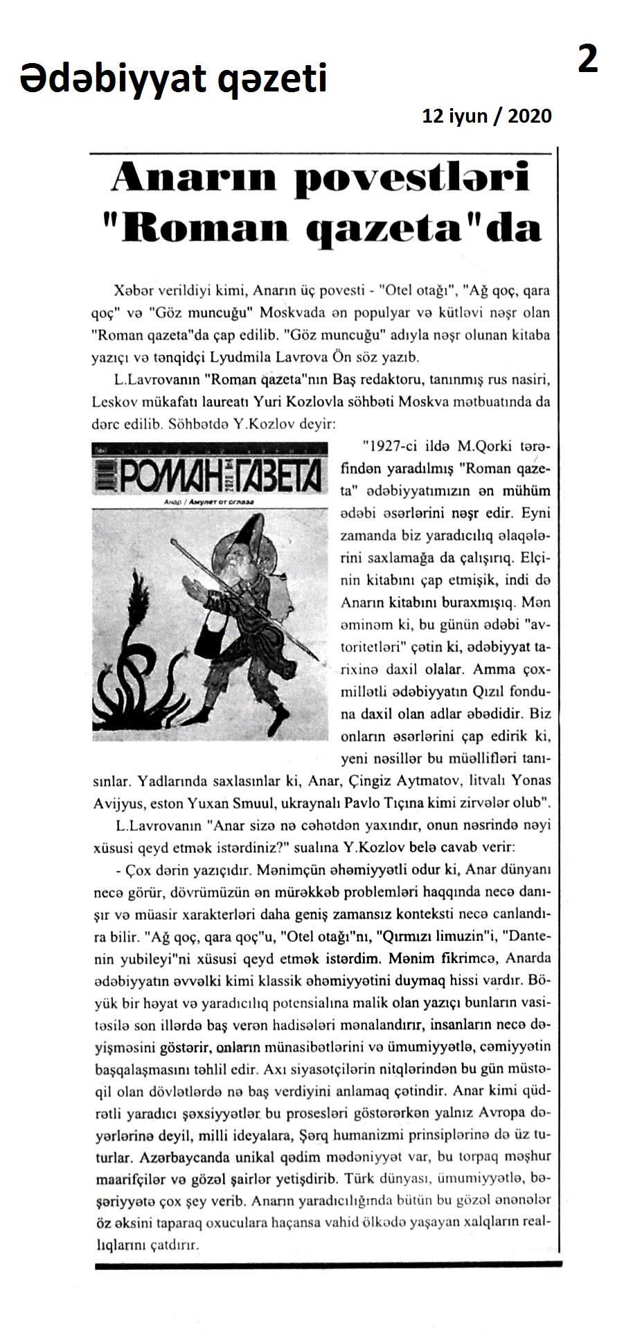 ROMANLAR 338. Abbas, A. Gəl ay Pənah xan, gorun çatlasın!: [“Batmanqılınc” romanının giriş hissəsi] // Ədalət.- 2020.- 11 iyun.- S.5. 339. Əlişanoğlu, T. Başdaşı nağılı: [yazıçı Səyyad Aranın “Başdaşı” romanı haqqında] // Ədəbiyyat qəzeti.- 2020.- 19 iyun.- S. 18; 19. 340. Hüseynoğlu, S. Geriyə yol qalmayanda: Səyyad Aranın “Başdaşı” romanı üzərinə // Ədəbiyyat qəzeti.- 2020.- 19 iyun.- S. 19. 341. Mirələmov, H. F. Çaldırana gedən yol: Romandan səhifələr // Kredo.- 2020.- 4 iyun.- S.2. 342. Mirələmov, H. F. Çaldırana gedən yol: Romandan səhifələr // Kredo.- 2020.- 11 iyun.- S.2. ğ 343. Mirələmov, H. F. Çaldırana gedən yol: Romandan səhifələr // Kredo.- 2020.- 18 iyun.- S.2. 344. Mirələmov, H. F. Çaldırana gedən yol: Romandan səhifələr // Kredo.- 2020.- 22 iyun.- S.2. 345. Sarıhüseynoğlu, V. N. Əsirli əsrlər; Əsrlər, əsirlər yallısı // Ədəbiyyat qəzeti.- 2020.- 12 iyun.- S.26. 346. Selcan, S. “Lo” romanı: gerçəkliyin uğurlu bədii inikası: [şair, publisistin eyniadlı romanı haqqında] // 525-ci qəzet.- 2020.- 26 iyun.- S.20. 347. Şəfahət, Q. Hayana atıldığı bilinməyən daş: “Sandıq” romanından parça // Ədəbiyyat qəzeti.- 2020.- 19 iyun.- S. 30.