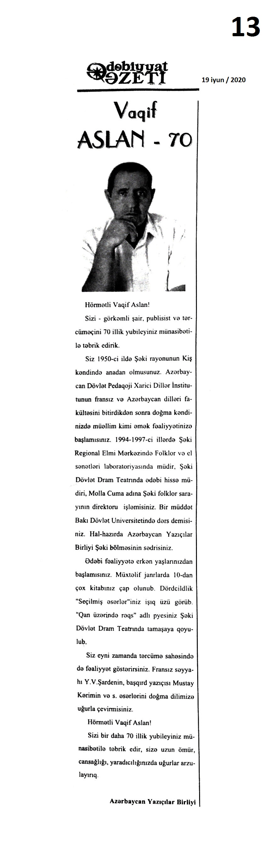 PUBLİSİSTİKA 348. İdrisoğlu, A. Böyüklərin gözü, uşaqların sözü ilə // Azad Azərbaycan.- 2020.- 9 iyun.- S.7. 349. Qəni, E. İşıq adam – Yazı: [professor, jurnalist Cahangir Məmmədli haqqında] // 525-ci qəzet.- 2020.- 24 iyun.- S.17-18. 350. Zeynal, Ə. Azərbaycanın 100 il əvvəlki parlament jurnalistləri: Fərhad Ağazadə haqqında bilmədiklərimiz: [ictimai xadim haqqında] // Türküstan.- 2020.- 23-29 iyun.- S.13.