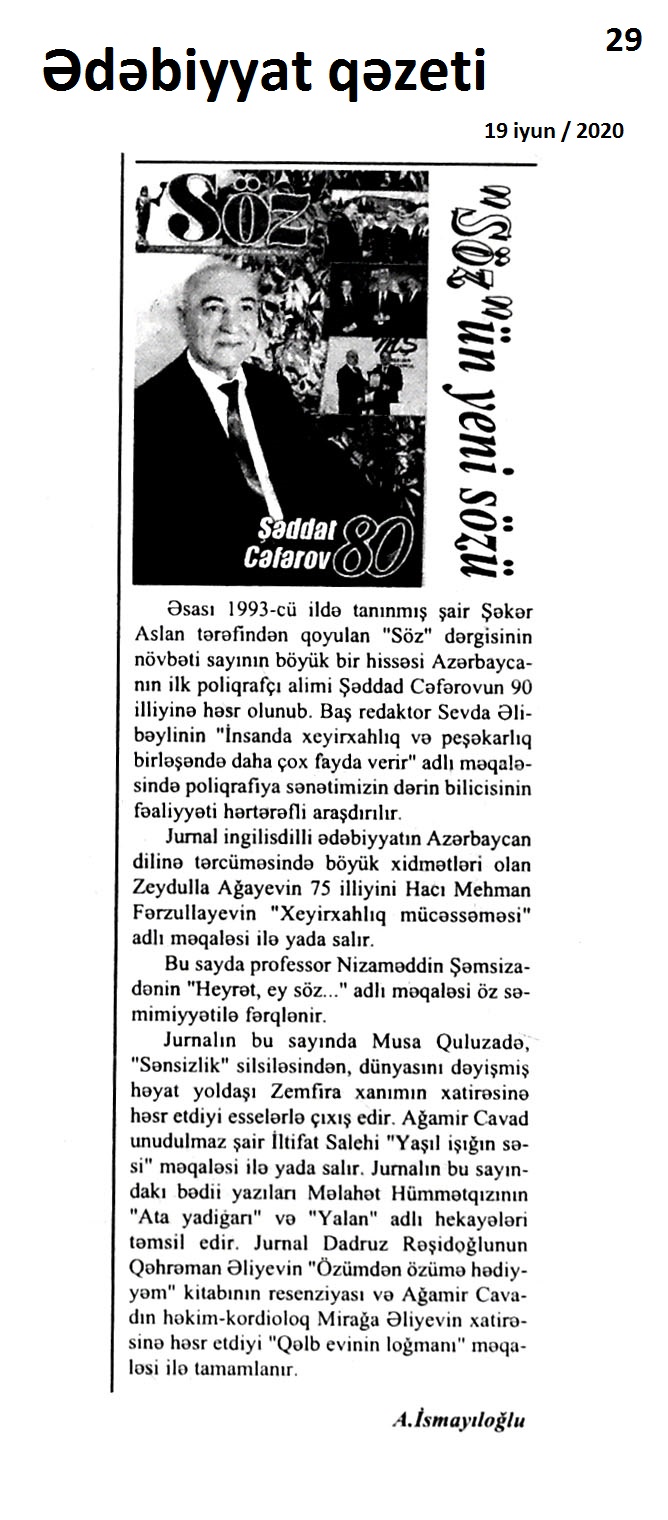 Ş əddad Cəfərov – 80537. Bir könüldən gələn səs: [poliqrafçı alimin yaradıcılığı haqqında] // Kredo.- 2020.- 4 iyun.- S.11.538. İnsanın uca yeri: [poliqrafçı alimin yaradıcılığı haqqında] // Kredo.- 2020.- 18 iyun.- S.11. 539. İsmayıloğlu, A. “Söz”ün yeni sözü: Şəddad Cəfərov – 80: [eyniadlı dərginin növbəti sayı Azərbaycanın ilk poliqrafçı aliminə həsr olunmuşdur] // Ədəbiyyat qəzeti.- 2020.- 19 iyun.- S. 29. 540. Teatral adamın kimliyi // Kredo.- 2020.- 11 iyun.- S.11. 541. Ziyalının dünya borcu // Kredo.- 2020.- 22 iyun.- S.11.