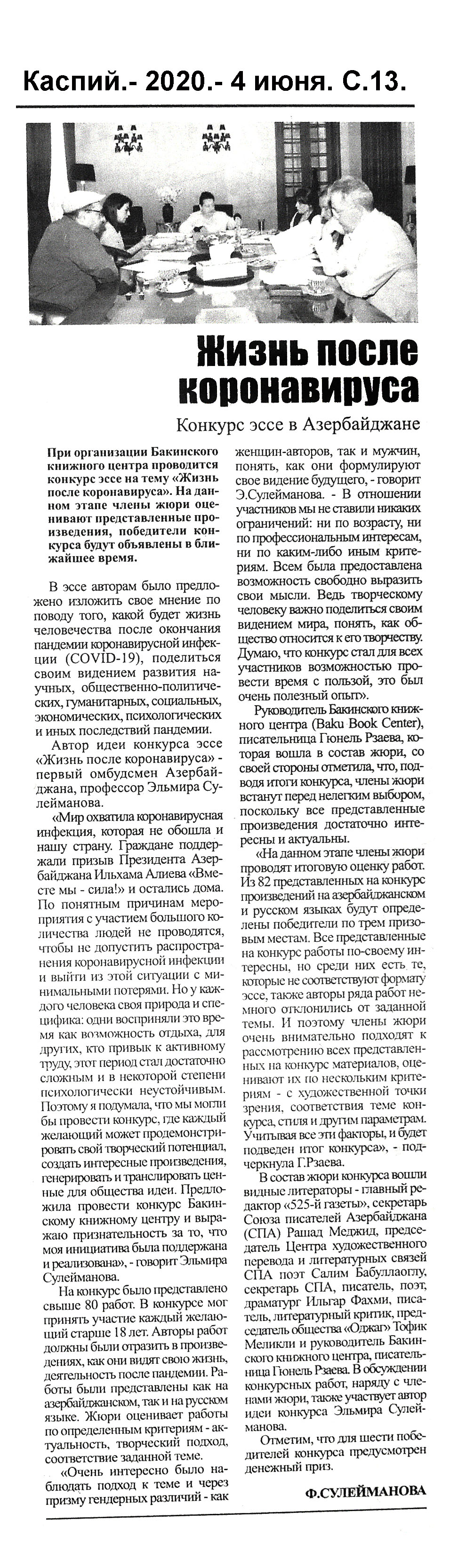 MƏDƏNİ ƏLAQƏLƏR 62. Azərbaycan tarixinin və mədəniyyətinin təbliği “Əl-Bayan” qəzetində: [Əbu-Dabi Universitetin müəllimi Şəhrizad Süleymanlının və Birləşmiş Ərəb Əmirliklərinin nüfuzlu “Əl-Bayan” qəzetinin redaktoru, tanınmış jurnalist Marvat Əbdulkərimin layihələri haqqında] // Kaspi.- 2020.- 9 iyun.-S.15. 63. Azərbaycan-Özbəkistan mədəni əlaqələrinə həsr olunmuş onlayn konfrans: [“Azərbaycan-Özbəkistan dostluğu və əməkdaşlığı: mədəni və ədəbi əlaqələr münasibətlərimizin fövqündə” adlı onlayn konfrans keçirilməsi haqqında] // Mədəniyyət.- 2020.- 19 iyun.- S.8. 64. İspaniya jurnalında ölkəmizlə bağlı məqalələr // Mədəniyyət.- 2020.- 12 iyun.- S.1;2. 65. Rəssamlarımızın əsərləri Polşada sərgilənib: [Rıbnik şəhərinin Gənclərin Mədəniyyət Mərkəzində balaca rəssamların əl işlərindən ibarət sərginin açılması haqqında] // Mədəniyyət.- 2020.- 26 iyun.- S.3. 66. “Sülh mədəniyyətinə dair Biennale”: Beynəlxalq onlayn konfransda mədəniyyətlərarası dialoqa dair “Bakı Prosesi”ndən də bəhs olunub: [Beynəlxalq Afrika Günü ilə əlaqədar UNESCO və Afrika İttifaqının birgə təşkilatçılığı ilə keçirilən onlayn konfrans haqqında] // Mədəniyyət.- 2020.- 3 iyun.- S.1;3. 67. Şanxayda Azərbaycan mədəniyyəti gecəsi // Mədəniyyət.- 2020.- 5 iyun.- S.8.