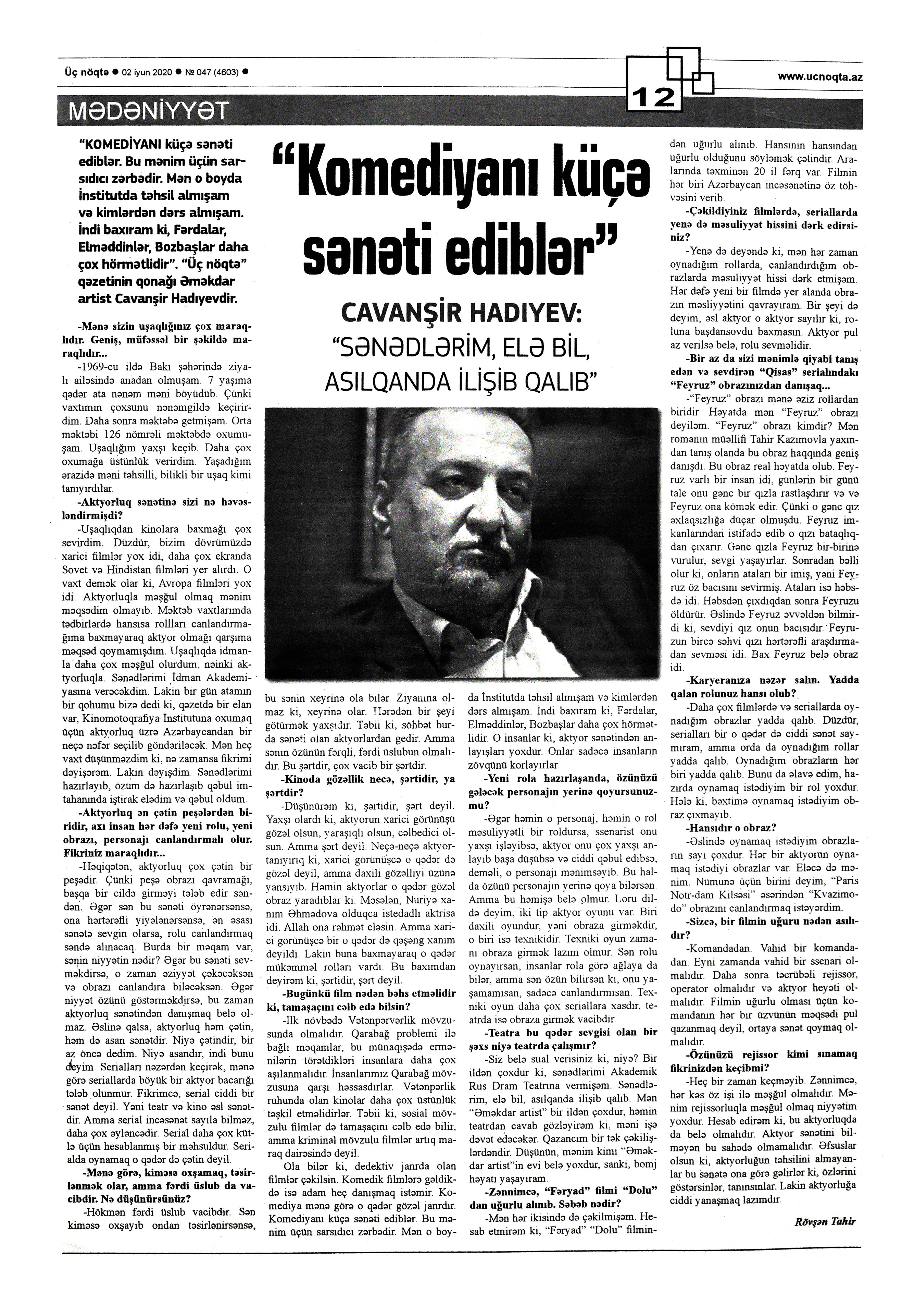 KİNO 183. Amal, A. “O iki qadınla özümü evli kimi hiss edirəm”: Amil Amal: “Dövlət pul ayırmasa, mənim kimi rejissorlar kənarda qalacaq, milli-mənəvi dəyərlərimiz məhvə doğru gedəcək”: [rejissorla müsahibə] / müsahibəni apardı Xəyalə Rəis // Kaspi.- 2020.- 18 iyun.-S.14. 184. “Arxadan vurulan zərbə”nin gizlinləri: Aktyoru az qala bıçaqla öldürəcəkdilər: [Arif Babayevin çəkdiyi eyniadlı film haqqında] // Hürriyyət.- 2020.- 23-24 iyun.- S.16. 185. Aydəmir, A. “Hansı tələbatdan danışırıq? Damla filmdə baş rola çəkildi”: Azər Aydəmir: Aktyorlarımız Biləcəridən o tərəfə çıxacaqlar: [istedadlı aktyorla müsahibə] / müsahibəni apardı Rövşən Tahir // Üç nöqtə. - 2020.- 1 iyun.- S.12. 186. Azəri, L. “Açar” filminin tizeri kinosevərlərə təqdim olunub: [Elşad Elsevərin çəkdiyi eyniadlı film haqqında] // Mədəniyyət.- 2020.- 3 iyun.- S.5. 187. Çəkilişində rejissorun, operatorun, fotoqrafın həlak olduğu filmimiz – “Mən ki gözəl deyildim”in faciəvi kadr arxası // Unikal.- 2020.- 13 iyun.- S.20. 188. Əlişov, F. “Məni həmişə öz dərsinə vurğunluq yaradan müəllimlər valeh edib”: Fuad Əlişov: Amma, görünür, taleyin planları başqa imiş…: [rejissorla müsahibə] / müsahibəni apardı Samirə Ərəbova // Şərq.- 2020.- 9 iyun.- S.13. 189. Fərəcov, S. Sənəti ilə məktəb yaradan aktyor: [Xalq artisti Möhsün Sənani haqqında] // Mədəniyyət.- 2020.- 12 iyun.- S.6. 190. Gürcüstandakı soydaşlarımızın qısametrajlı filmləri: [“Mədəniyyət” kanalı və Mədəniyyət Nazirliyinin eyniadlı layihəsi haqqında] // Mədəniyyət.- 2020.-10 iyun.- S.5. 191. Hadıyev, C. “Komediyanı küçə sənəti ediblər”: Cavanşir Hadiyev: Sənədlərim, elə bil asılqanda ilişib qalıb: [Əməkdar artistlə müsahibə] / müsahibəni apardı Rövşən Tahir // Üç nöqtə.- 2020.- 2 iyun.- S.12. 192. Kazımzadə, A. Ə. Əməyin ucaltdığı mətin bir obraz: [rejissor Vasif Məmmədzadənin akademik Xoşbəxt Yusifzadəyə həsr etdiyi “Fədakar” filmi haqqında] // Mədəniyyət.- 2020.- 3 iyun.- S. 5. 193. Kərimova, S. Çəkdiyi filmlə ABŞ-da uğur qazanan azərbaycanlı tələbə: İsmayıl Məlikov: Ölkəmi layiqincə təmsil etməkdən fəxr duyuram // Azərbaycan müəllimi.- 2020.- 19 iyun.- S.11. 194. Qorxmaz, A. Aktyor Tofiq Mirzəyevi Azərbaycandan İsrailə nə apardı: Tanımadığımız məşhur // Unikal.-2020.- 18 iyun.- S.20. 195. “Mənim balaca şahzadəm” beynəlxalq festivalın qalibləri sırasında: [Arif Məhərrəmovun çəkdiyi eyniadlı filmin Koreyada mükafat qazanması haqqında] // Mədəniyyət.- 2020.- 24 iyun.- S.8. 196. Mir-Qasım, O. Varislər: Oktay Mir-Qasım: “Atam bütöv Azərbaycan sevdalısı idi”: [“Varislər”in qonağı Elmlər Akademiyasının ilk prezidenti Mirəsədulla Mirqasımovun oğlu tanınmış kinorejissor Oktay Mir-Qasımdır] / müsahibəni apardı Əyyub Qiyas // Ədəbiyyat qəzeti.- 2020.- 12 iyun.- S.16-17. 197. Mustafa, F. Rejissor Mərahim Fərzəlibəyovun əmək kitabçası… // Ədalət.- 2020.- 26 iyun.- S. 5. 198. Müşfiq, Ş. Şanlı tarixin yüzüncü ili ekranda: [1920-ci ildə sovet işğalına qarşı yönəlmiş Qarabağ və Gəncədə olan üsyanların kinolarda əksi haqqında] // 525-ci qəzet.- 2020.- 3 iyun.- S.14. 199. Övladını atan, tamaşaçılar tərəfindən söyülən Məlik Dadaşov haqda faktlar // Unikal.- 2020.- 13 iyun.- S.19. 200. Rəis, X. Tarixin çətin dönəmlərində dəyişən incəsənət: Və ya bəşəri problemləri özündə əks etdirən sənət lazımdır?: [teatr və kino rejissoru Namiq Ağayev, kinorejissor Tahir Tahiroviç, Əməkdar artist, İrəvan Dövlət Azərbaycan Dram Teatrının baş rejissoru Sərvər Əliyevin mövzu ilə bağlı fikirləri] // Kaspi.- 2020.- 24 iyun.- S.24. 201. Sultanova, S. Kinomuzun ciddi problemləri: Kanna gedən yollar haradan keçir?-Tənqidçi danışdı: [kinotənqidçinin fikirləri] // Unikal.- 2020.- 13 iyun.- S.21. 202. Yaddan çıxmış sənətkarlar: Qayınananın evdən qovduğu Sevda-bir aktrisanın FACİƏSİ: [Əməkdar artist Tanilə Əhmərova haqqında] // Unikal.- 2020.- 26 iyun.- S.21.; Türküstan.- 2020.- 30 iyun-6 iyul.- S.24. 203. Zirzəmidə “meyit”, Bakı küçələrində “ay lulu”, “Allah kəssin belə qazancı”...: Onların filmləri: [Bakıda çəkilən “Brilyant əl” filmi haqqında] // Unikal.- 2020.- 18 iyun.- S.21.