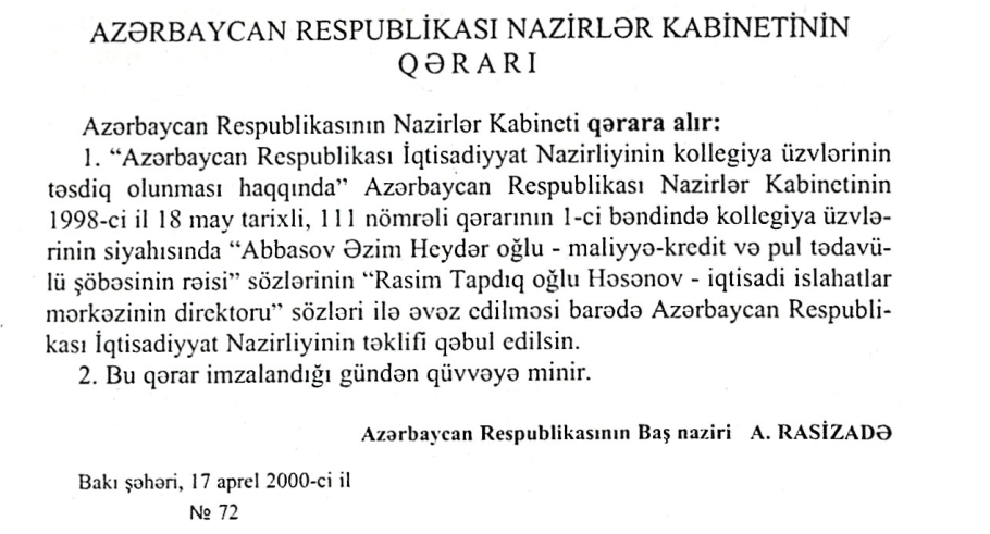 olunması haqqında” Azərbaycan Respublikası Nazirlər
