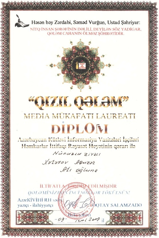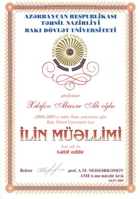 1981, Azəbaycan Ali və Orta Ixtisas Təhsil Nazirliyinin fəxri fərmanı;