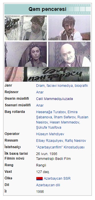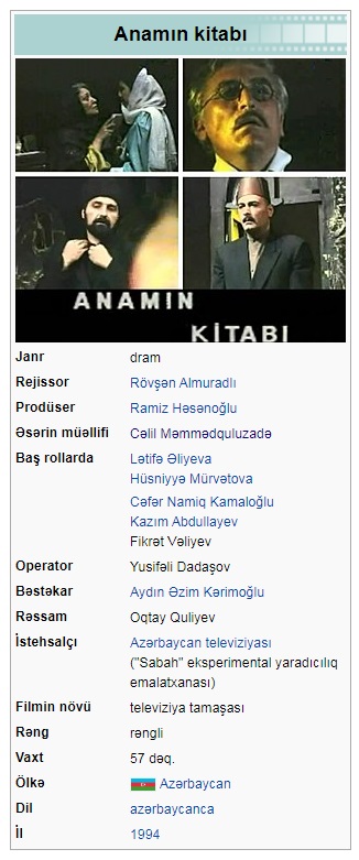 Anamın kitabı: [televiziya tamaşası] / rej.: Rövşən Abdullayev; prod.: Ramiz Həsənoğlu; oper.: Yusifəli Dadaşov; bəst.: Aydın Əzim Kərimoğlu; rəs.: Oqtay Quliyev.-Azərbaycan; Sabah yaradıcılıq emalatxanası, 1994.-1 hissə.
