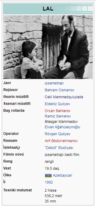 Lal: [qısametrajlı bədii film] / rej.: Bəhram Osmanov; ssen.müəl.:Eldəniz Quliyev; oper.: Rövşən Quliyev; rəs.: Arif Əbdürrəhmanov.-Azərbaycan; Debüt studiyası, 1992.-2 hissə.