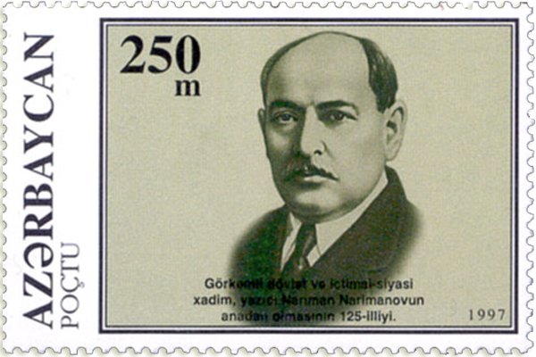 Görkəmli dövlət və ictimai-siyasi xadim, həkim, yazıçı Nəriman Nərimanovun anadan olmasının 125 illiyi münasibəti ilə buraxılmış marka. 1997