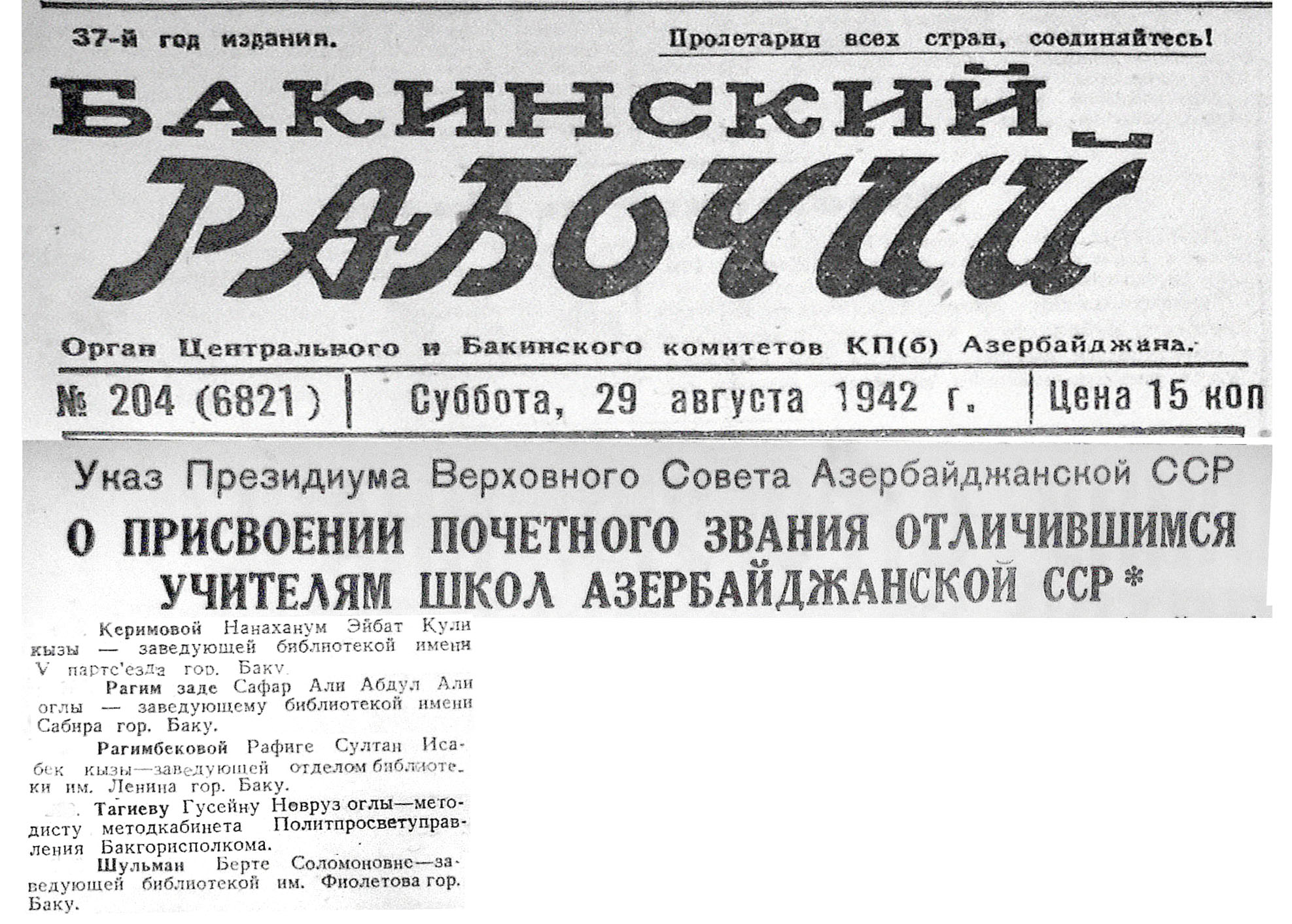 Şulman Berta Solomonovna - Bakı şəhəri Fioletov adına şəhər kitabxanasının müdiri. Azərbaycan SSR Ali Soveti Rəyasət Heyətinin 21 avqust 1942 - ci il tarixli Fərmanı - //Bakı fəhləsi.-1942.-29 avqust.- S.3.