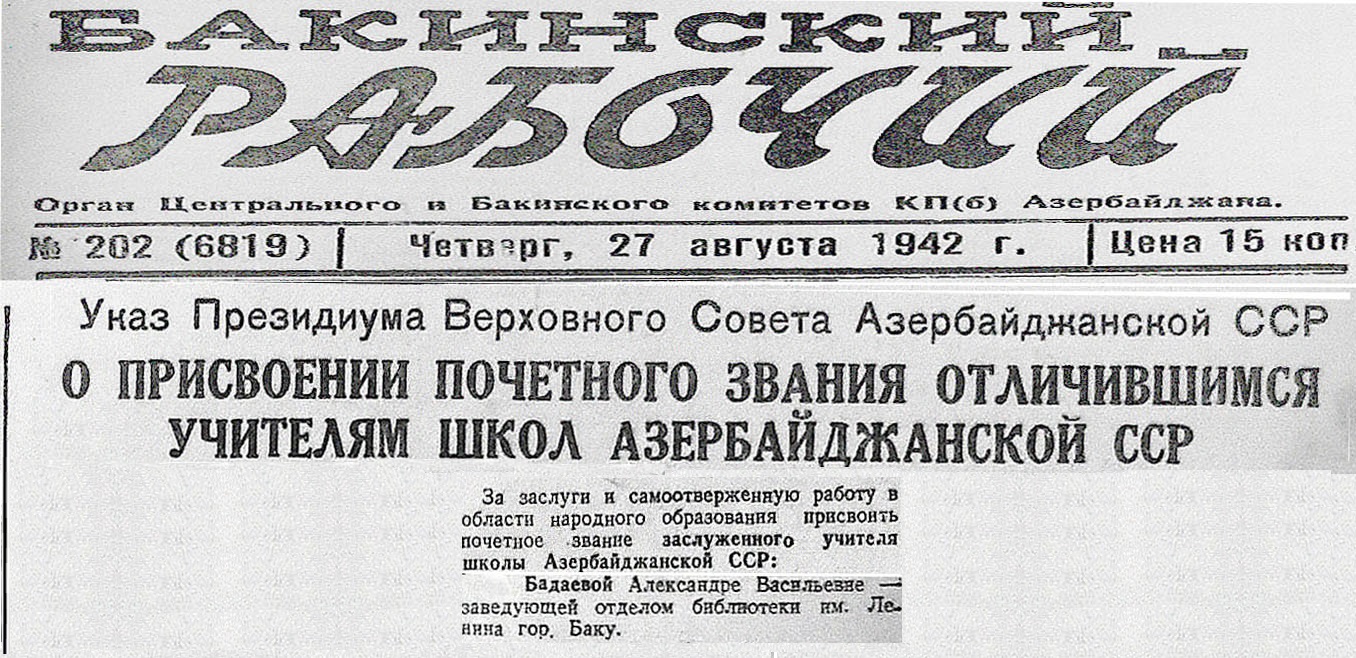 Badaeva Aleksandr Vasilyevna - V.İ.Lenin adına Şəhər Kitabxanasının şöbə müdiri. Azərbaycan SSR Ali Soveti Rəyasət Heyətinin 21 avqust 1942-ci il tarixli Fərmanı  // Bakı fəhləsi.-1942.- 27 avqust.- S.1.