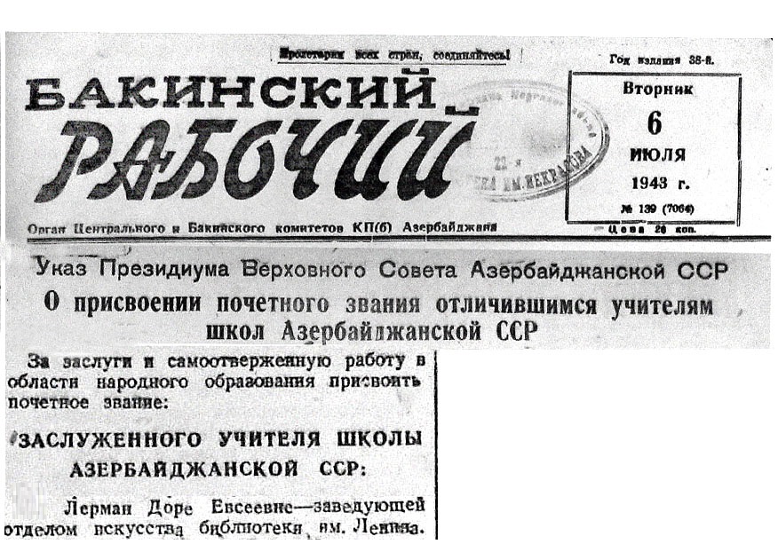 Lerman Dora Yevseyevna - V.İ.Lenin adına Şəhər Kitabxanasının incəsənət şöbəsinin şöbə müdiri. Azərbaycan SSR Ali Soveti Rəyasət Heyətinin 4 iyul 1943-cü il tarixli Fərmanı //Bakı fəhləsi.-1943.-6 iyul .- S.