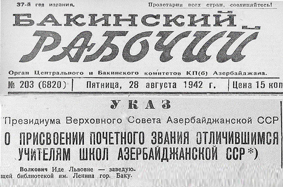 Volkovich Ida Lvovna - V.İ.Lenin adına Kitabxananın şöbə müdiri. Azərbaycan SSR Ali Soveti Rəyasət Heyətinin 21 avqust 1942 - ci il tarixli Fərmanı //Bakı fəhləsi.-1942.- 28 avqust. - S. 1.