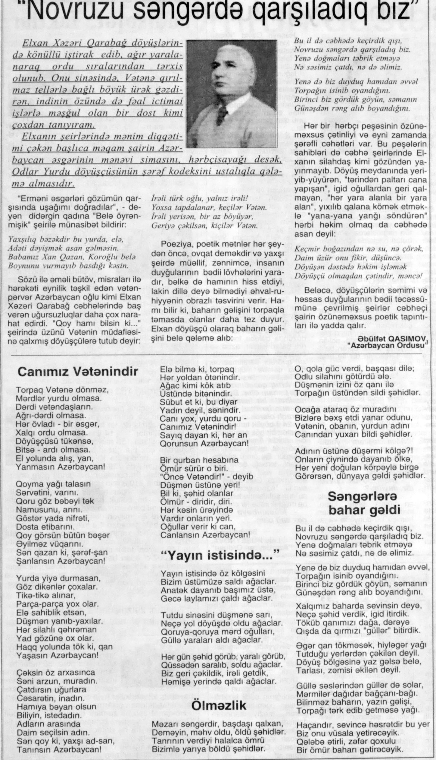 Peşə bayramın mübarək, qalib Azərbaycan əsgəri [Mətn] /S.Xasayeva Mənbə: