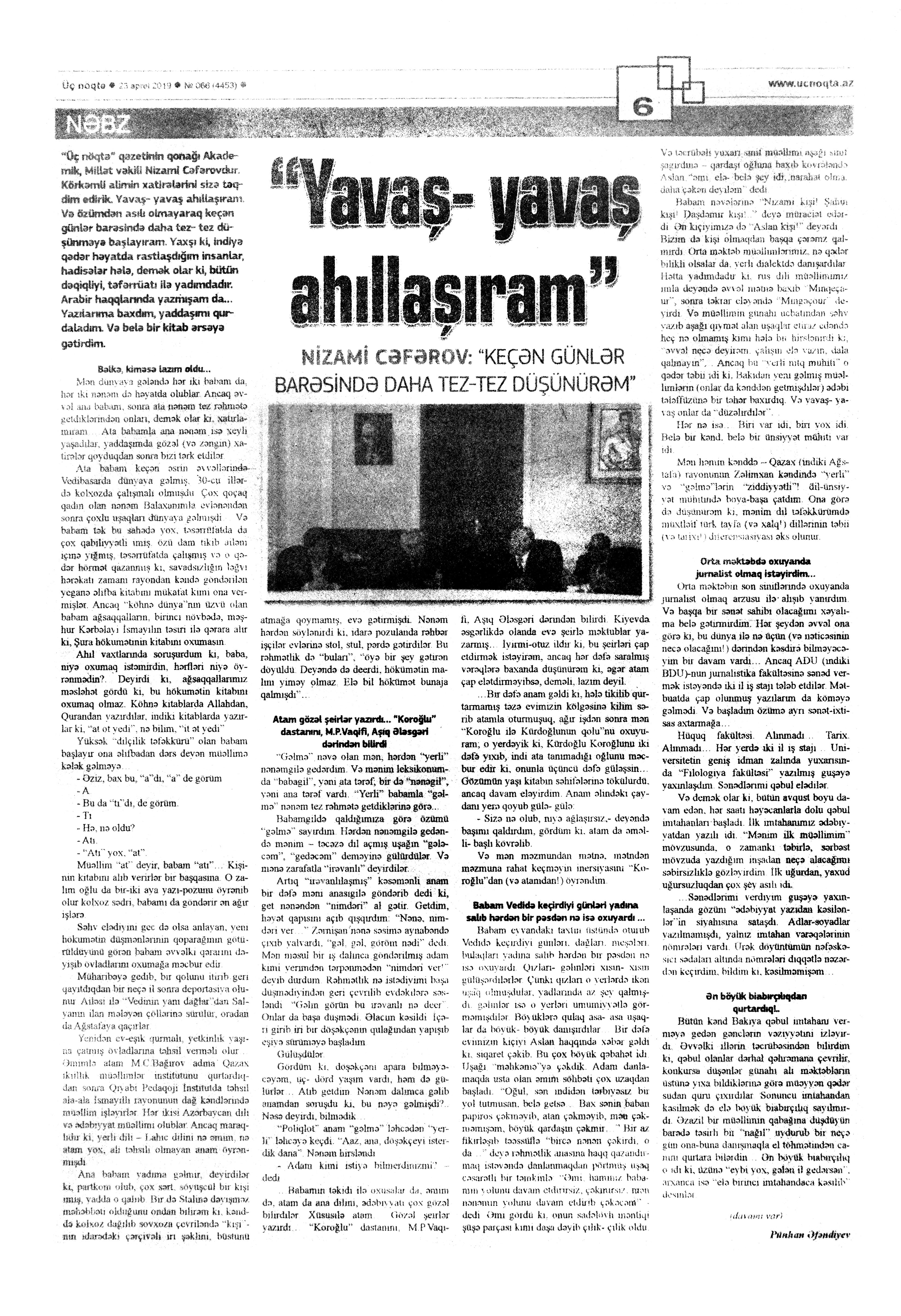 / Pünhan Əfəndiyev // Üç nöqtə. – 2019. – 23 aprel. – S.6; 25, 27, 30 aprel.