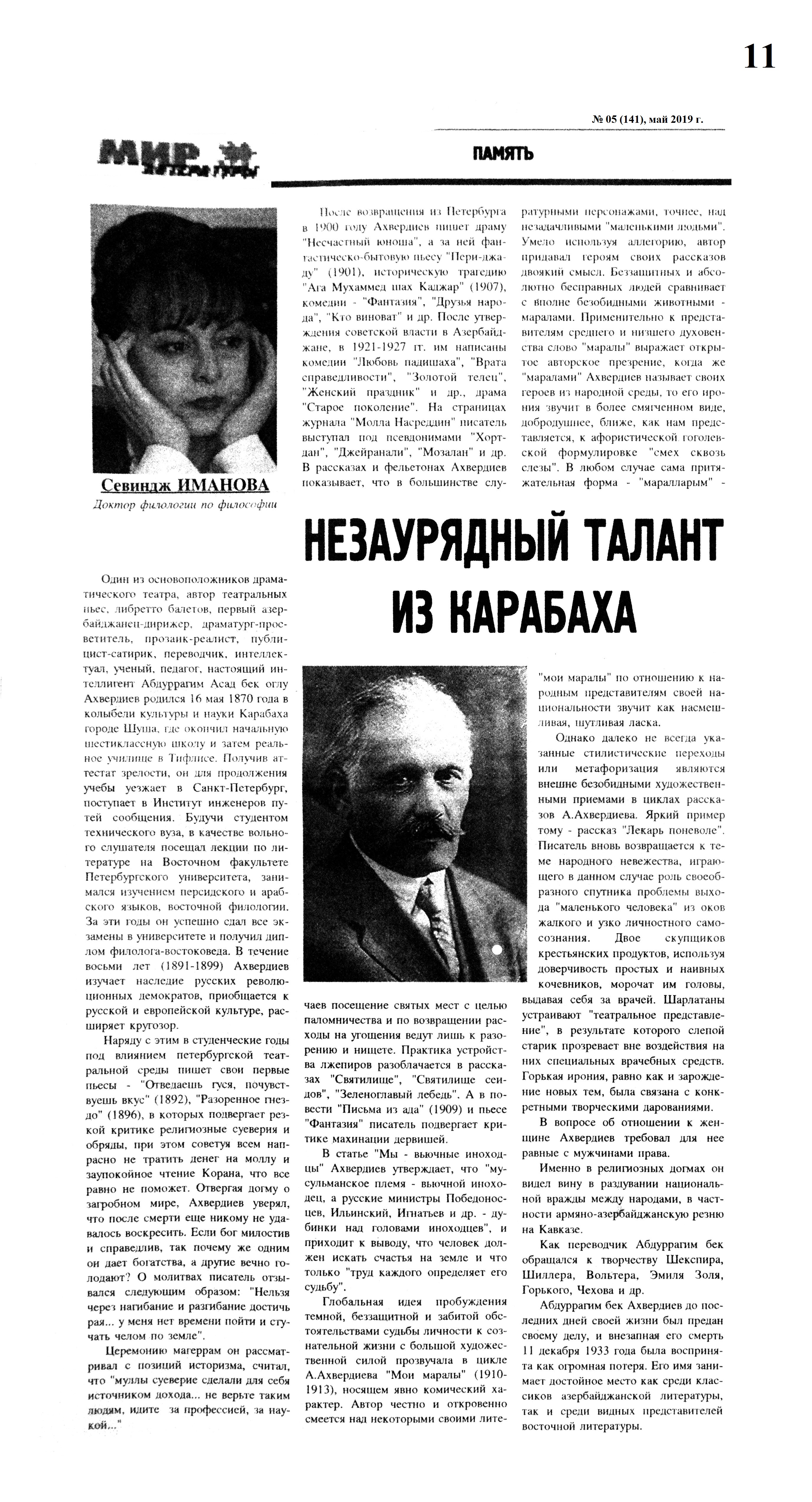 Иманова, Севиндж. Незаурядный талант из Карабаха [Текст] /С.Иманова.- //Мир литературы 2019.- № 05 (141), май. - С.11.