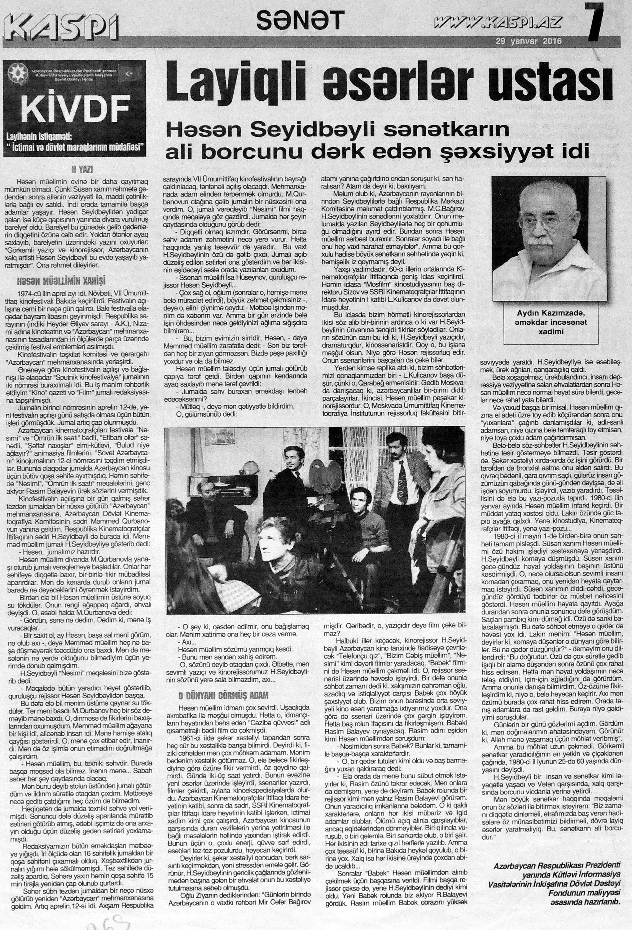 [Mətn] /M.Mükərrəmoğlu //Xalq qəzeti 2014.- 15 yanvar.- S. 6..- Xalq artisti, görkəmli kinorejissor Həsən Seyidbəyli