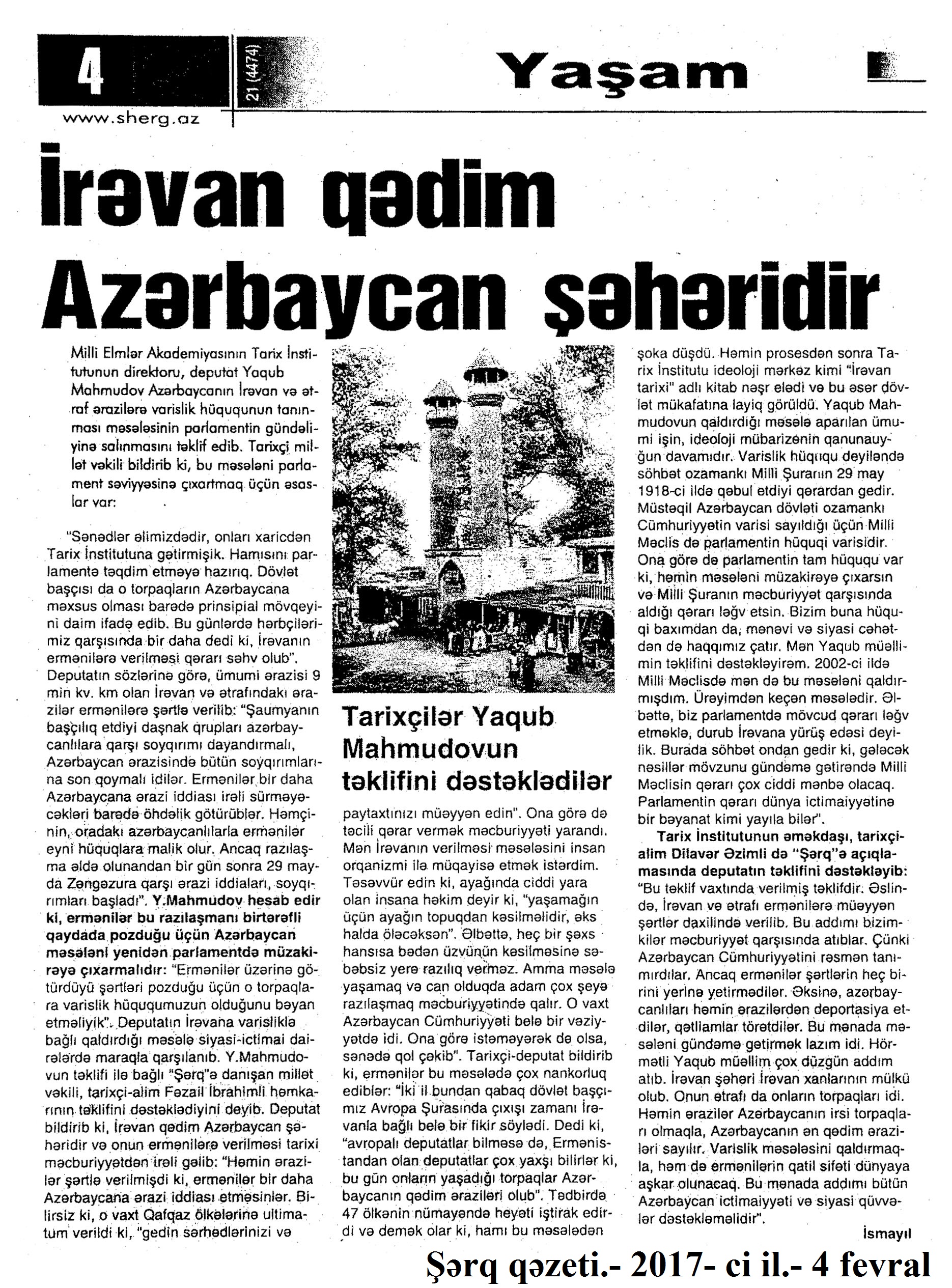 İsmayıl. İrəvan qədim Azərbaycan şəhəridir [Mətn] /İsmayıl//Şərq.-2017. - 4 fevral.- S. 14.