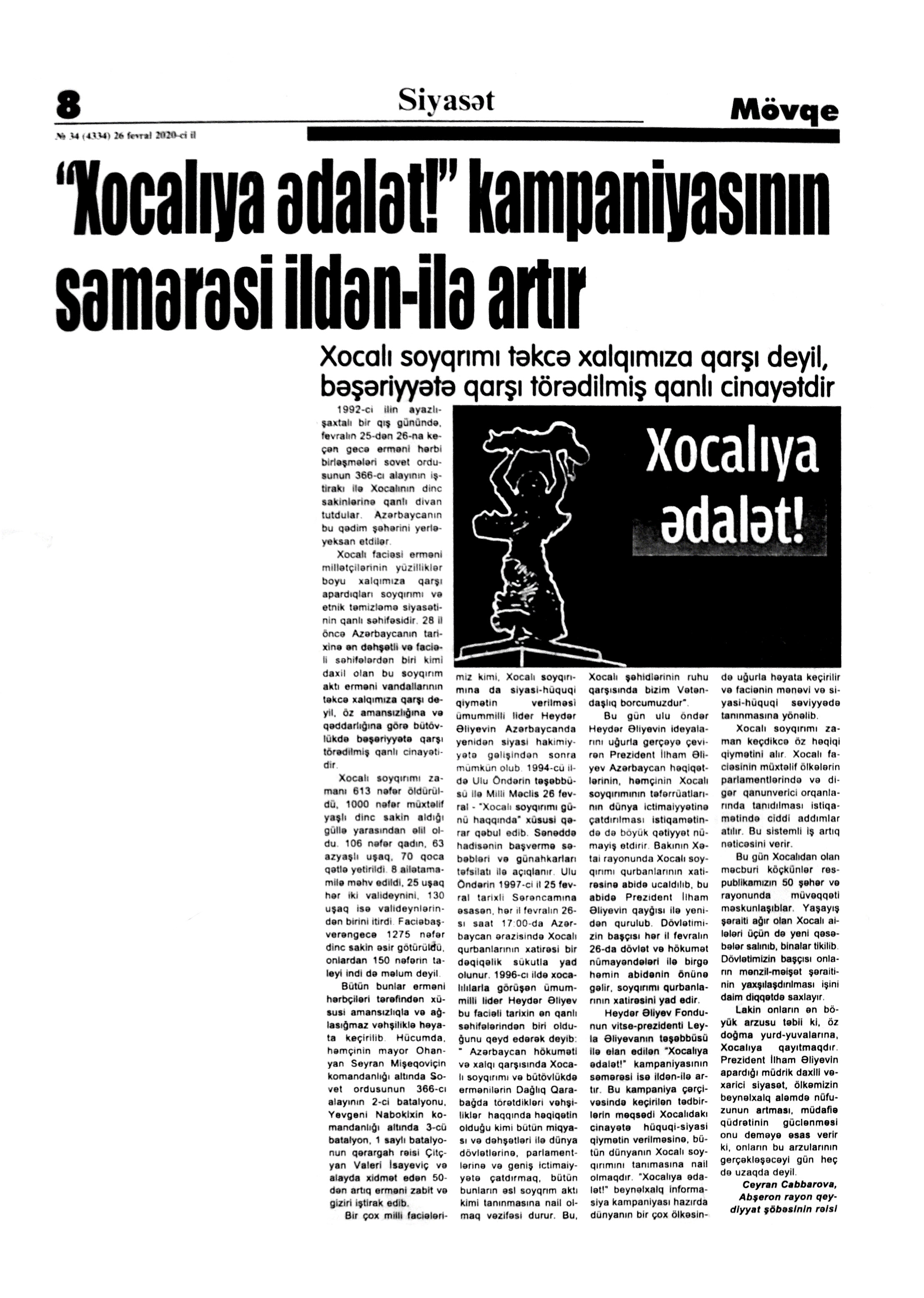 Xocalıya ədalət!!! [Mətn] //Xalq Cəbhəsi 2010.- 26 fevral.- S.14.