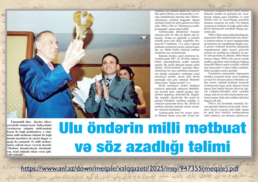 Keçən yüzilliyin sonlarında xalqın tələbi ilə yenidən hakimiyyətə qayıdan Ümummilli Lider Heydər Əliyevin rəhbərliyi ilə həyata keçirilən islahatlar ölkəmizdə söz və məlumat azadlığının, fikir plüralizminin və digər demokratik dəyərlərin bərqərar olması üçün etibarlı zəmin yaratdı. Heydər Əliyev medianın inkişafını prioritet vəzifələrdən biri hesab etmiş, onun fəaliyyətini tənzimləyən qanunvericilik bazasının formalaşdırılması, inkişafını əngəlləyən süni maneələrin aradan qaldırılması, maddi-texniki bazasının möhkəmləndirilməsi istiqamətində ardıcıl qərarlar qəbul etmiş, dövlət-media münasibətlərində mütərəqqi ənənələrin əsasını qoymuşdur.