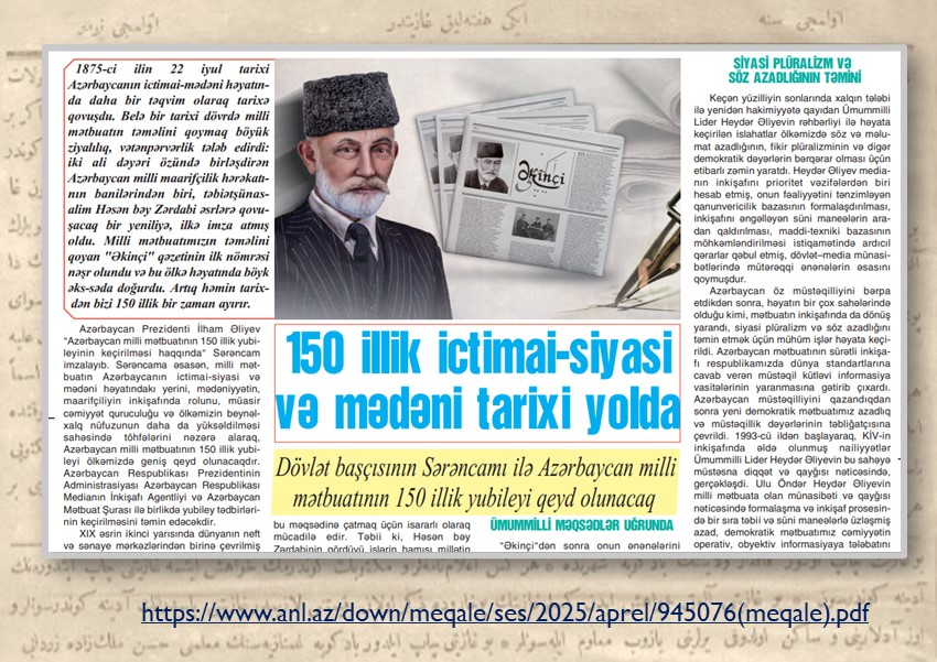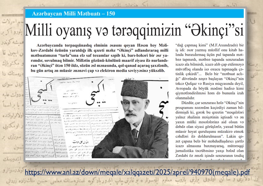 XIX əsrin ikinci yarısında dünyanın neft və sənaye mərkəzlərindən birinə çevrilmiş və iqtisadi yüksəliş dövrünü yaşayan Azərbaycanın ictimai-siyasi və mədəni həyatında əsaslı dəyişikliklər baş vermiş, maarifçilik hərəkatı genişlənməyə başlamış, milli mətbuatın yaranması zərurəti meydana çıxmışdı. Məhz buna görə də 150 il əvvəl - 1875-ci il iyulun 22-də görkəmli ziyalı, təbiətşünas alim və maarifçi-publisist Həsən bəy Zərdabinin Azərbaycan dilində nəşr etdirdiyi "Əkinçi" qəzeti milli mətbuatımızın ilk nümunəsi və ölkəmizin həyatında mühüm hadisə kimi tarixə düşmüşdür. Cəmi iki il fəaliyyət göstərən qəzet maarifçi ideyaların carçısı olmuş, cəhalətə və xurafata qarşı kəskin məqalələr dərc etmiş, milli özünüdərkin, ictimai, siyasi və bədii fikrin inkişafına, mütərəqqi jurnalist nəslinin yetişməsinə önəmli töhfə vermişdir.