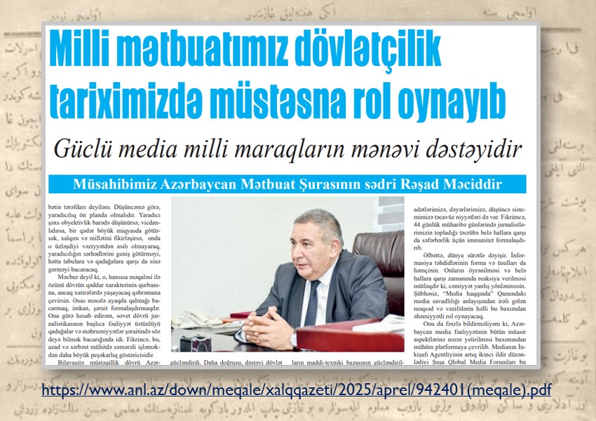 Bu gün mediamız Azərbaycanın tərəqqisinin və müasir cəmiyyət quruculuğu prosesinin fəal iştirakçısı olaraq, beynəlxalq əlaqələrini və qlobal informasiya məkanında təsir imkanlarını genişləndirmiş, rəqabət qabiliyyətini artırmışdır. Lakin dünya nizamının dəyişikliklərə məruz qaldığı, siyasi proseslərin intensivləşdiyi, habelə yeni fəaliyyət prinsiplərinin bərqərar olduğu müasir dövr Azərbaycan mediası qarşısında da yeni vəzifələr müəyyənləşdirir. Qabaqcıl texnologiyaların tətbiqi, sosial media platformalarında fəallığın artırılması, rəqəmsallaşma, süni intellekt, media savadlılığının yüksəldilməsi, dezinformasiya və saxta xəbərlərlə mübarizə, effektiv kommunikasiyanın həyata keçirilməsində yaxından iştirak və s. mediamızın inkişaf perspektivini və qarşıdan gələn dövrdə qlobal informasiya məkanında yerini müəyyənləşdirəcək məsələlərdir. Eyni zamanda media müasir tendensiyaları nəzərə almaqla Azərbaycanın dövlət maraqlarını həmişə uca tutmalı, ölkəmizin müasir beynəlxalq münasibətlər sistemində yeri və rolu, həyatımızda baş verən pozitiv dəyişikliklər ilə bağlı ictimaiyyətimizin məlumatlandırılması sahəsində daha fəal olmalıdır.